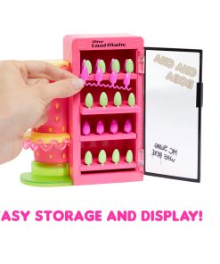 Help run the flavorful fruit shop with Pinky Pops and unbox amazing surprises inside, where you can make your own fruit pops and serve fruit smoothies! First, open the mini fridge and reveal 24 neon-colored nails that look like fruit pops and can be placed on UR own nails and decorated! Look closely at the nails to explore cute fruit-themed details including strawberries, lime slices, and more!