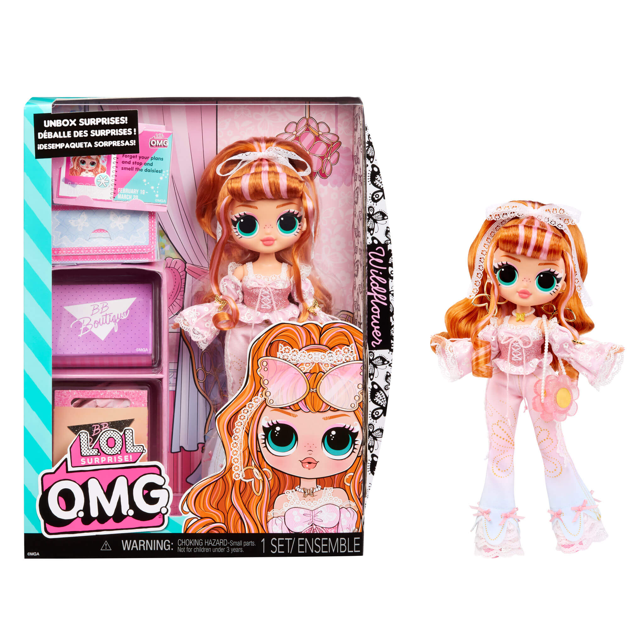 Introducing the all-new LOL Surprise OMG fashion doll Wildflower with multiple surprises! Wildflower never fails to express her love for butterflies, flowers, and the color pink, especially through her fashions and accessories.