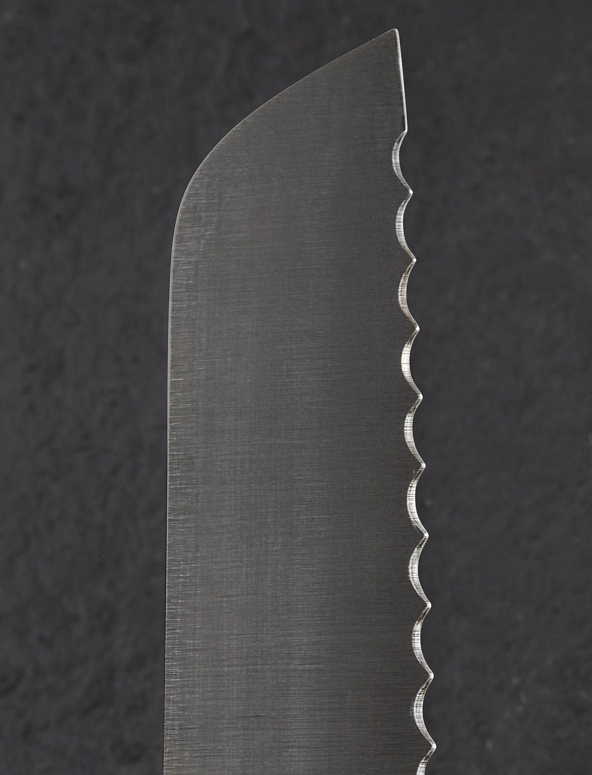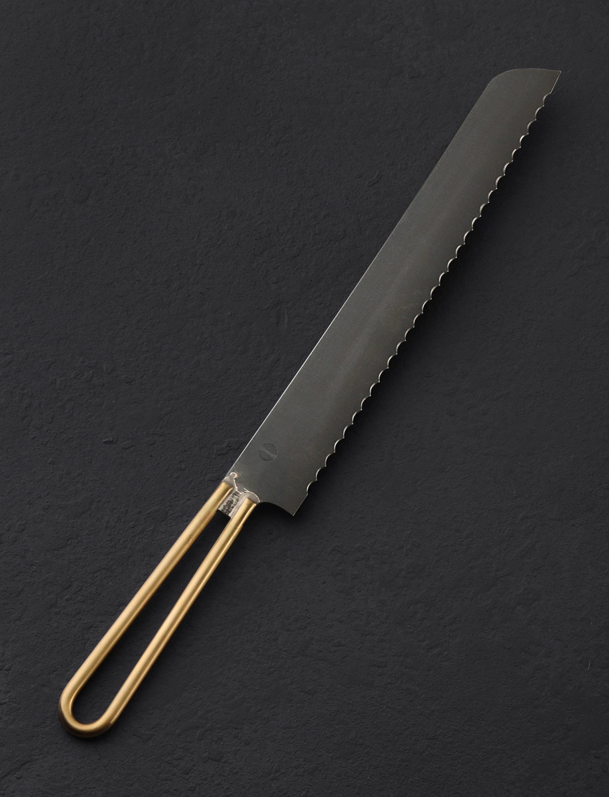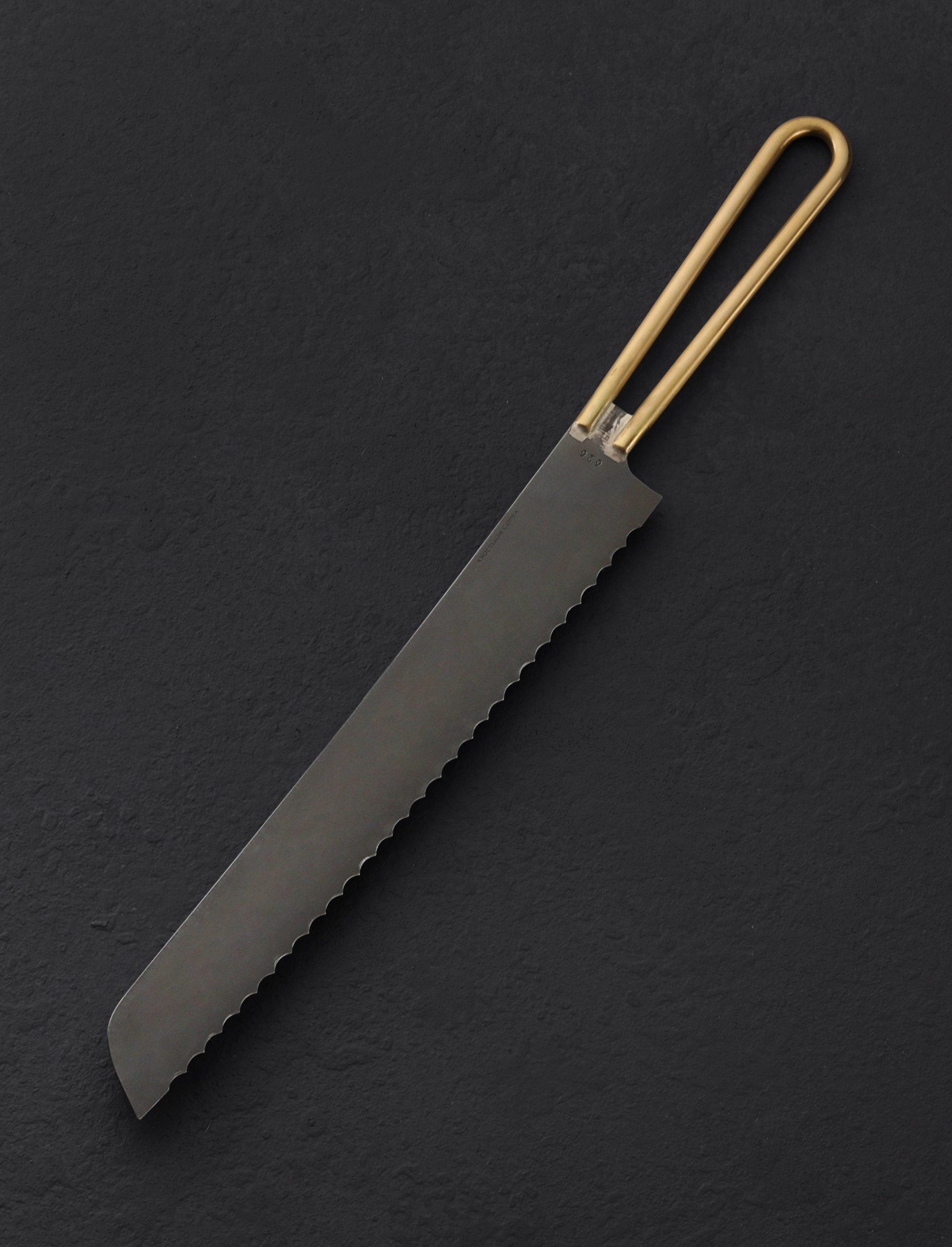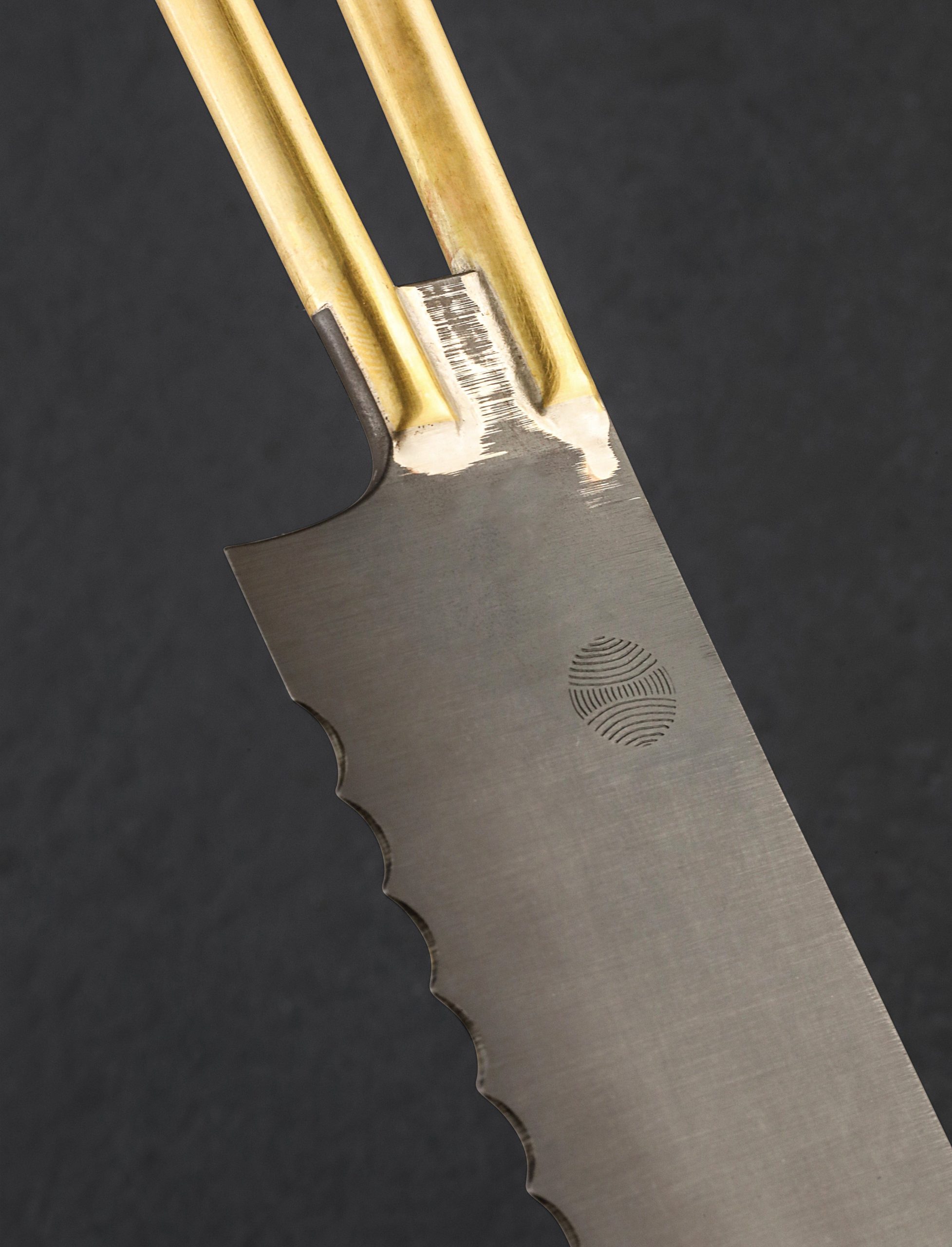 Perhaps the most unique offering from our Living Steel 626 collection, and certainly one of the most useful and utilitarian knives in the kitchen, is this striking serrated bread knife. Handmade in Gothenburg, Sweden by Andersson Copra from Swedish high carbon steel, the finely tuned, hand-sculpted serrated blade is razor sharp, perfect for the bakery owner and home bread lover alike. This elegant tool’s stand-out feature is the polished brass handle that lends comfort and control whether slicing baguette, sourdough, or the sandwich de jour.