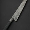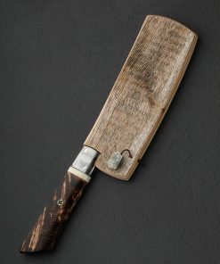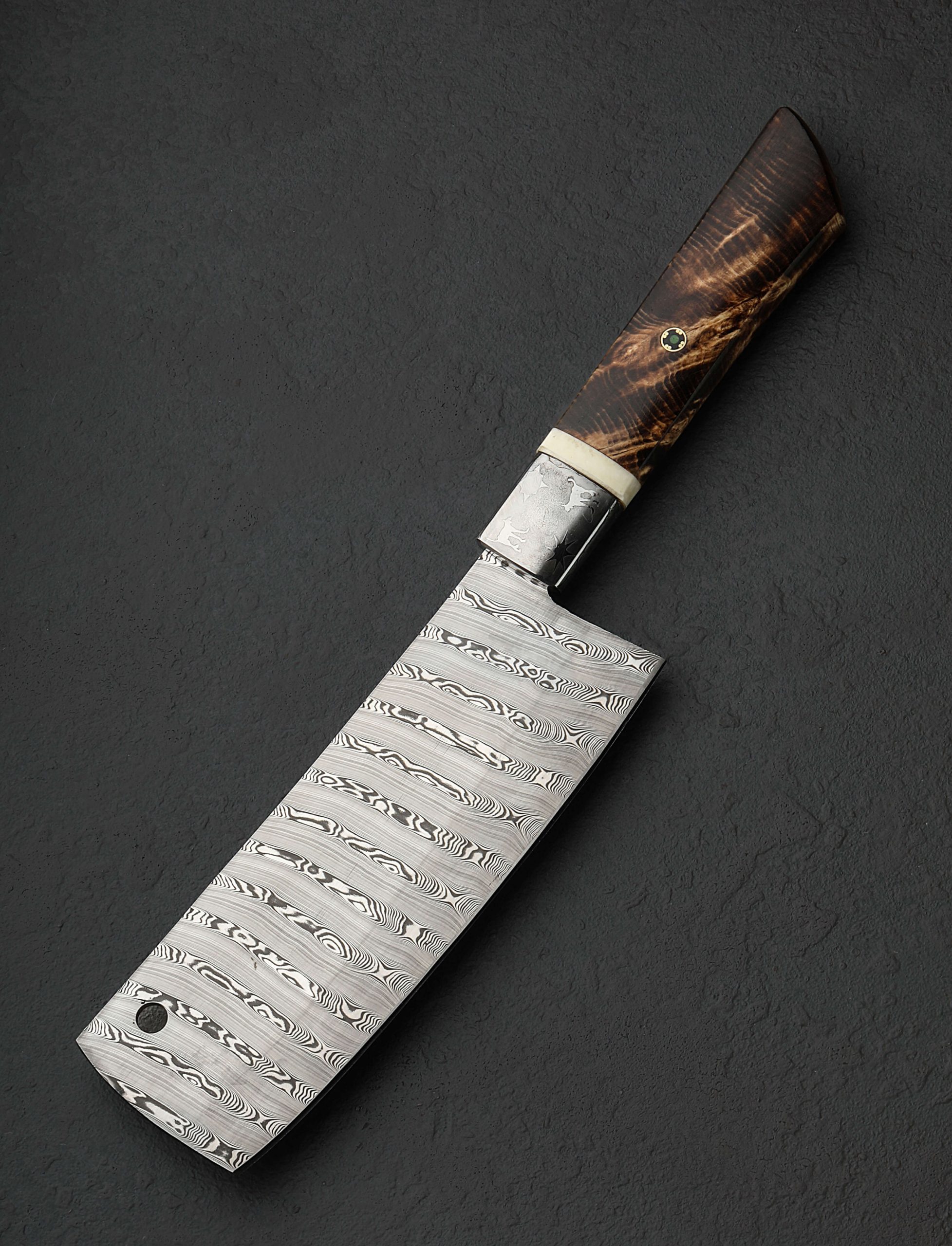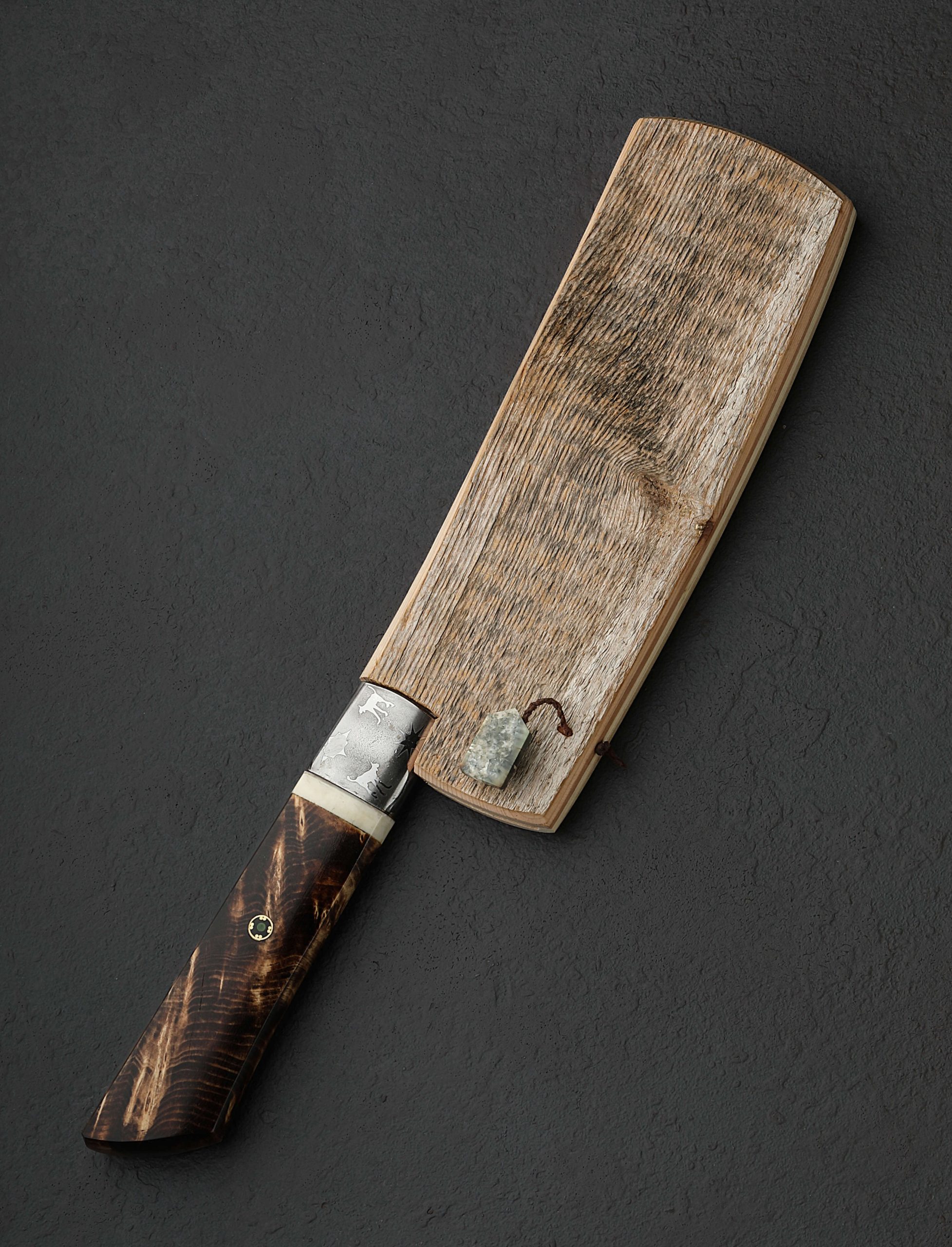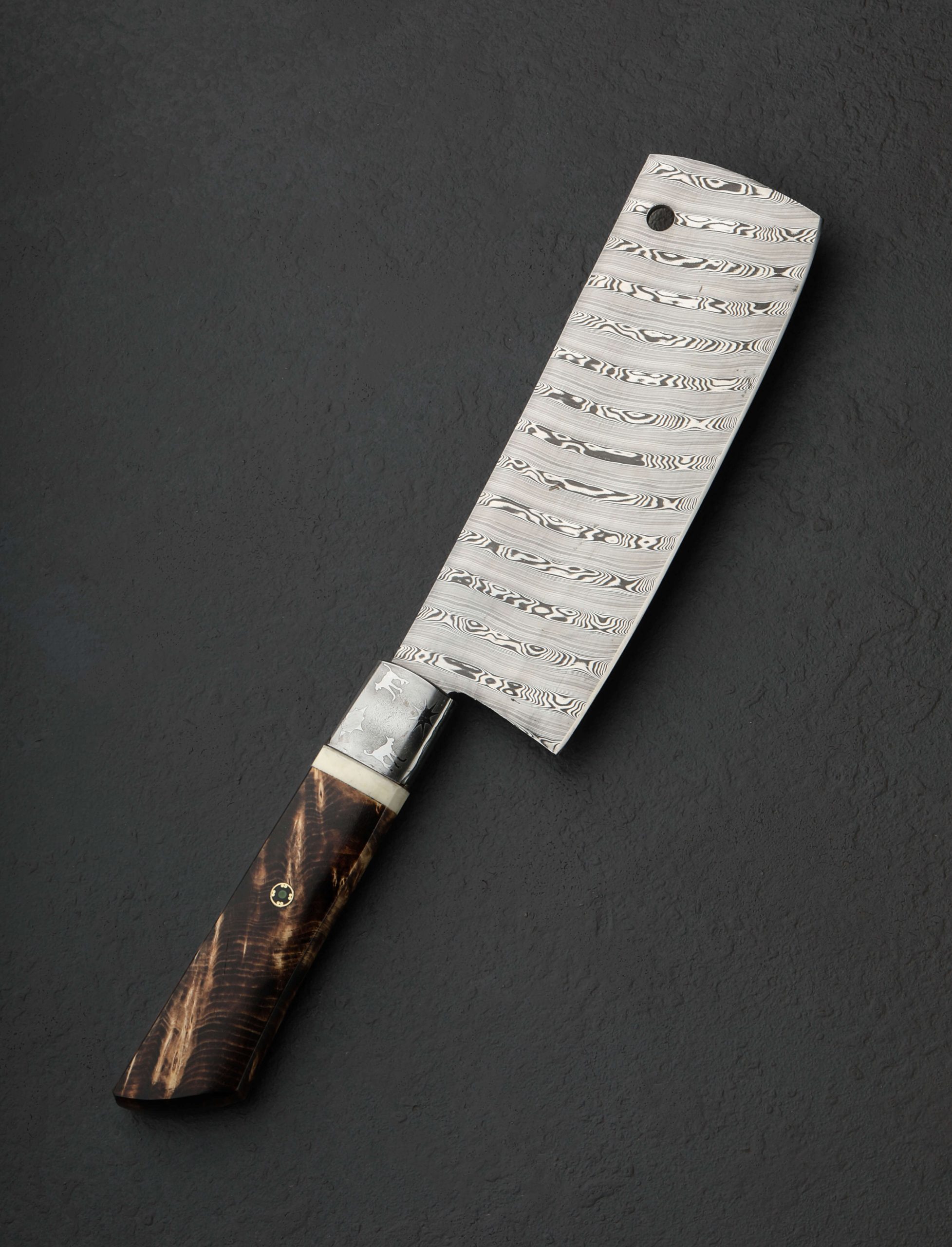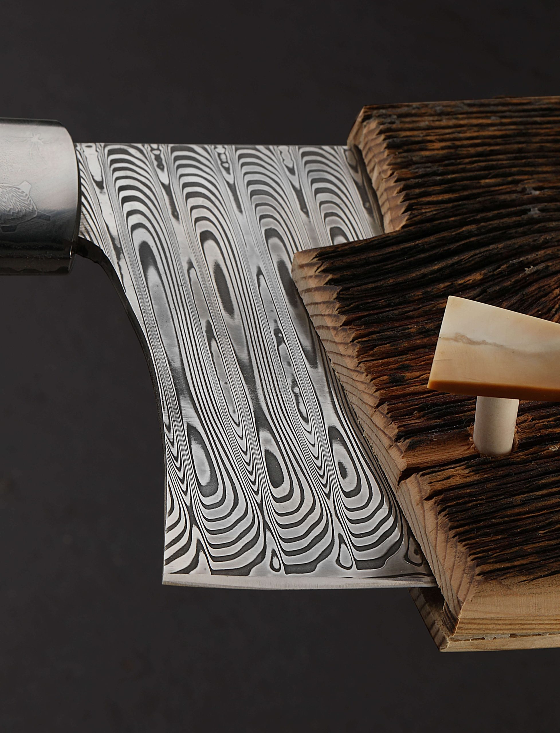 Weight, balance, and power forge a tactile experience to savor. Maker Torbjörn “Tobbe” Lundström begins this mid-size ‘small game’ cleaver with wide-stock Damasteel stainless damascus steel for a blade that offers both the strength and heft for tough cuts and at the same time a thin, very sharp edge for efficient vegetable chopping, and even slicing work. A classic butcher’s cleaver hanging hole at the end of the blade delivers utility and a touch of nostalgia, matched nicely to the blade’s profile. The handle, as artful and utile, is shaped from spruce burl secured by a single mosaic pin, fitted to a ring of fossilized mammoth tooth, and finally, capped with incredible lynx mosaic damascus bolsters hand forged in Sweden’s north by Mastersmith Mattias Styrefors. As expected of a Tobbe Lundström creation, a saya is included made of reclaimed barn siding with a mammoth tooth pin.