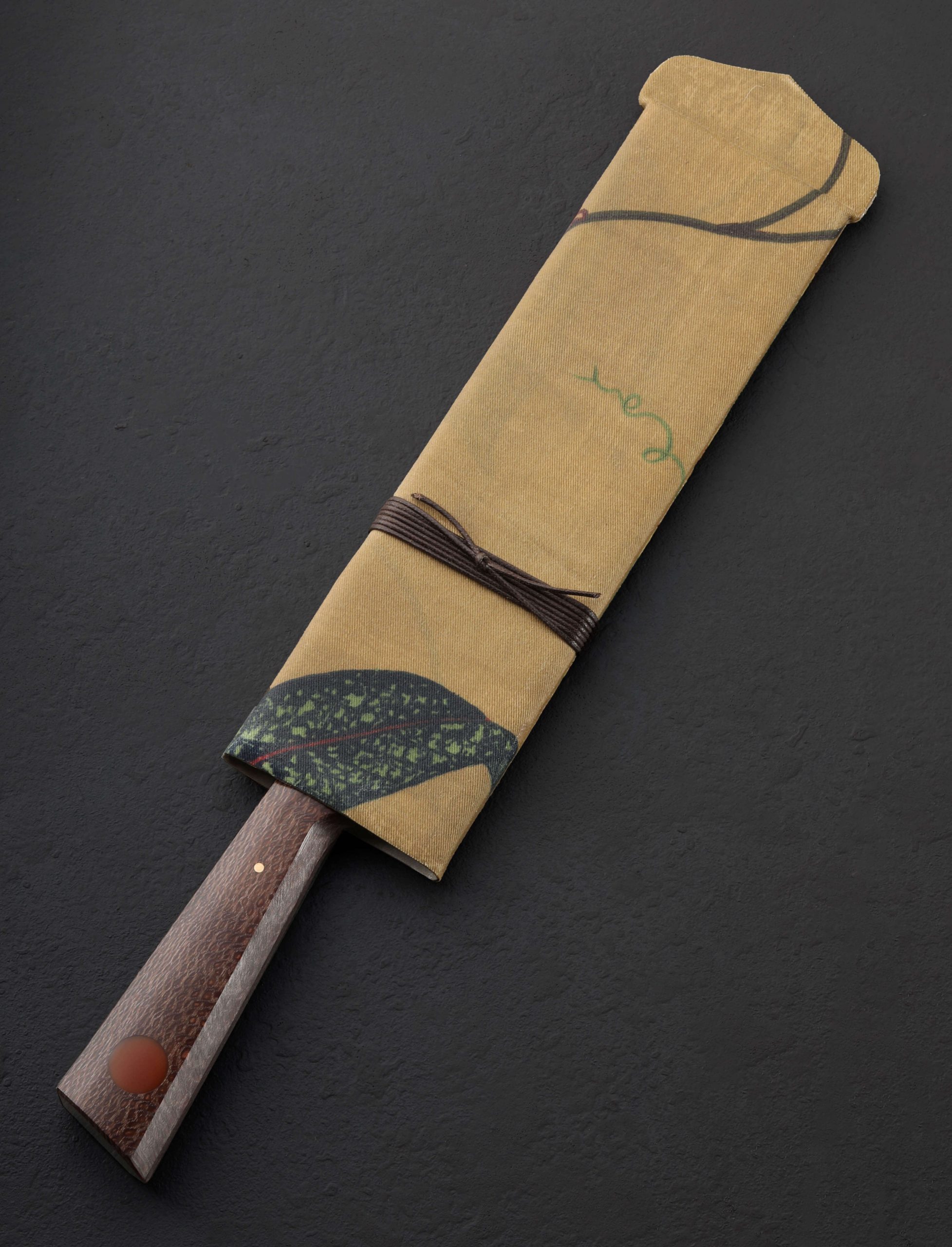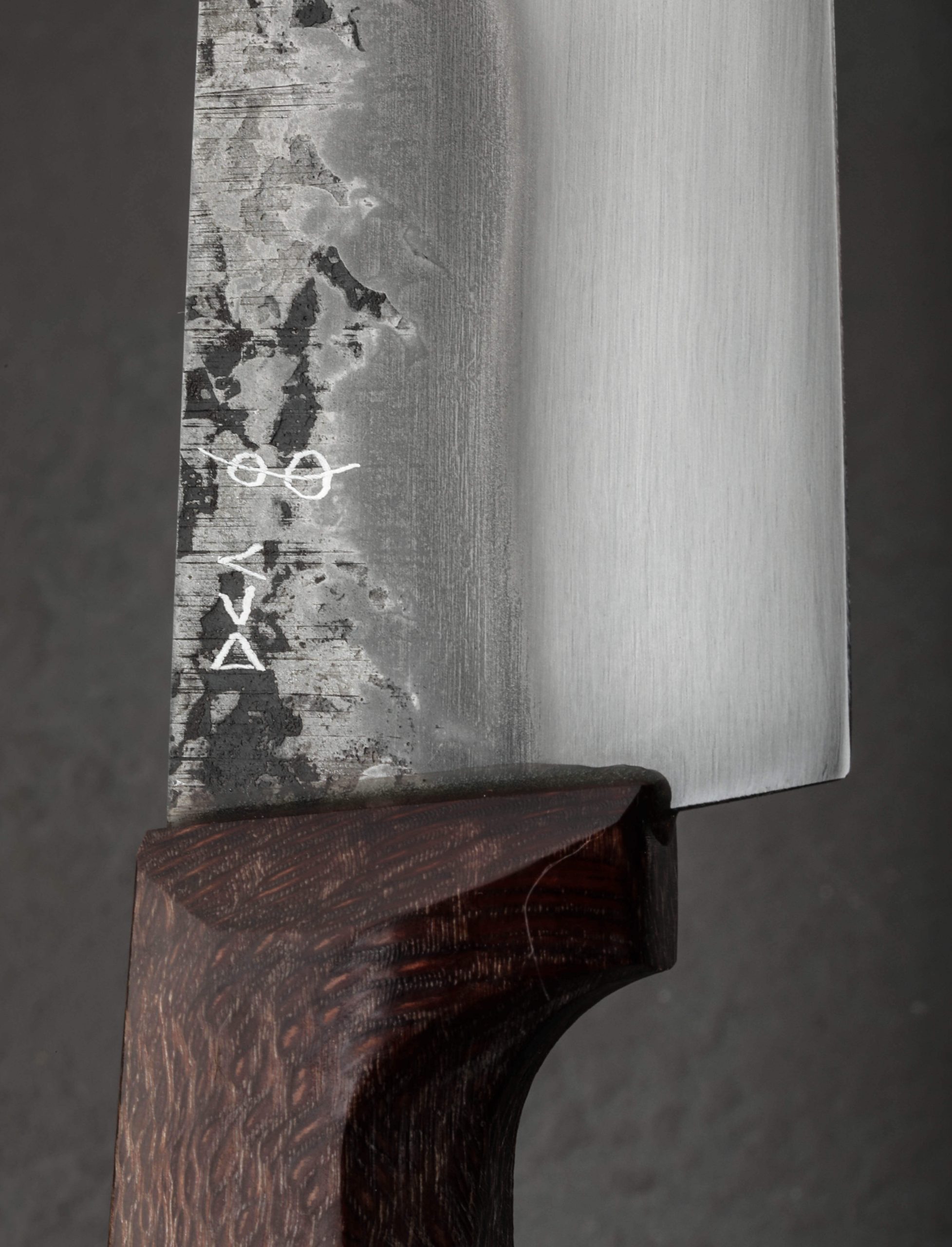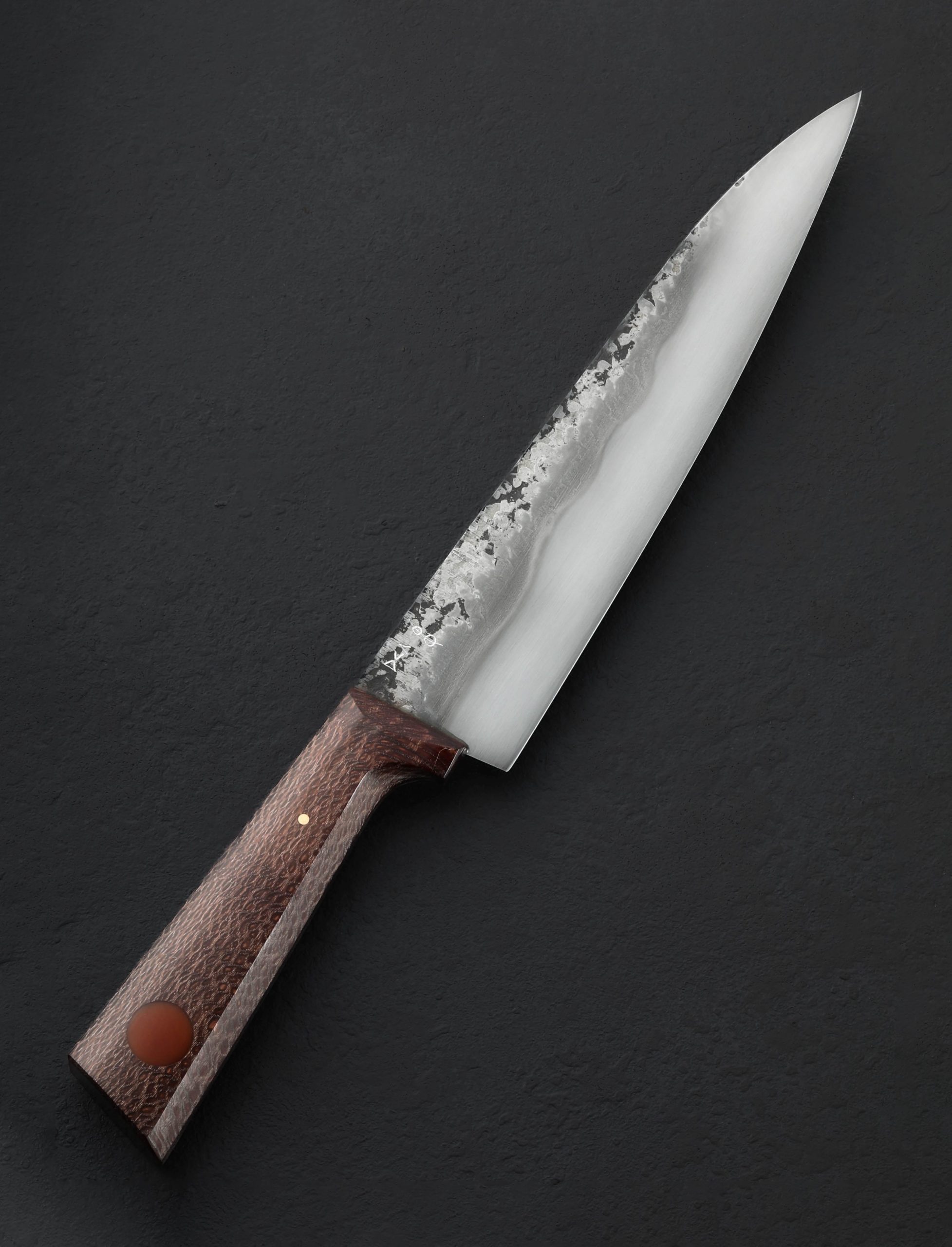 In breathtaking style, Don Carlos Andrade creates a new Alsace inspired chef knife with a gyuto-esque blade profile forged by hand at his California studio from 1075 carbon steel. A kitchen workhorse with the natural beauty of a thoroughbred, Don forges the blade to shape, delivers his trademark convex geometry throughout the bevels, hardens the steel with a clay-induced differential heat treatment, and then reveals the resulting quench line with the stunning etch and polish he is known for. Forge-finished flats display the knife’s hand-hewn origins with hammer marks visible and a touch of scale from the forging process left intact. Weighted, sturdy, and powerful in the hand, the knife balances just as macadamia wood meets steel, offering a 245mm / 9.6″ edge beneath a rigid blade spine that tapers throughout the final inches to an aggressive, pointed tip that sits low at the end of the gyuto-inspired form. Standing 52mm tall the knife rocks nicely on the cutting surface with ample knuckle clearance to complement the profile’s penchant for push-pull cuts and slicing work of all variety. For comfort and control is a striking handle sculpted from macadamia wood, shaped in Don’s well-loved shield, wa style that fills the hands with gentle curves, an ergonomic taper from back to front, and for this one-of-a-kind build, a burnt orange inlay. A custom cloth-covered saya is included.