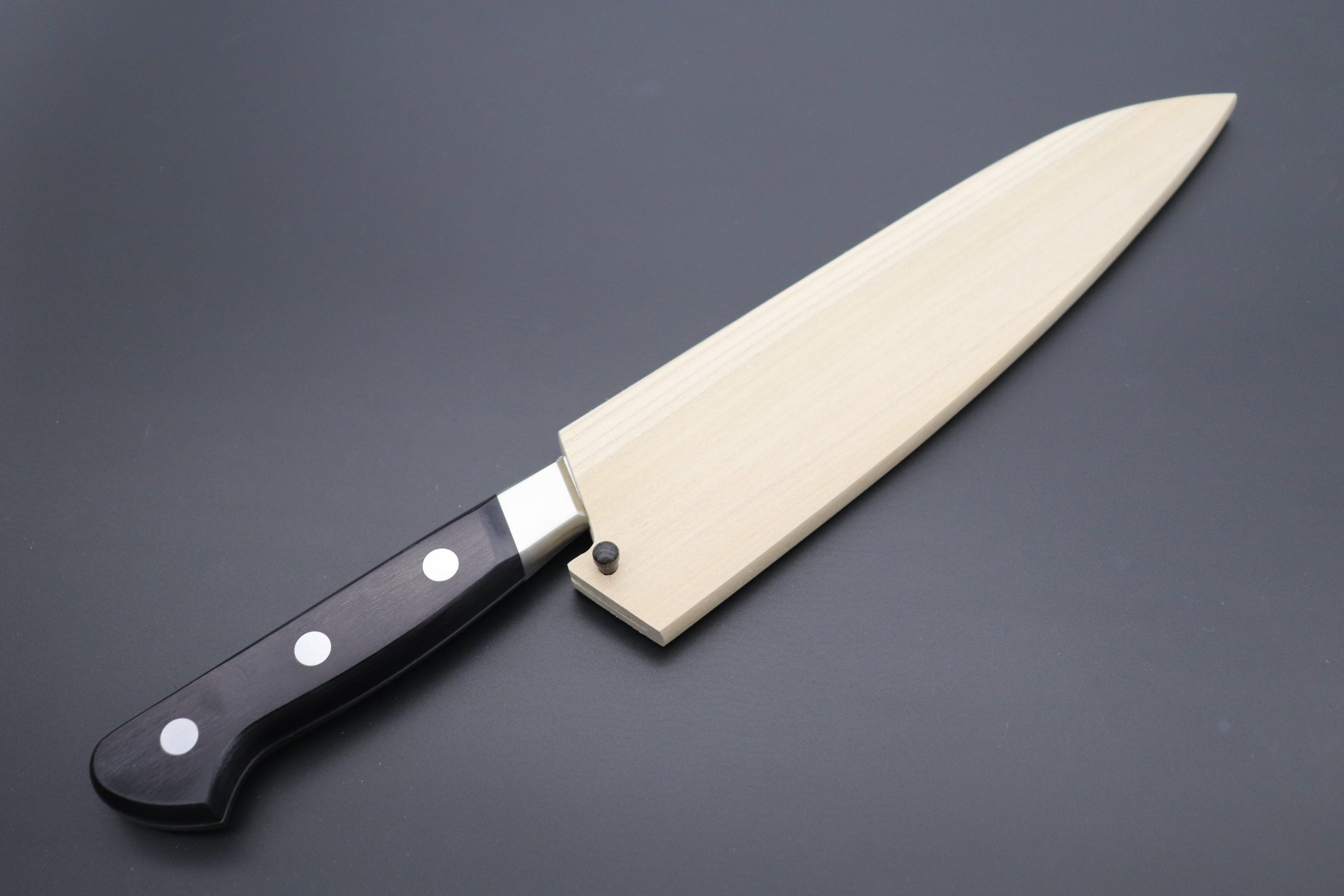The Misono UX10 Series knives are one of the highest-quality professional stainless steel kitchen knives on the market and they feature a stylish, well balanced, slanted Nickel Silver bolster. This particular handcrafted Magnolia Wooden Saya has been specially customized to seamlessly fit the and . It offers the best-possible fit for the UX10 Gyuto 210mm and it is therefore the Saya we recommend for the knife.