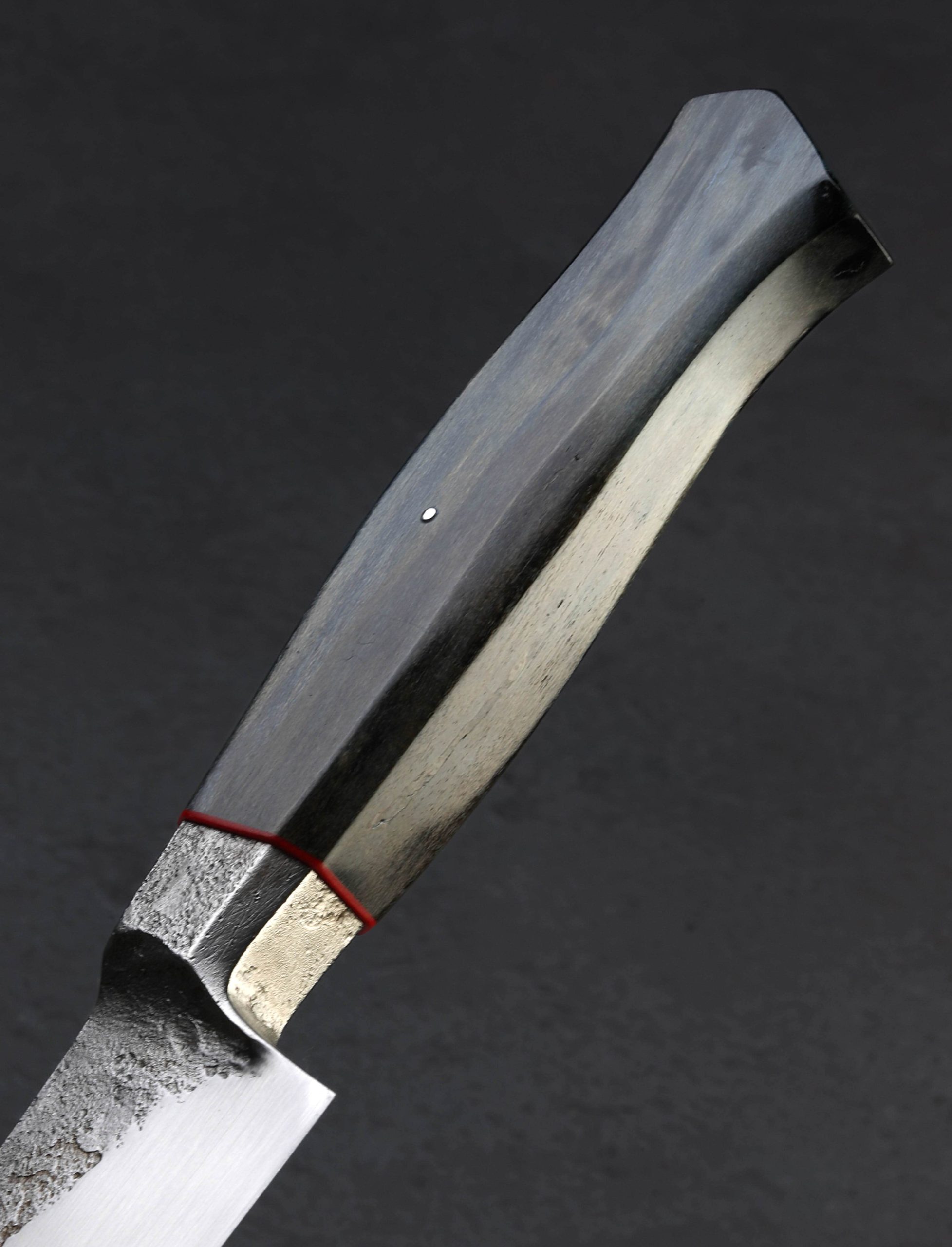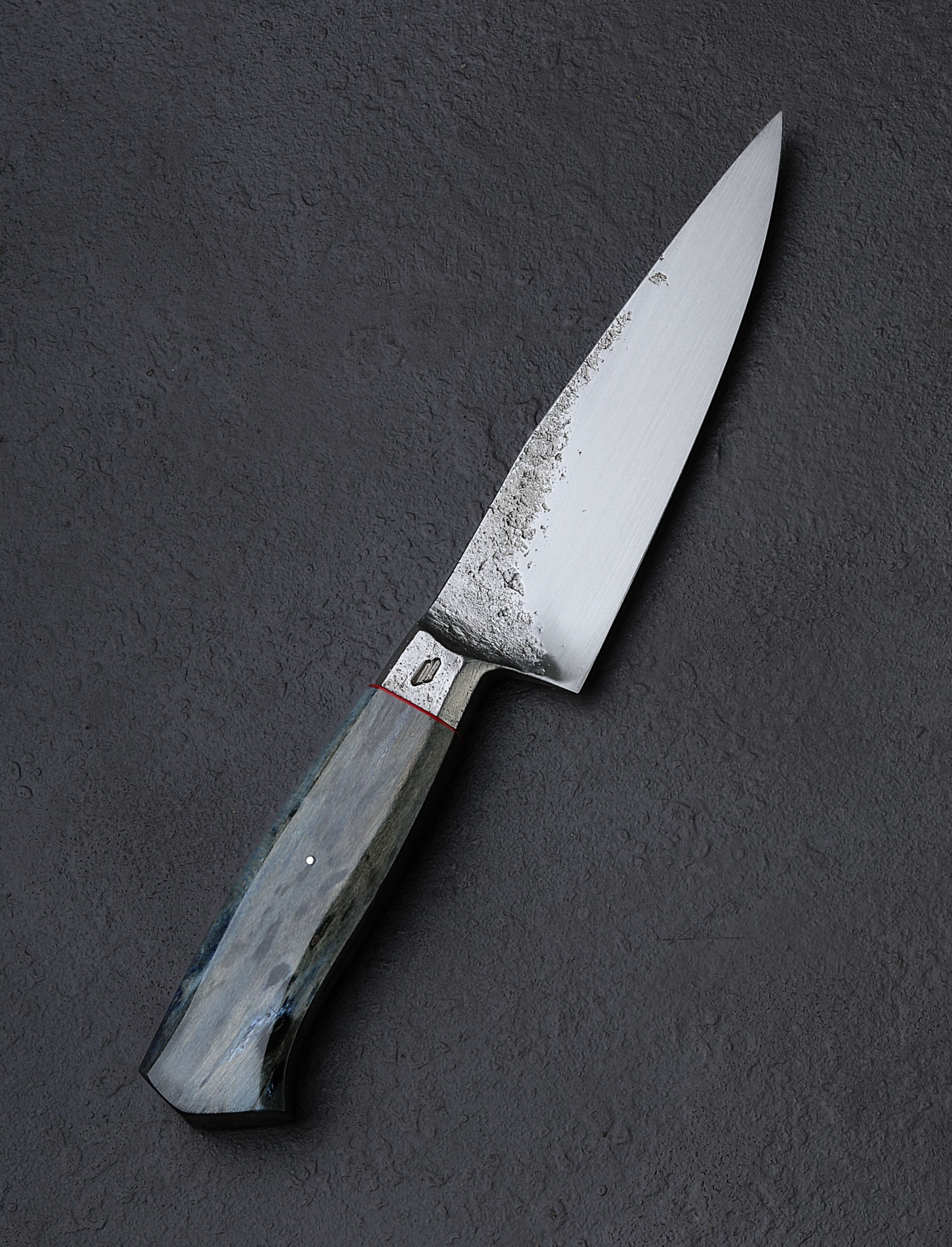 Bladesmith and artist Nick Rossi’s unique style that seamlessly merges function-first profiles and geometry with a bold mix of rustic-meets-modern, gets us every time. As it does with this very handy, 146mm / 5.7″ petty chef knife forged by hand from 52100 high-carbon steel. Nick delivers a tough, sharp, and dynamic edge that sits below convex, workhorse bevels; broad and strong in the rear at the 40mm tall heel, and slimming progressively forward towards a fine, needle-like tip perfect for slicing work. A handsomely shaped integral bolster gives way to the blade’s forge-finished flats that retain the marks of Nick’s hammer blows, while the primary bevels enjoy a silky, hand-sanded satin finish. Beyond the steel bolster with stepped, heirloom fit-up, is first a ring of red G10 for a pop of color as we’re accustomed to seeing from Nick, followed by a beautifully shaped and tinted piece of Maine river drive maple that likely dates to around the early 1800’s. Comfortable, weighted, and steady in the hand, this is one versatile knife for which any chef will find countless uses.