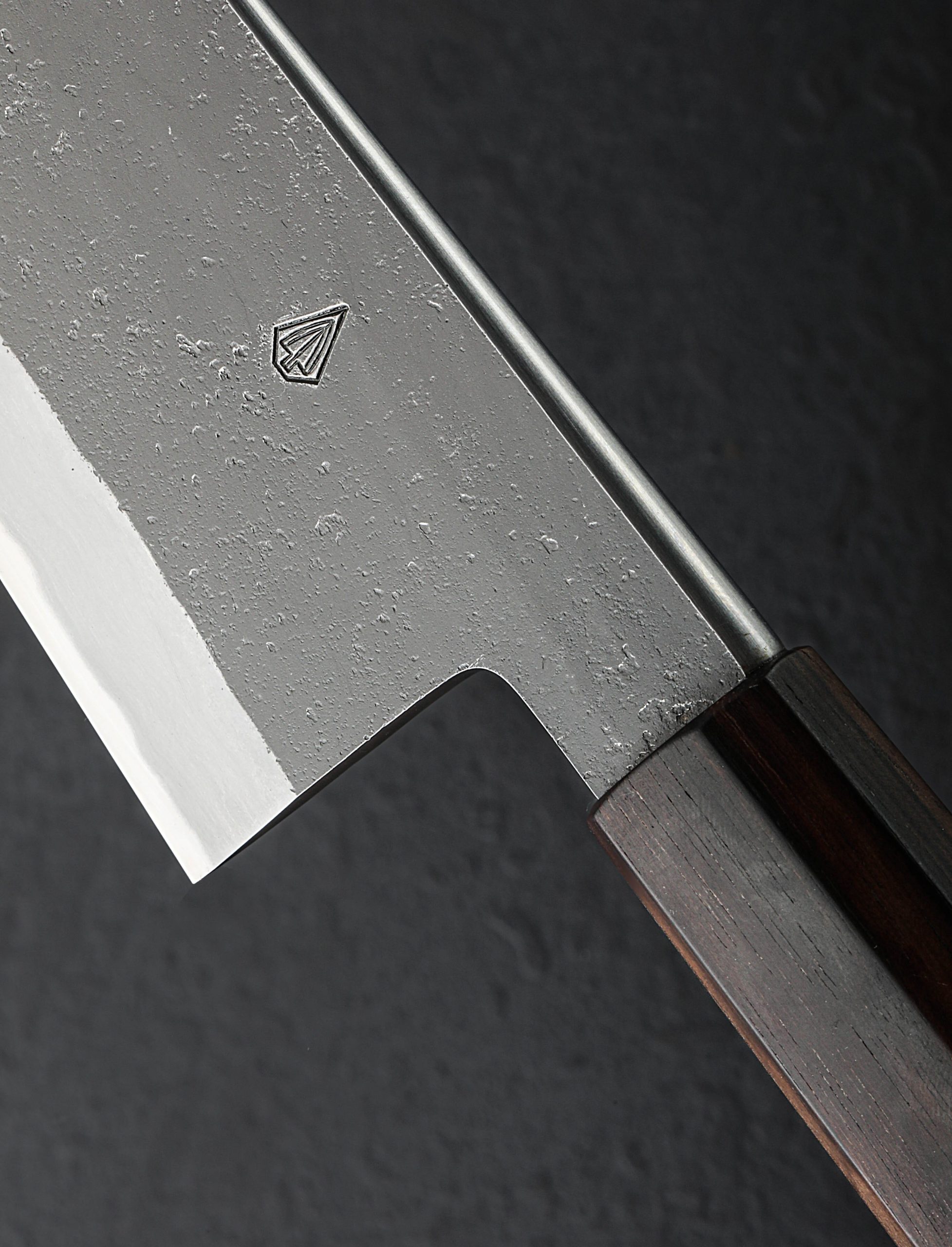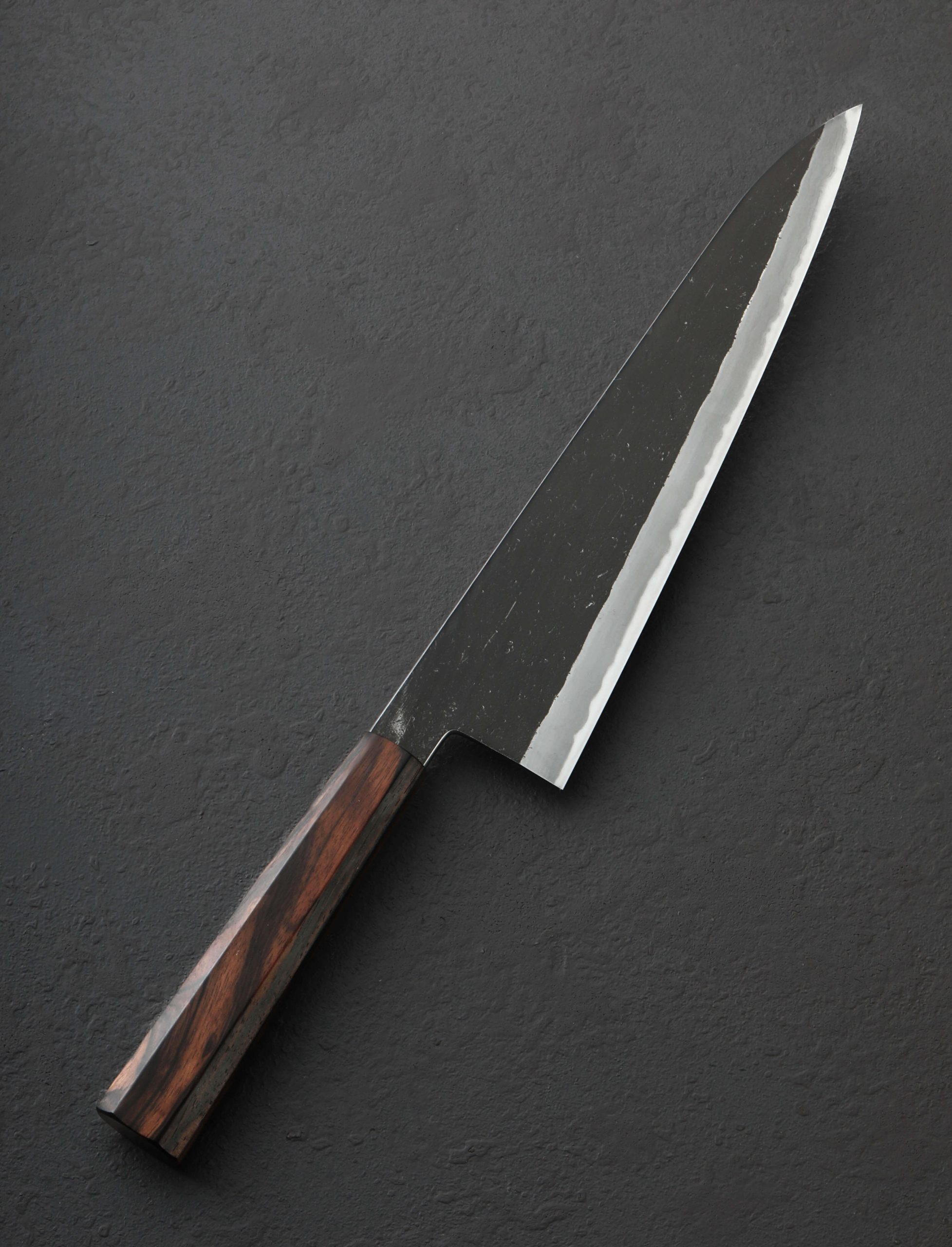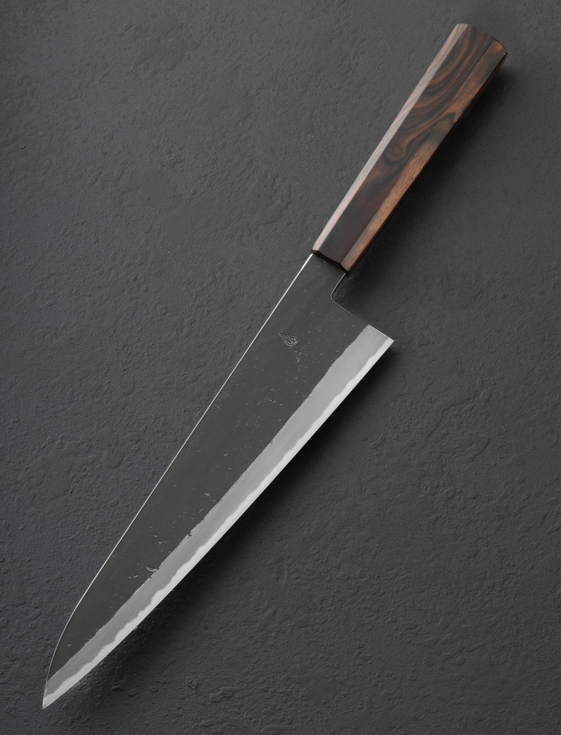 Dressed in Malaysian Ebony sculpted into a classic, octagonal wa style handle comes a 228mm / 9″ gyuto from Yanick Puig. At his studio in France Yanick crafts one-of-a-kind kitchen cutlery in traditional Japanese form from his own house-made san mai steel, quite similar to the blade formulas made in the East for hundreds of years from which Yanick draws his inspiration. In this case, 135Cr3 carbon steel, known for its simple, clean alloying and fine grain structure, is jacketed with cladding of vintage, wrought iron to produce a beautiful, versatile, and hair-popping sharp edge with convex bevels, kasumi finish, and forge-finished flats. The rounded, polished spine tapers steadily to a razor-thin tip for detail work, while the heel stands 55mm tall for all manner of chopping. Balanced, nimble, and quick in the hand, Yanick’s work is second to none.