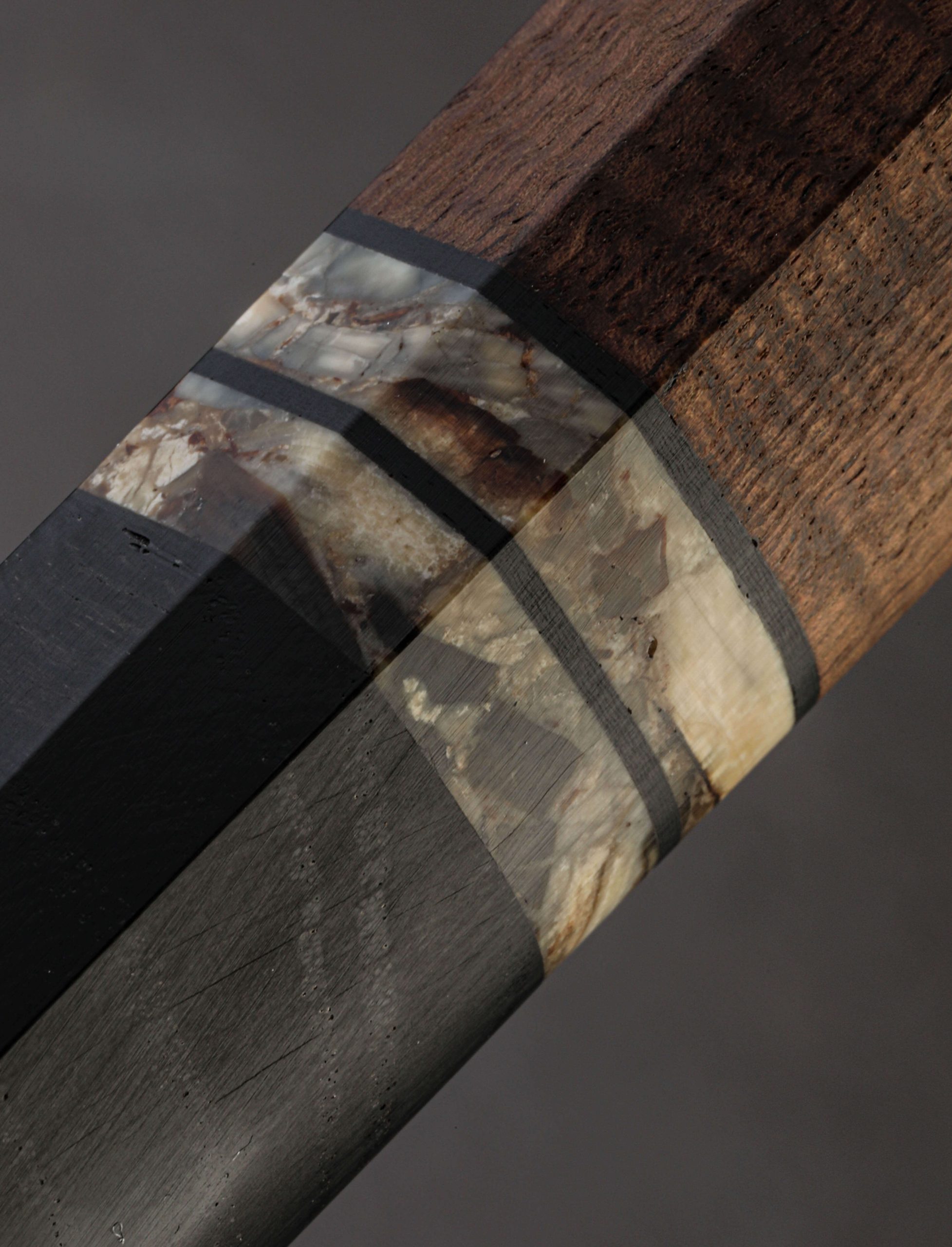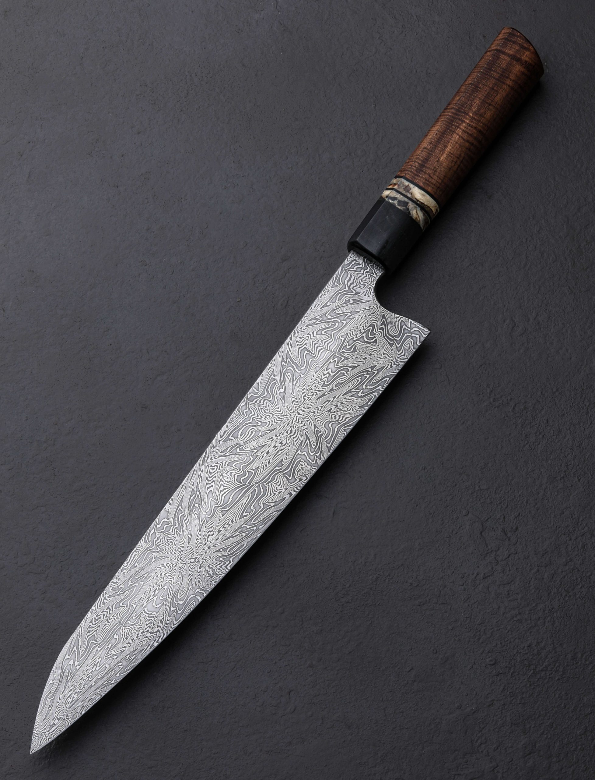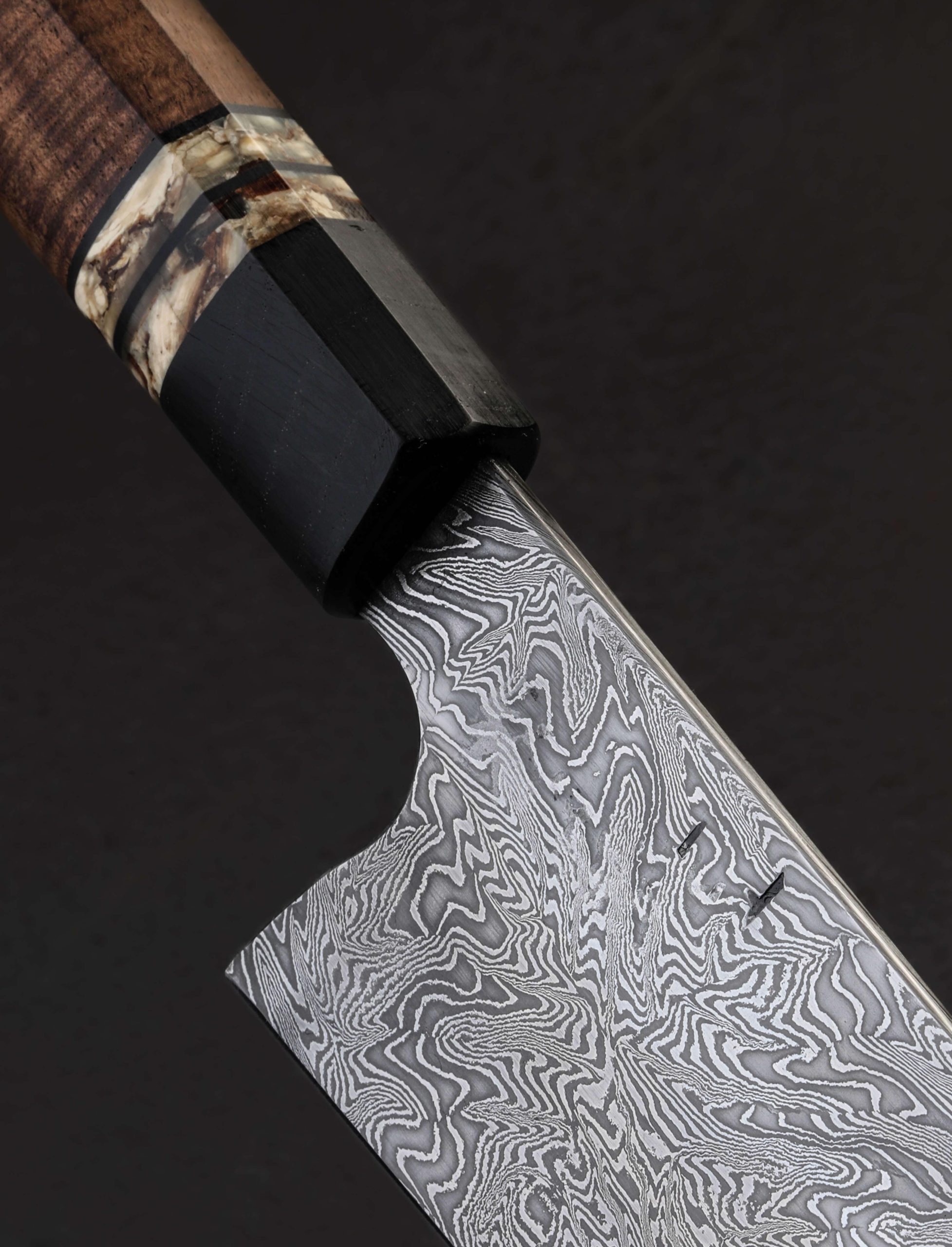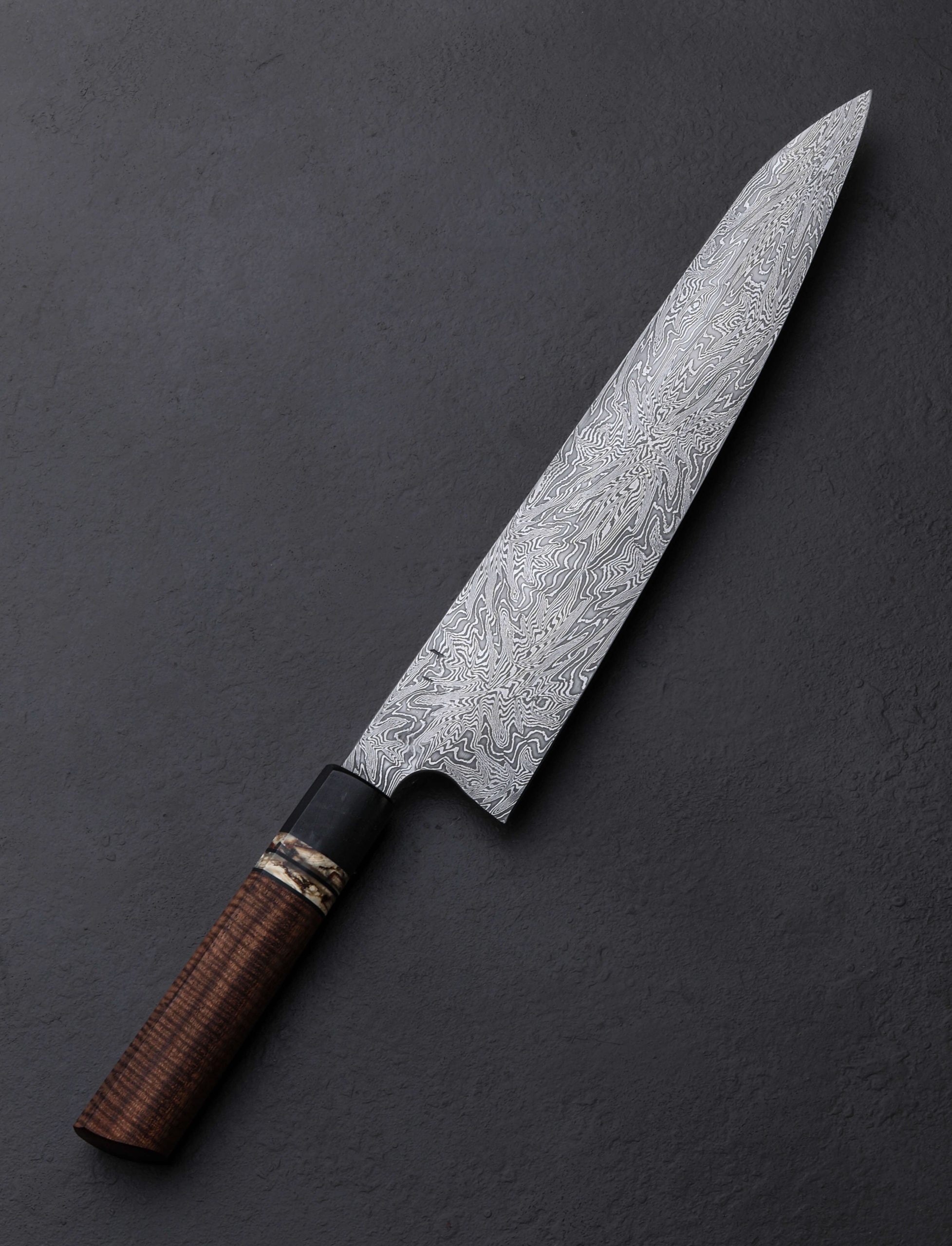From the long, elegant, 267mm blade’s full-distal taper along the rounded spine, to the striking, homemade mosaic damascus steel from which it is hand forged, to the handle’s dual mammoth tooth rings, this Martin Huber chef’s knife is as unique and performance-driven as they come. Designed for the largest, most demanding cuts on down to precise and delicate slices, the blade boasts a very thin, razor-sharp edge beneath medium height, subtly convex bevels that slim steadily forward to an especially slim, needle-like tip. From 3.4mm wide above the choil, the spine measures 2mm at the midpoint, 1mm an inch from the tip, and only 0.65mm one centimeter from the tip before it practically disappears. Stiff and tough in the rear and finely honed in the forward inches, there is little this tool will not accomplish with style and grace. Balancing just over an inch front of the 53mm-tall heel, the knife is steady and natural in the hand with an overall weight of just 7.7oz / 218g. The high-carbon damascus steel that forms the blade is made at Martin’s studio in northern Austria and delights the eyes with an intricate, multi-faceted pattern that repeats, twists, turns, and stretches, providing new details to discover around every corner. Offering comfort and control over the large blade is a handle sculpted from handsome Australian Ringed Gidgee, ancient bog oak, the fossilized mammoth tooth, and black G10, all in Martin’s symmetrical, shield-style, wa handle.