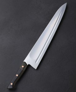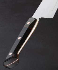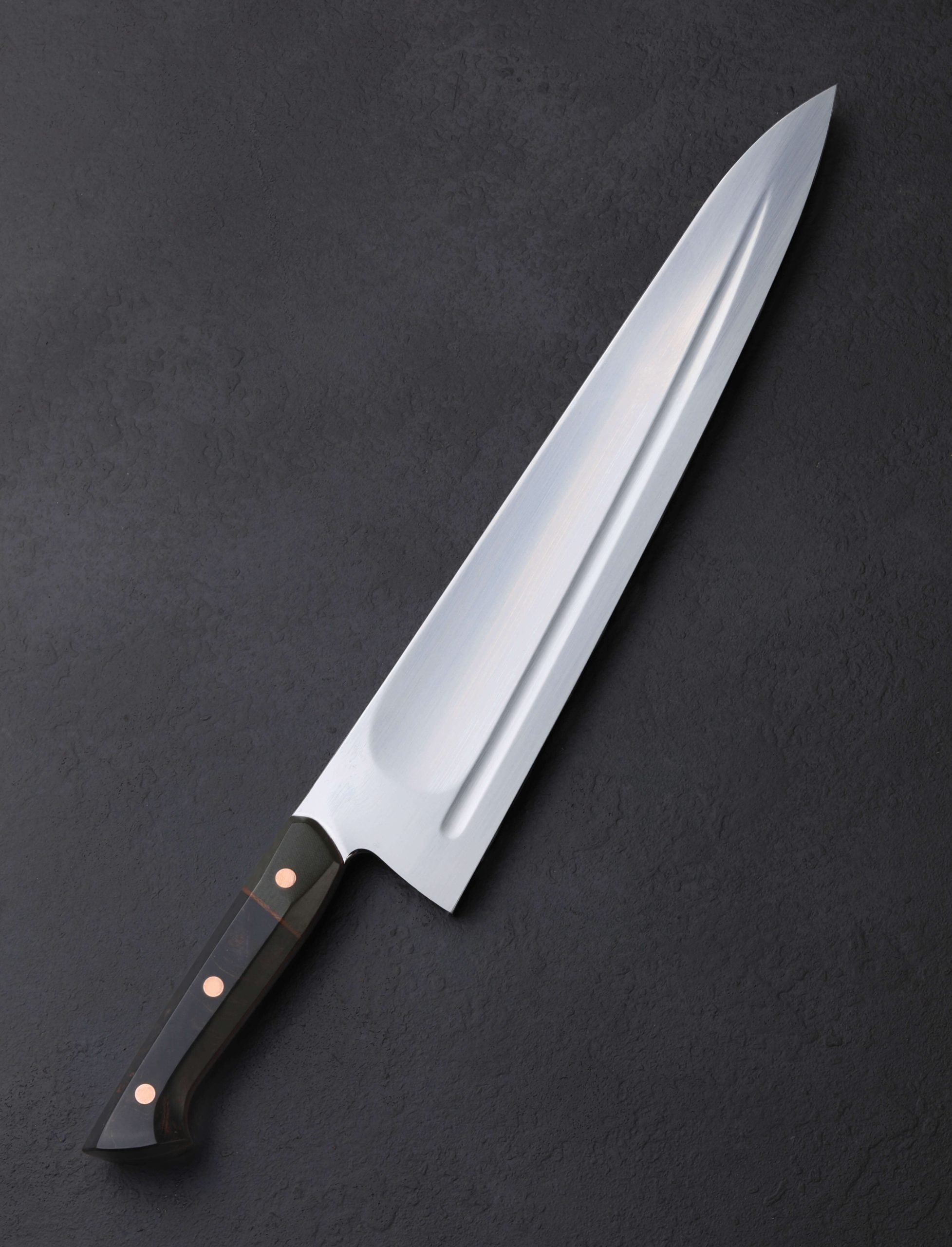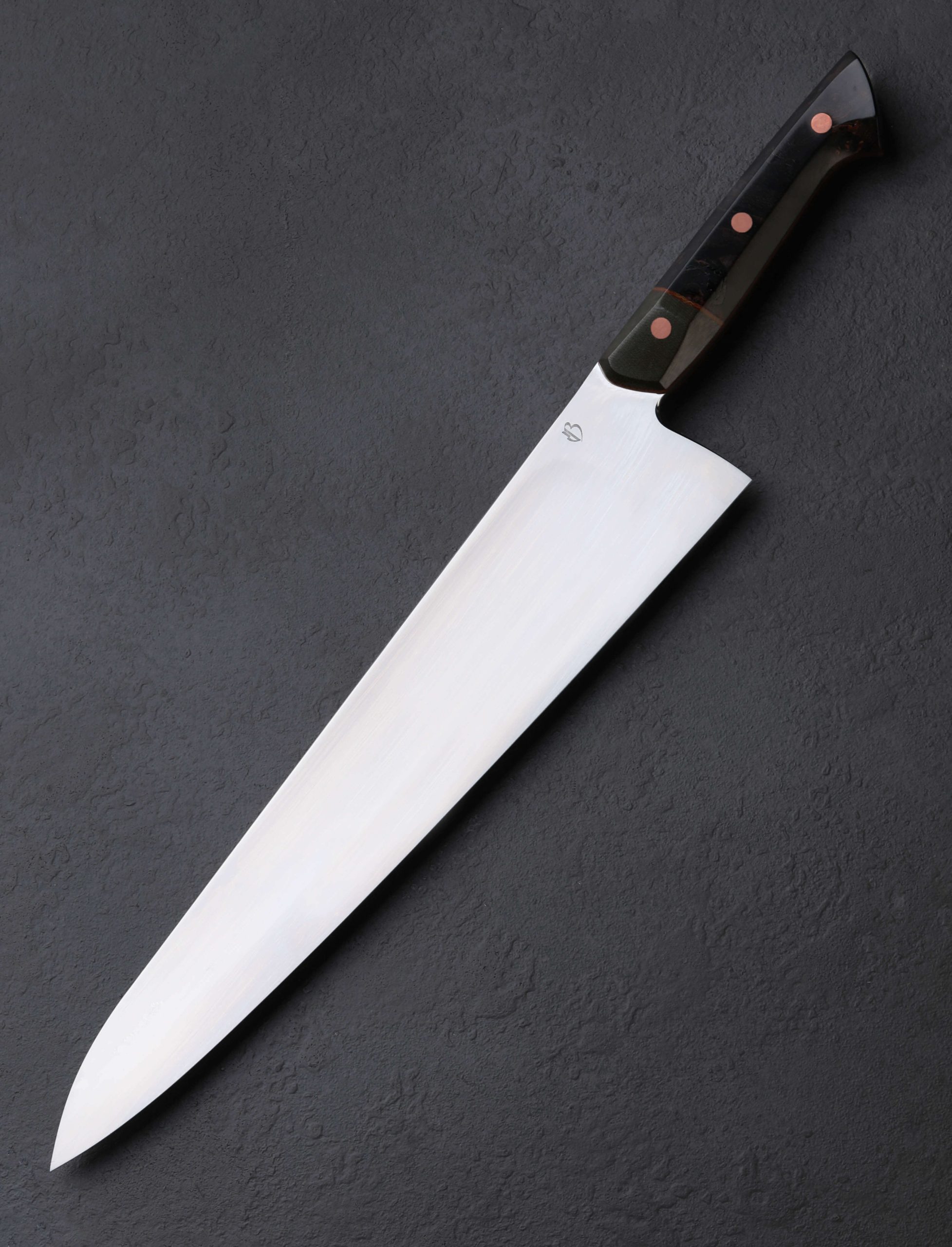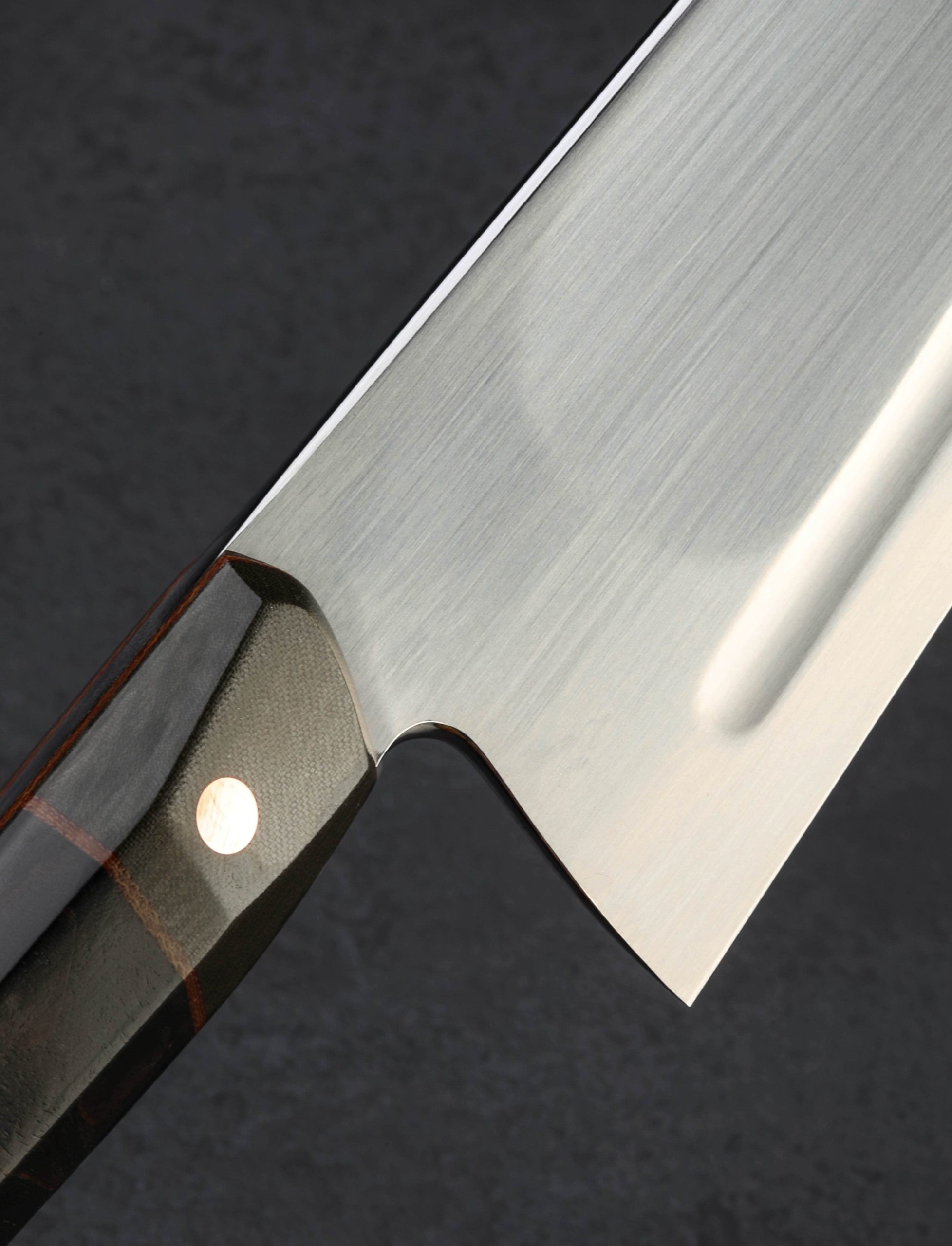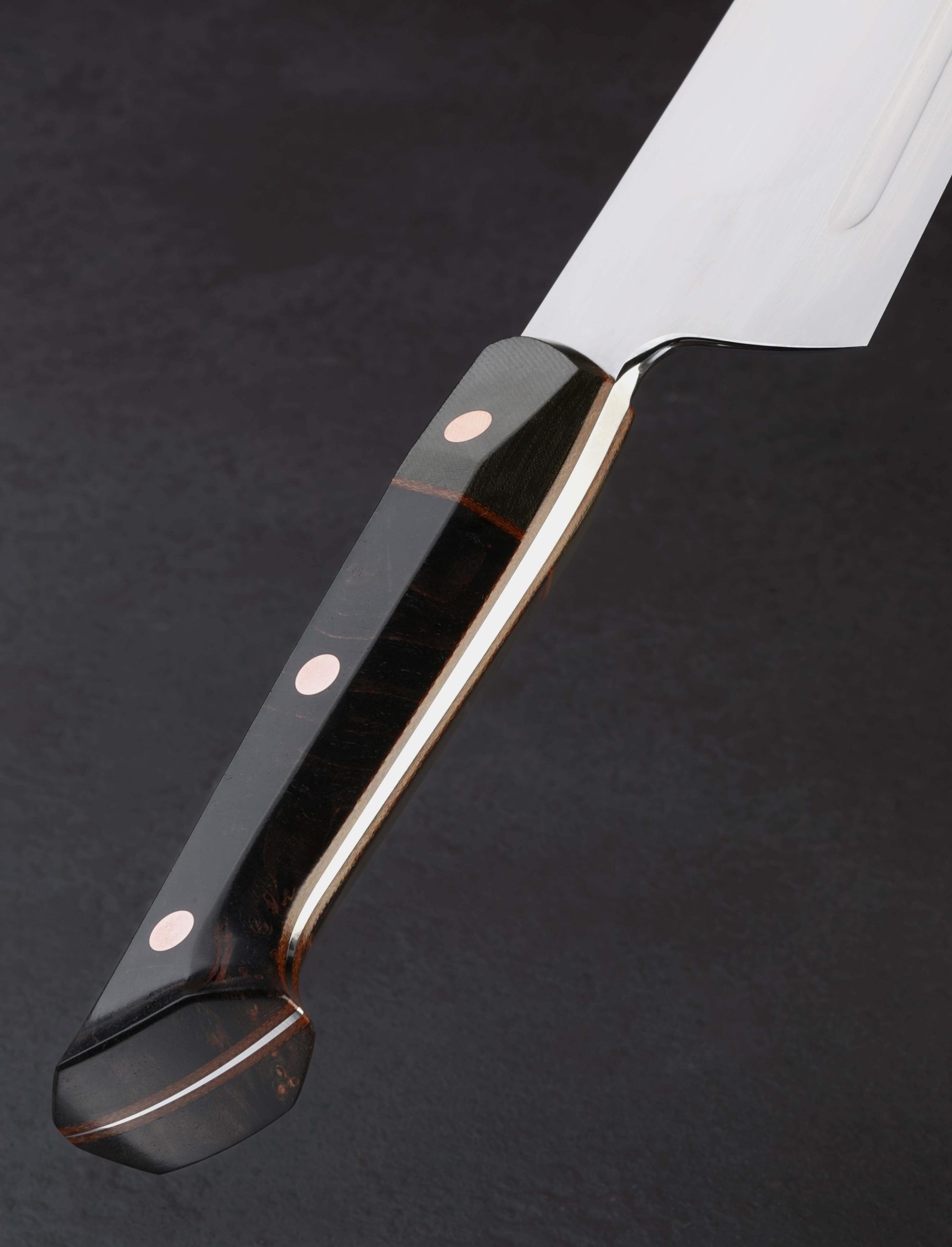 By culinary craftsman and designer Dan Bidinger, bringing together so many of the refined attributes for which he has become known, is an extra large, remarkably handsome, high-performance knife for the chef’s kitchen. In AEB-L high-performance stainless steel comes 300mm / 11.8″ of razor sharp edge standing 62mm tall at the heel, providing a blade designed to do it all with efficiency and gusto. Its stunning, silky, hand-sanded satin finish can be overlooked at first glance as Dan’s carefully honed, asymmetrical compound ‘B-grind’ geometry tends be the blade’s stand-out feature, and for good reason. Both sides of the blade offer a concave section above a convex stretch which leads to an especially thin, razor-sharp edge, and on the right side, a second hollow ‘fuller-style’ element is added to further assist cutting performance and food release. The rounded, polished blade spine tapers steadily forward, slimming from 4mm above the heel to barely 1mm an inch from the tip, and further more until it practically disappears from sight, giving the blade versatility and dynamic feel on the board. That taper, along with the blade’s length, and Dan’s precise heat treatment and hardening process, result in a superb degree of lateral flexibility in the forward half: just enough, and not too much. Finally, for comfort, control, and additional elegance, not that more was needed, Dan sculpts a handle from maple wood and two contrasting natural linen micartas, all secured with three flush, oversized copper pins. Between the handle materials, the blade’s full tang extends to the end, tapering, as the blade’s spine does, from 4mm to a paper-thin profile at the back of the Western-style grip, helping balance this large and beautiful tool both visually and in the hand.