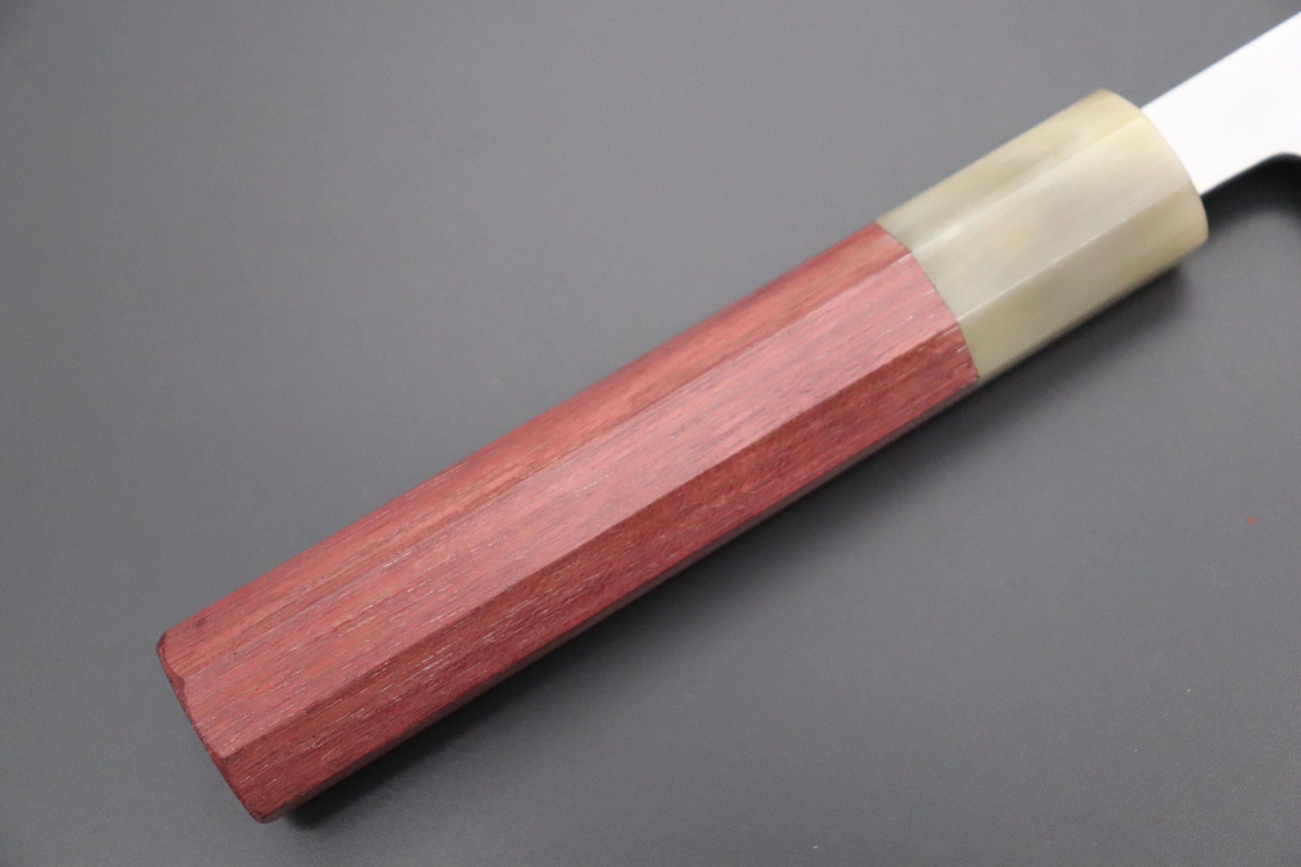 This time, Masamoto has worked with their favorite Japanese Wa Handle Craftsman to produce a collection of Limited Edition knives with very natural, traditional-style Handmade Octagonal Wa Handles and matching Handmade Saya (Wooden sheathes). The Craftsman, who is a long-time business partner of Masamoto, has carefully selected these exotic wood materials and he has maintained the highest standards during every step of production.