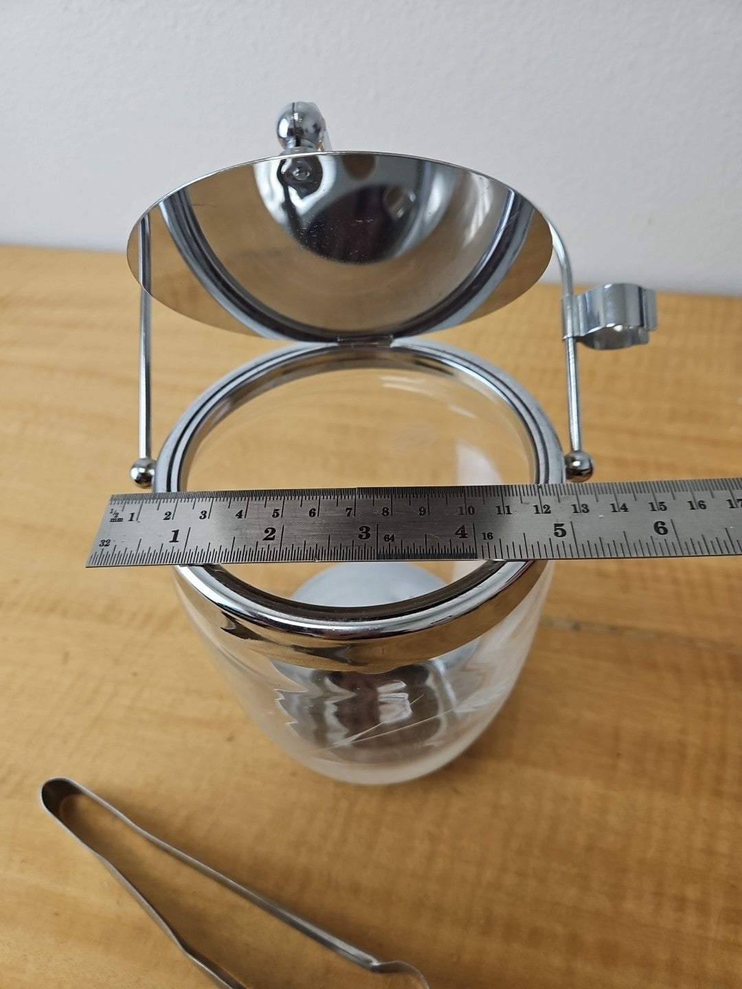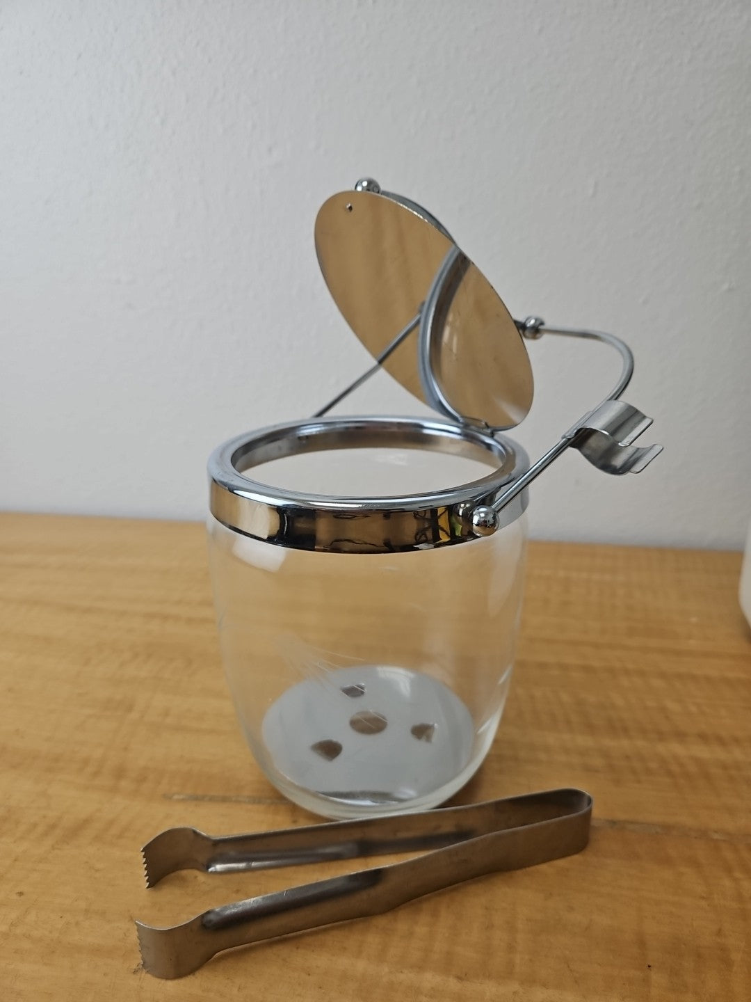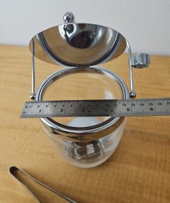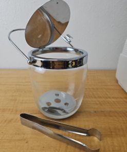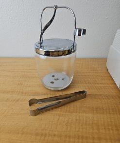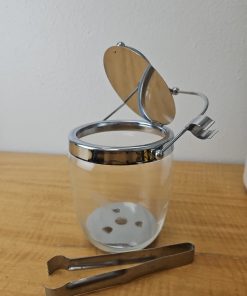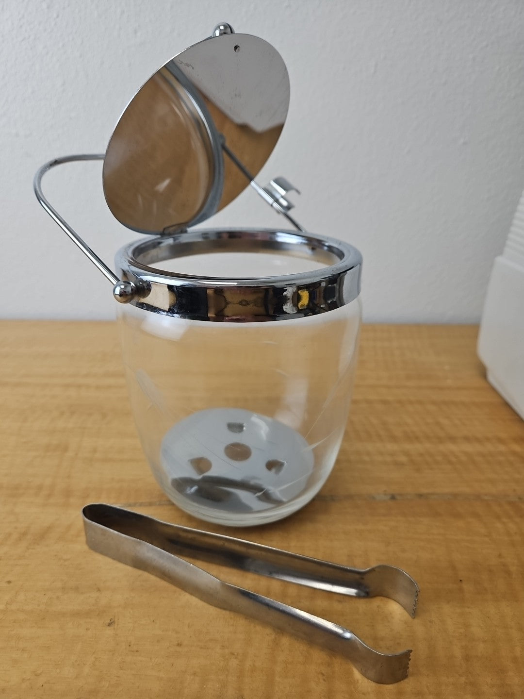 MCM Etched Metal Chrome Glass Vintage Ice Bucket Barware Hinged Lid And Tongs