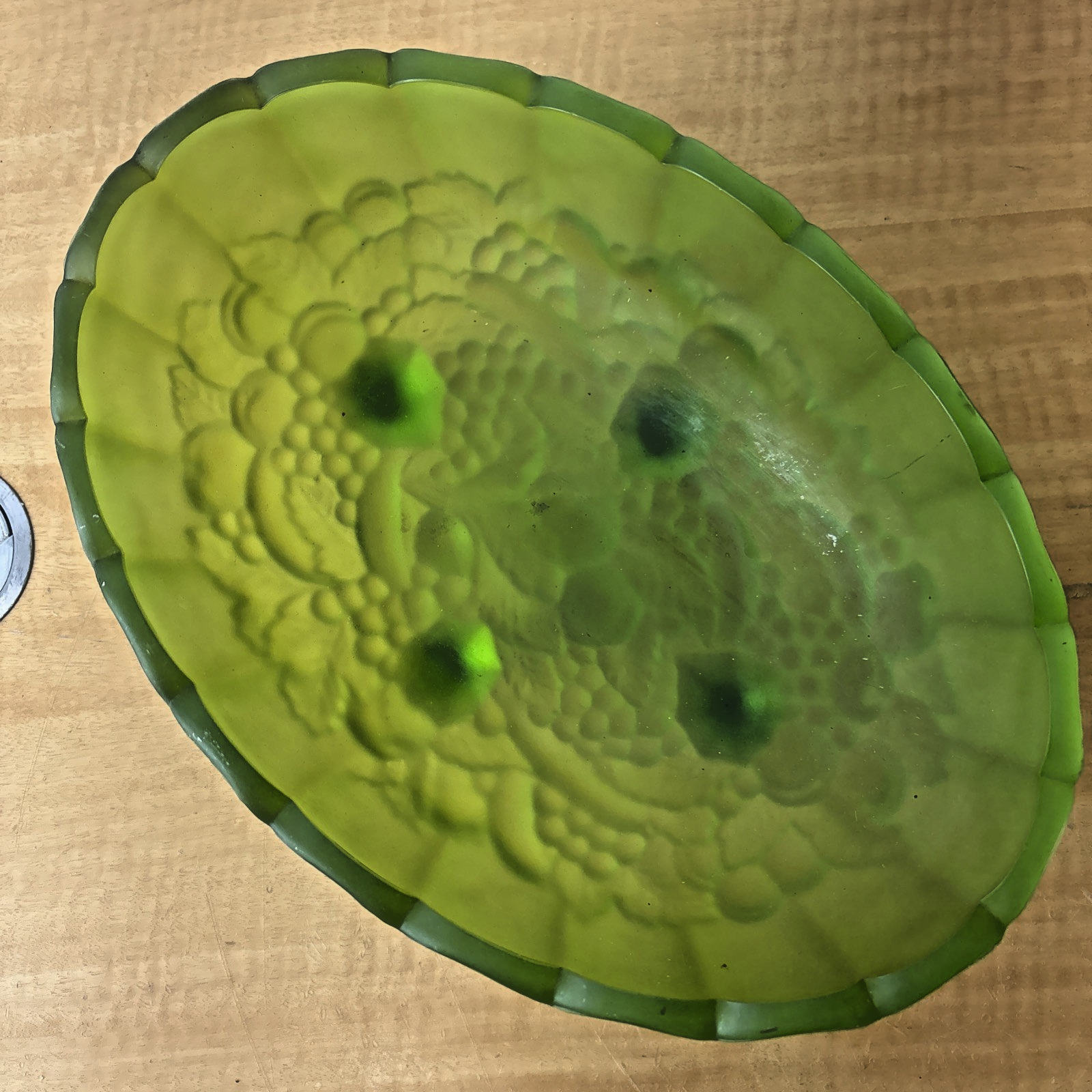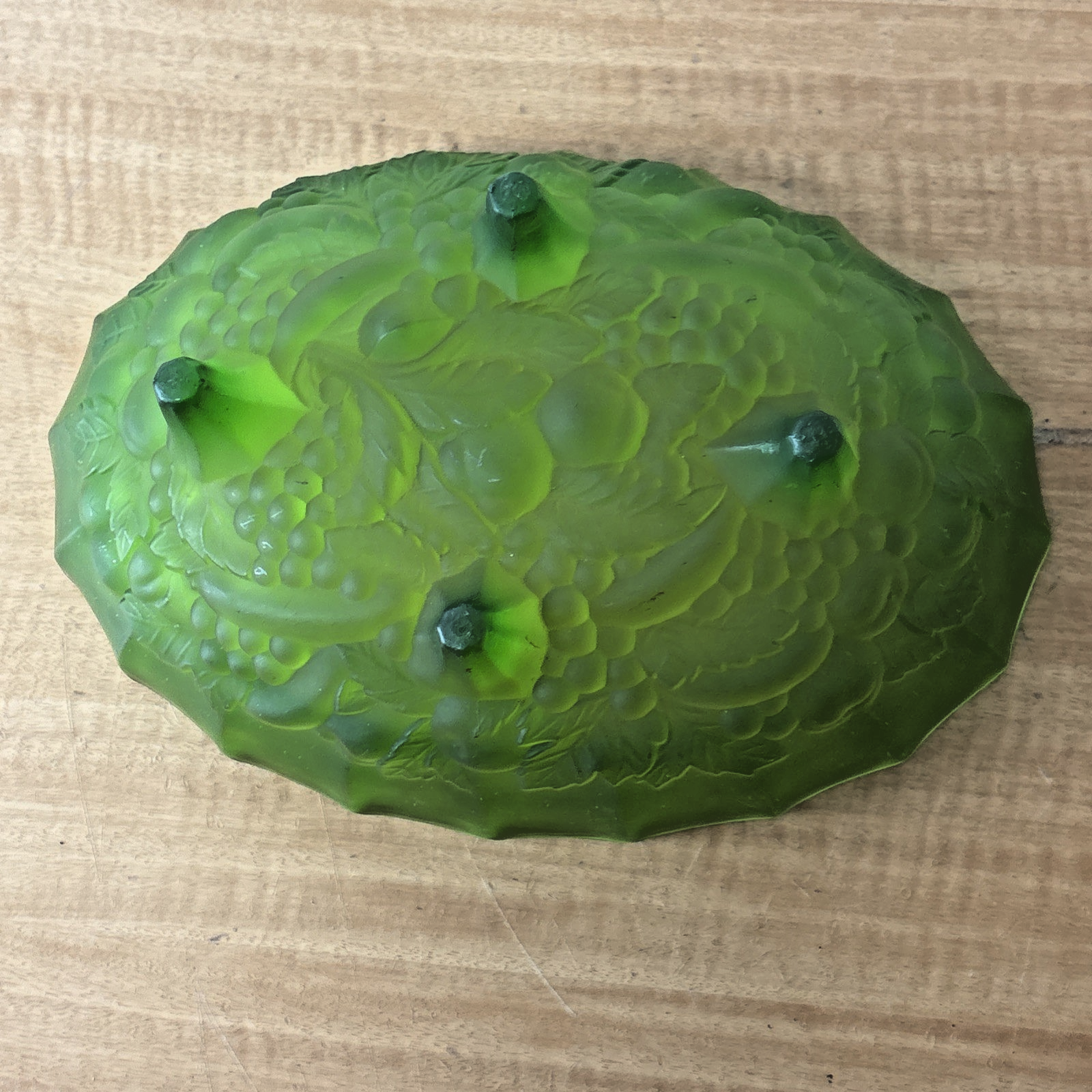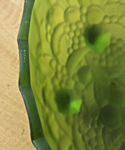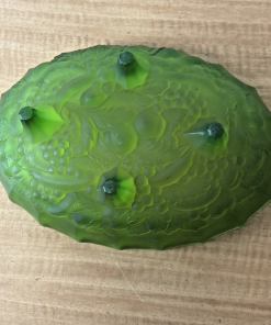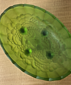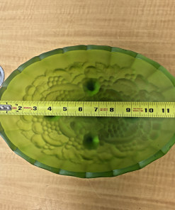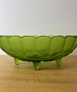 MCM Indiana Glass Grape Harvest Pattern, Footed Oval Bowl. Frosted Emerald Green