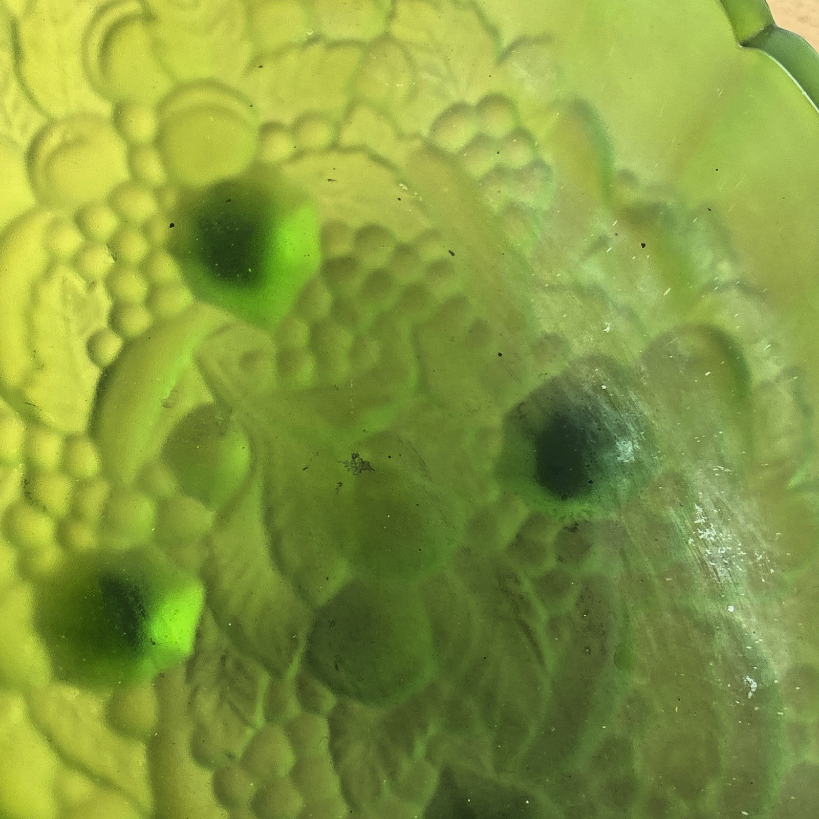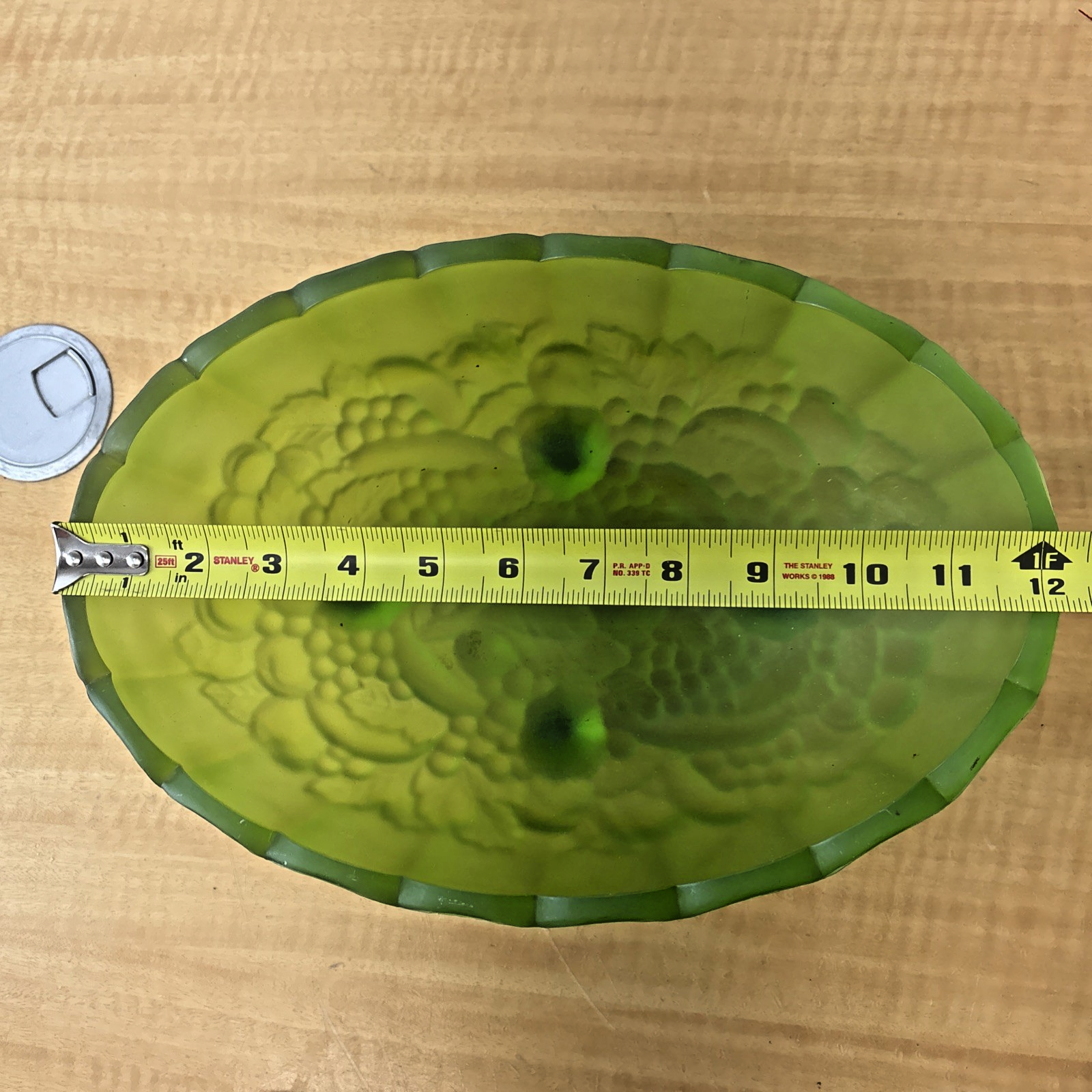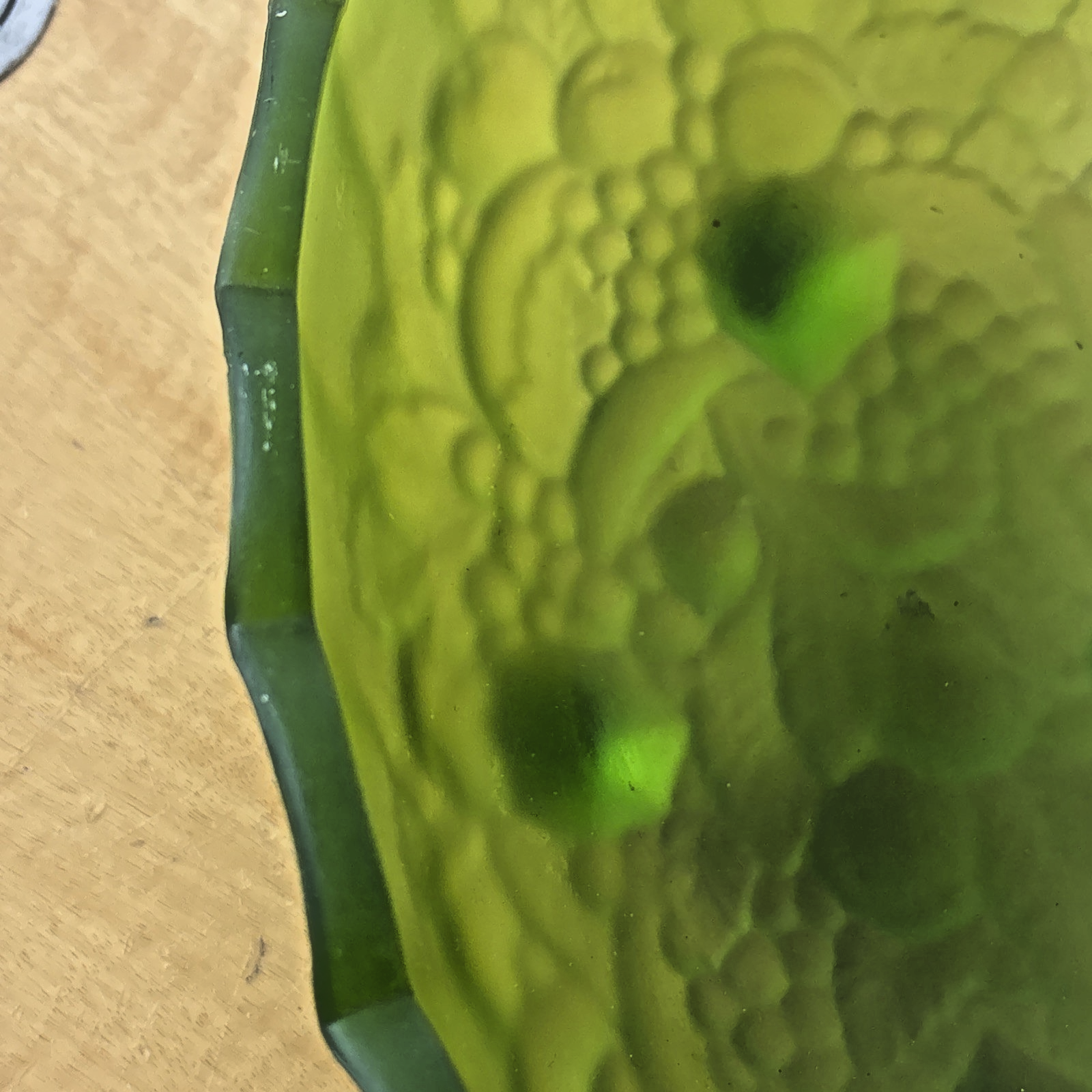 MCM Indiana Glass Grape Harvest Pattern, Footed Oval Bowl. Frosted Emerald Green