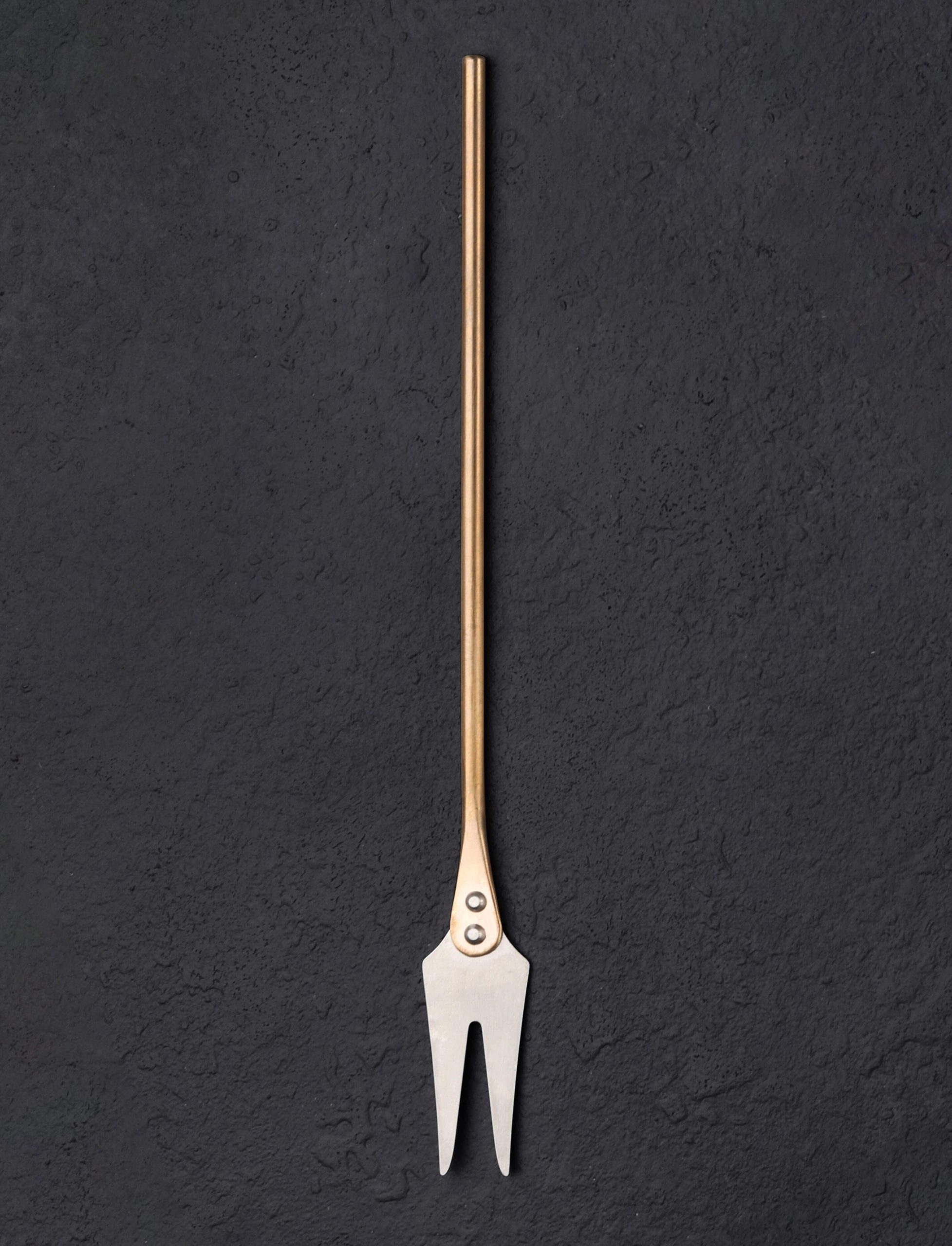 Simply elegant, this handcrafted two-prong cocktail fork features a handle of solid brass and head of stainless steel. Made one at a time in Colorado by artisan Jill Rikkers, the tines are strong enough to skewer without bending while the artisanal, rustic aesthetic is at home in virtually any setting. From seafood to cocktail onions, the versatility of a mid-size cocktail fork is difficult to match.