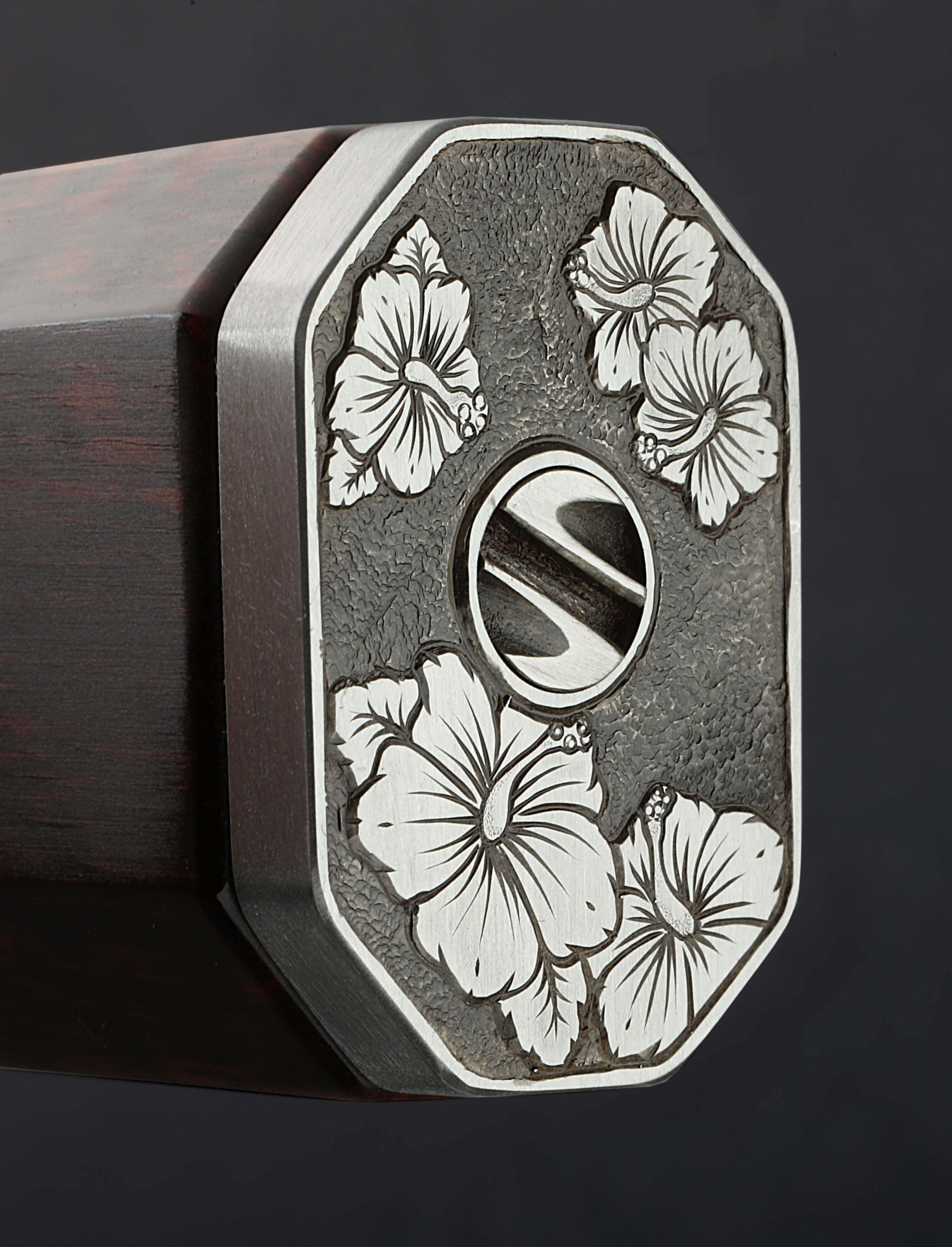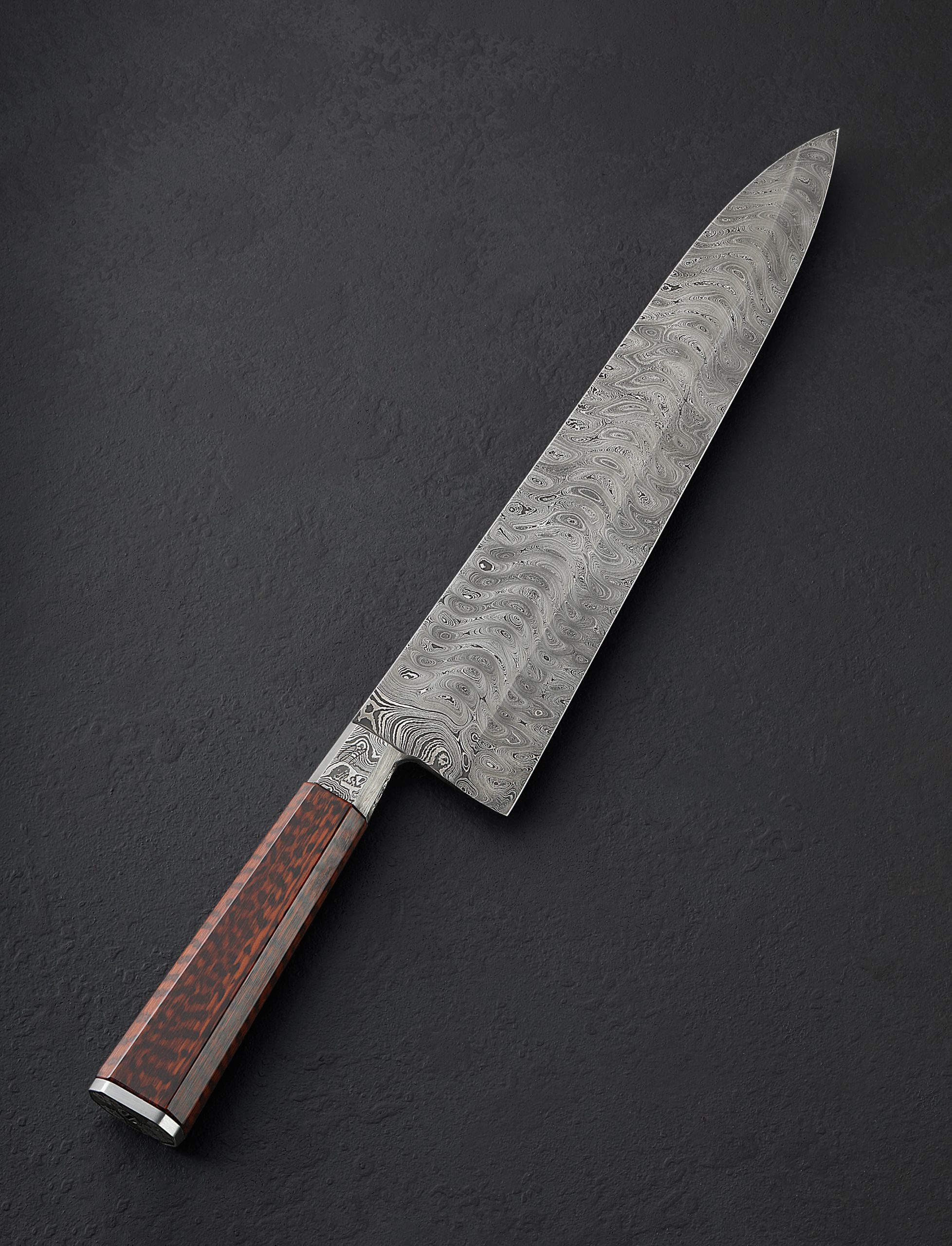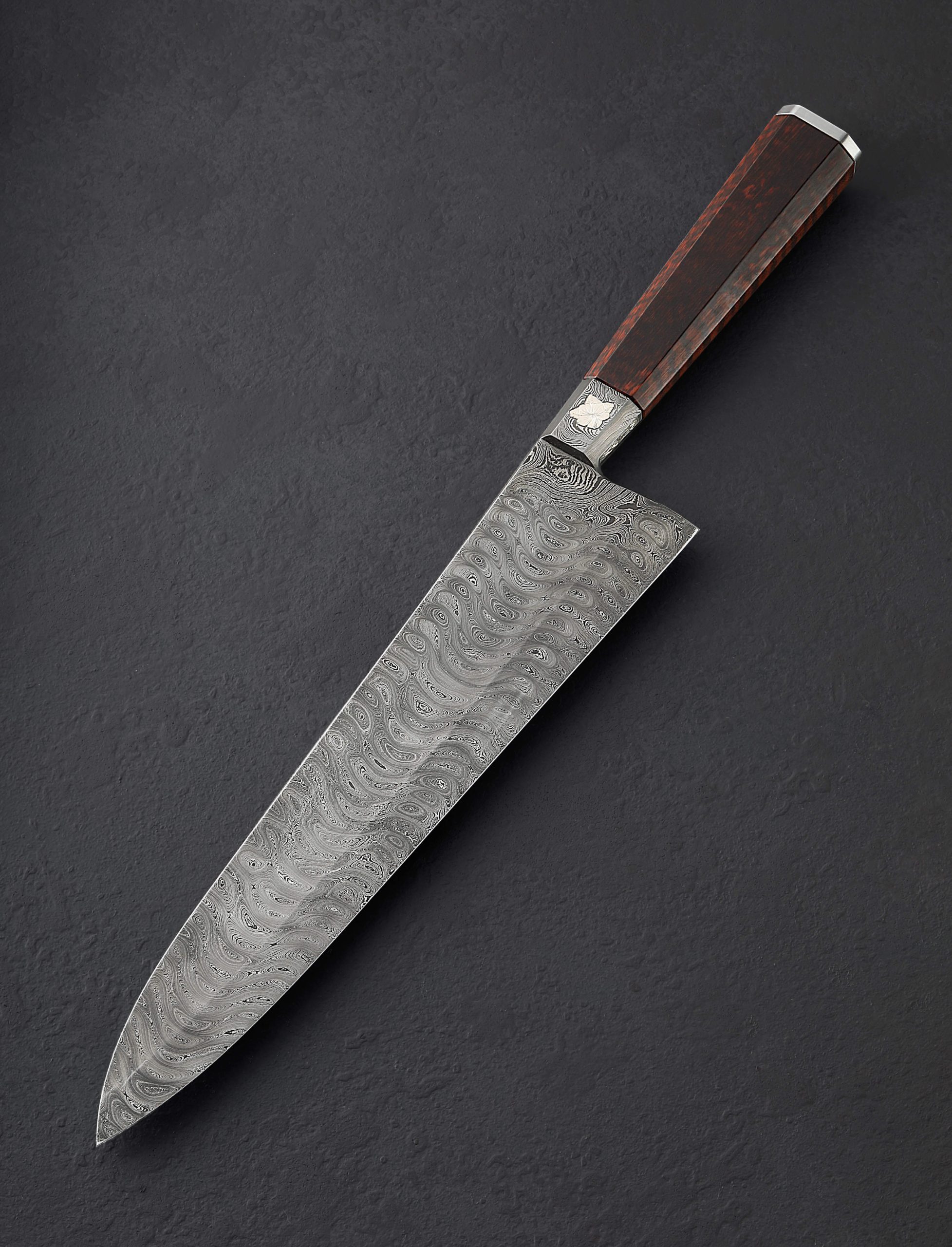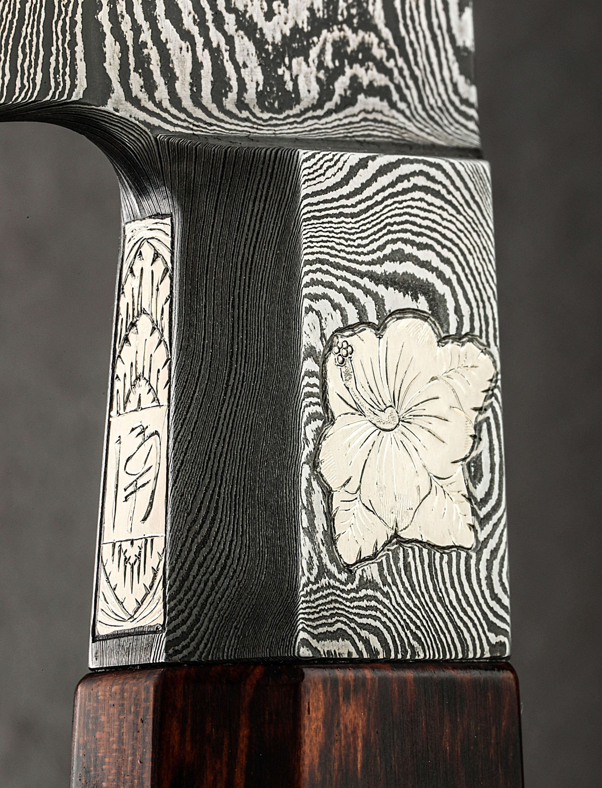 A rare opportunity to own a one-of-a-kind integral damascus chef knife by ABS Master Bladesmith Andrew Meers is here. In pristine, pre-owned, never-used condition, this stunning work of culinary art delivers a 298mm / 11.7″ blade of high-carbon, house-made damascus steel blade with Andrew’s compound ‘S-grind’ geometry to create a dynamic and powerful workhorse for the chef’s kitchen. With superb precision, the concave portion of the bevels begins at the blade’s spine and accounts for approximately two-thirds of the blade’s height (67mm at the heel) before transitioning to the convex portion, perfectly shaped as it tapers downward to a very thin, very sharp edge. Sturdy and weighted in the hand, the spine tapers just slightly until the final inches, the end of which is an extremely fine, needle-like tip perfect for slicing work. Then, there is the handle. The knife’s integral construction means a forged damascus bolster begins the combination of materials before giving way to a stepped, museum-fit piece of snakewood. The bolster has more of a story to tell, though: in two of the facets, Andrew, an accomplished metal artist of multiple disciplines, has inlaid engraved 999 fine silver. At the back of the tapered piece of snakewood is an end cap, also engraved with exquisite detail, giving the Hibiscus Gyuto its name. Finally, the butt cap’s retention nut cap has also been engraved.