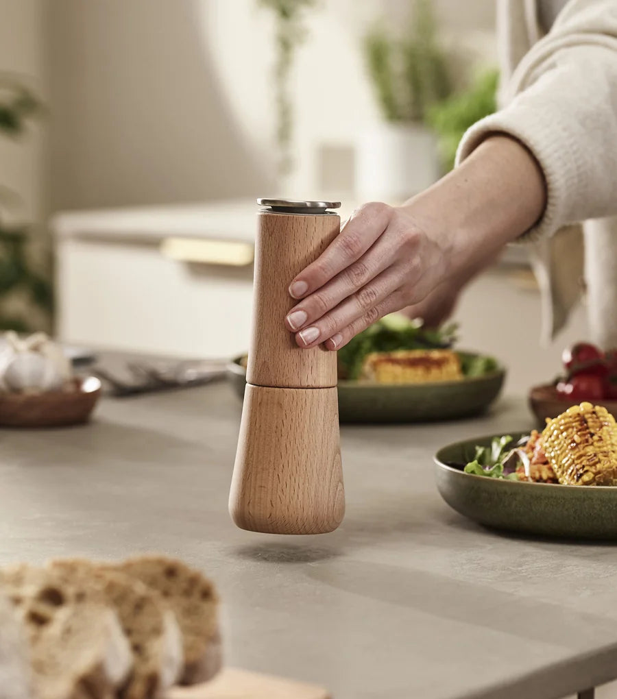 If you prefer to season meals without making a mess, Milltop™ Wood is the pepper mill for you. Unlike conventional mills, we placed the ceramic grinding mechanism at the top to ensure excess grounds fall back inside the unit after use. Made from natural beech wood, this easy-to-use, easy-to-fill pepper mill is an essential asset to every dining table.