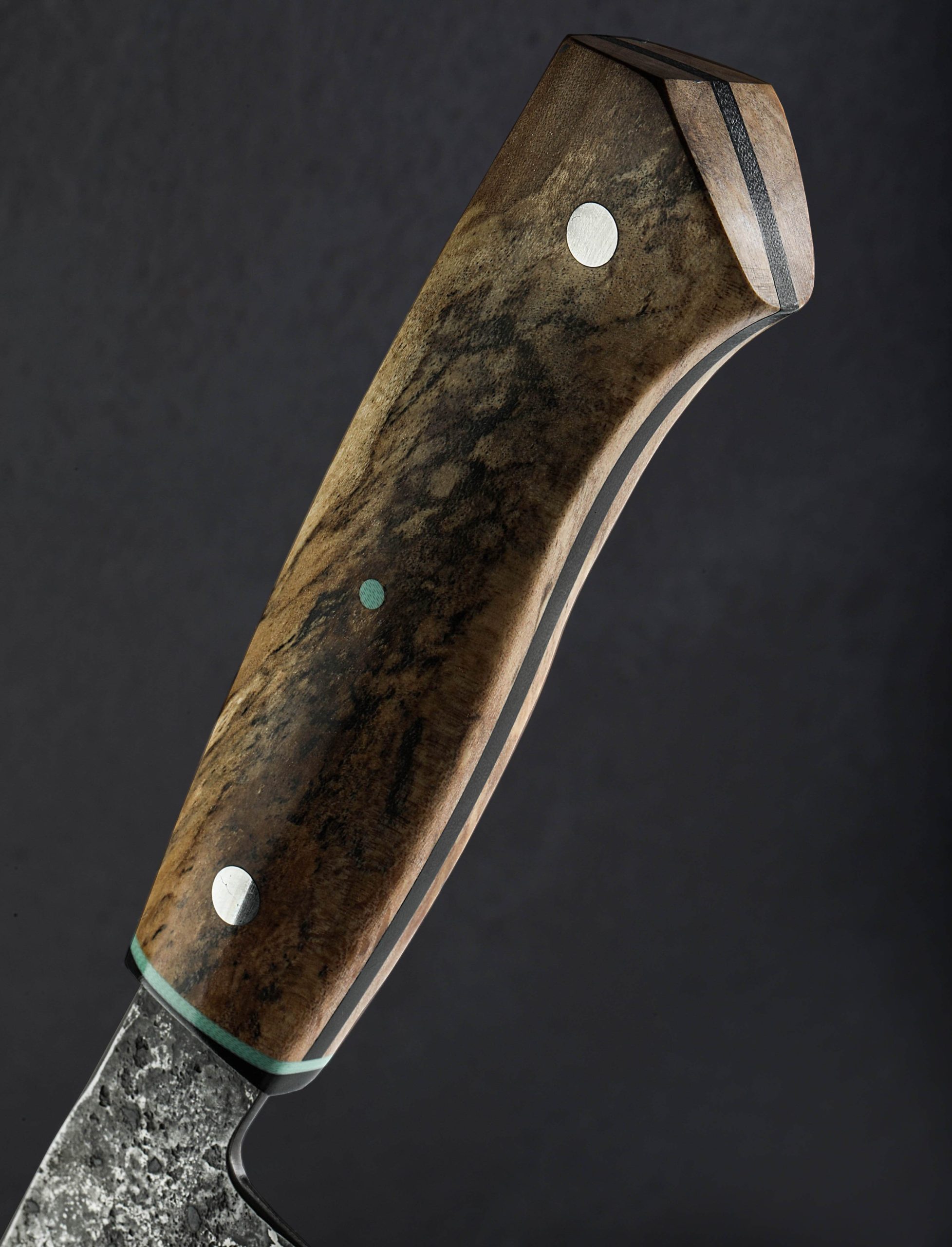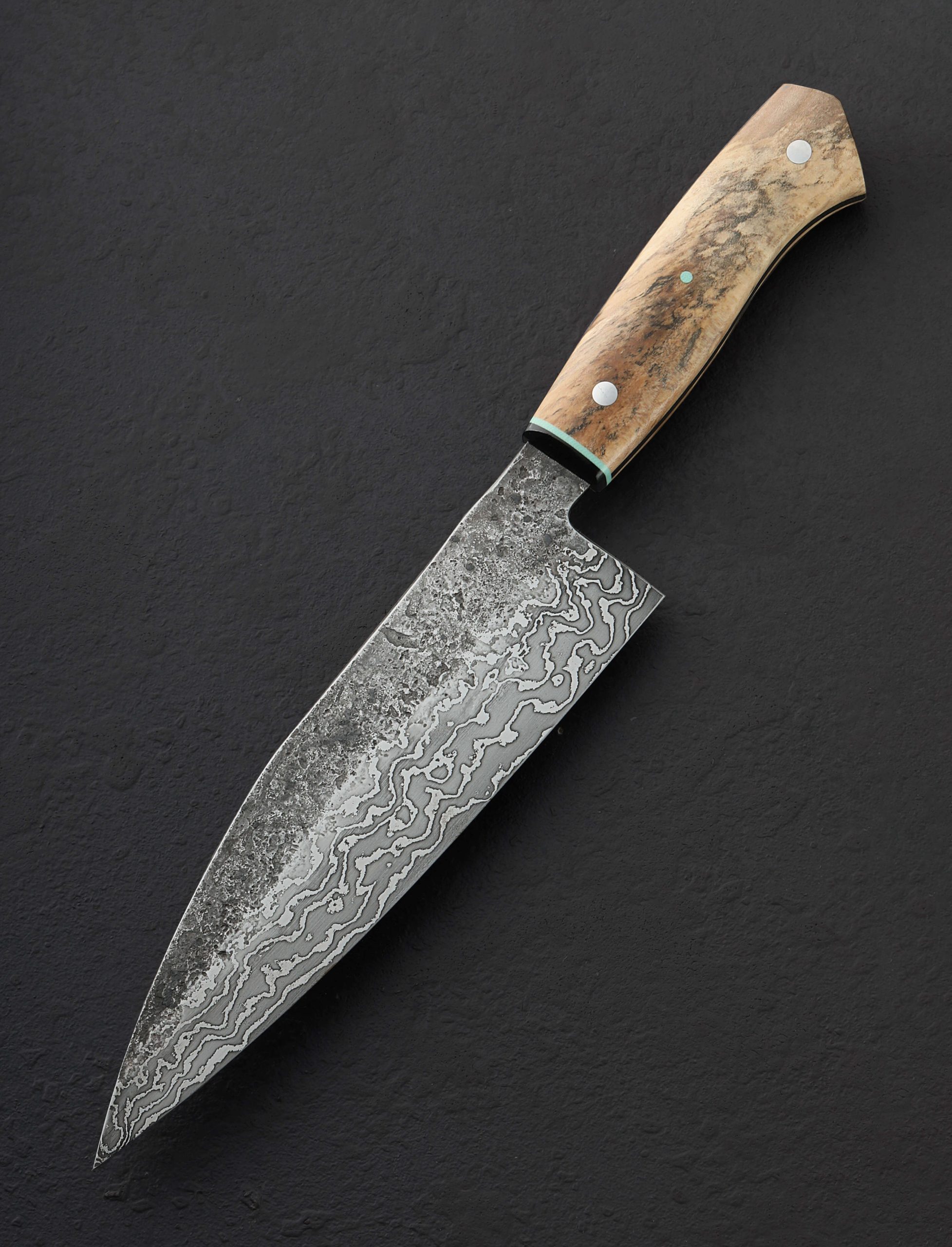 Bladesmith and designer Nick Rossi has a style all his own, and we love every rendition. With subtle, mint-colored highlights, this one-of-a-kind chef knife is built to cook with daily and crafted to turn heads in the kitchen. A 204mm / 8″ blade in a gyuto-inspired profile with low, fine, and pointed tip for detail work delivers a razor-sharp edge below convex bevels forged by hand from Nick’s own 20-layer high-contrast carbon damascus steel. The edge is thin below beautifully etched bevels and rustic, forge-finished flats that bear the marks of Nick’s hammer blows applied at his Maine studio. For comfort and control a naturally and perfectly imperfect pair of spalted maple handle scales wrap around a frame of black G10, with matching, contoured G10 ferrule, finished with a mint-green spacer and pin, and two polished stainless steel pins. Balancing just at the blade’s heel with a rigid spine and powerful feel in the hand, Nick’s passion for his craft shines in this edged culinary tool.