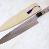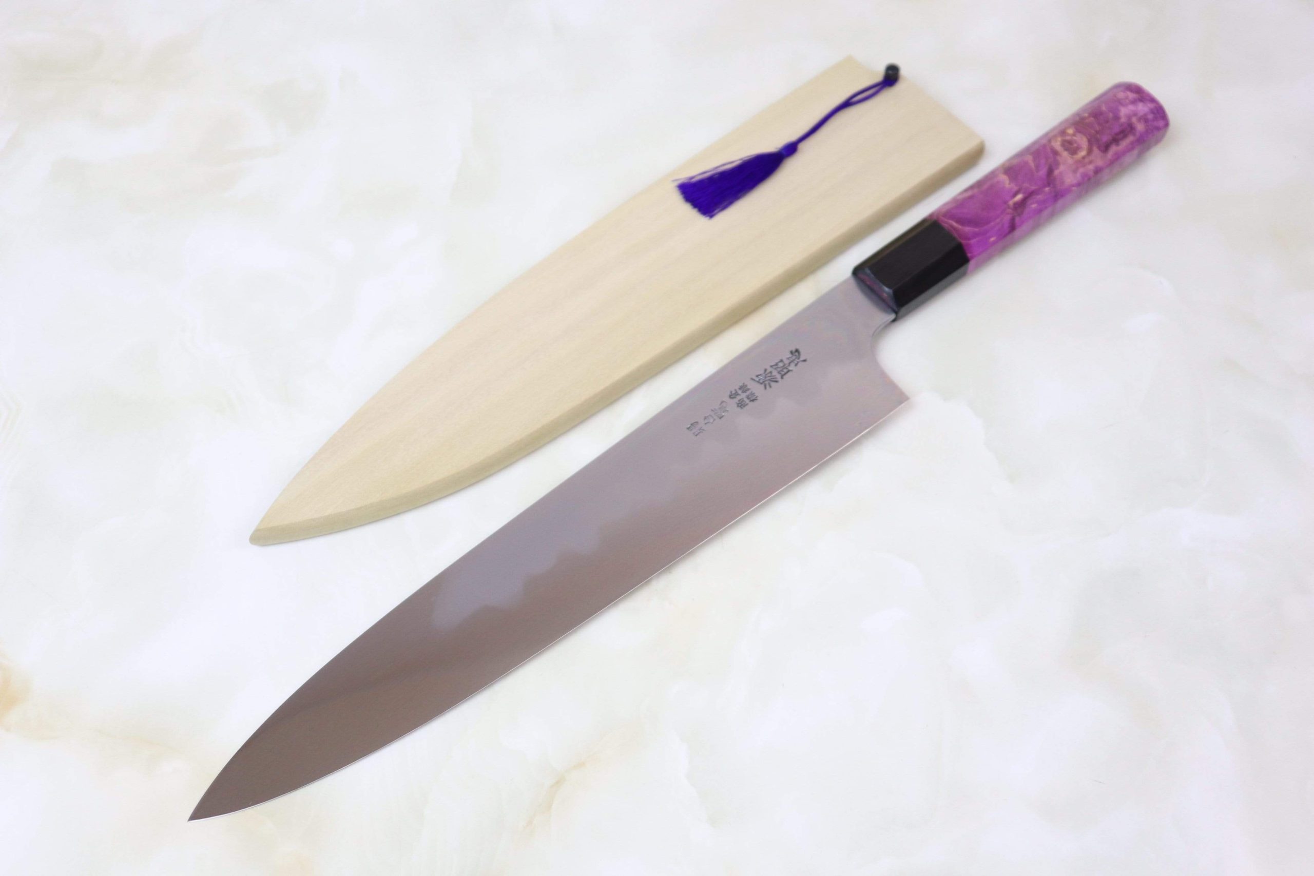 To match the beautiful art of Mizuno Tanrenjo Honyaki Wa Gyuto blade , this knife comes with Vivid Purple Color of Octagonal Handle, which is made from Stabilized Maple Burl Wood and has a Water Buffalo Horn Ferrule. A handcrafted Magnolia Wood Saya (Scabbard / Sheath) is also included to protect this magnificent blade.