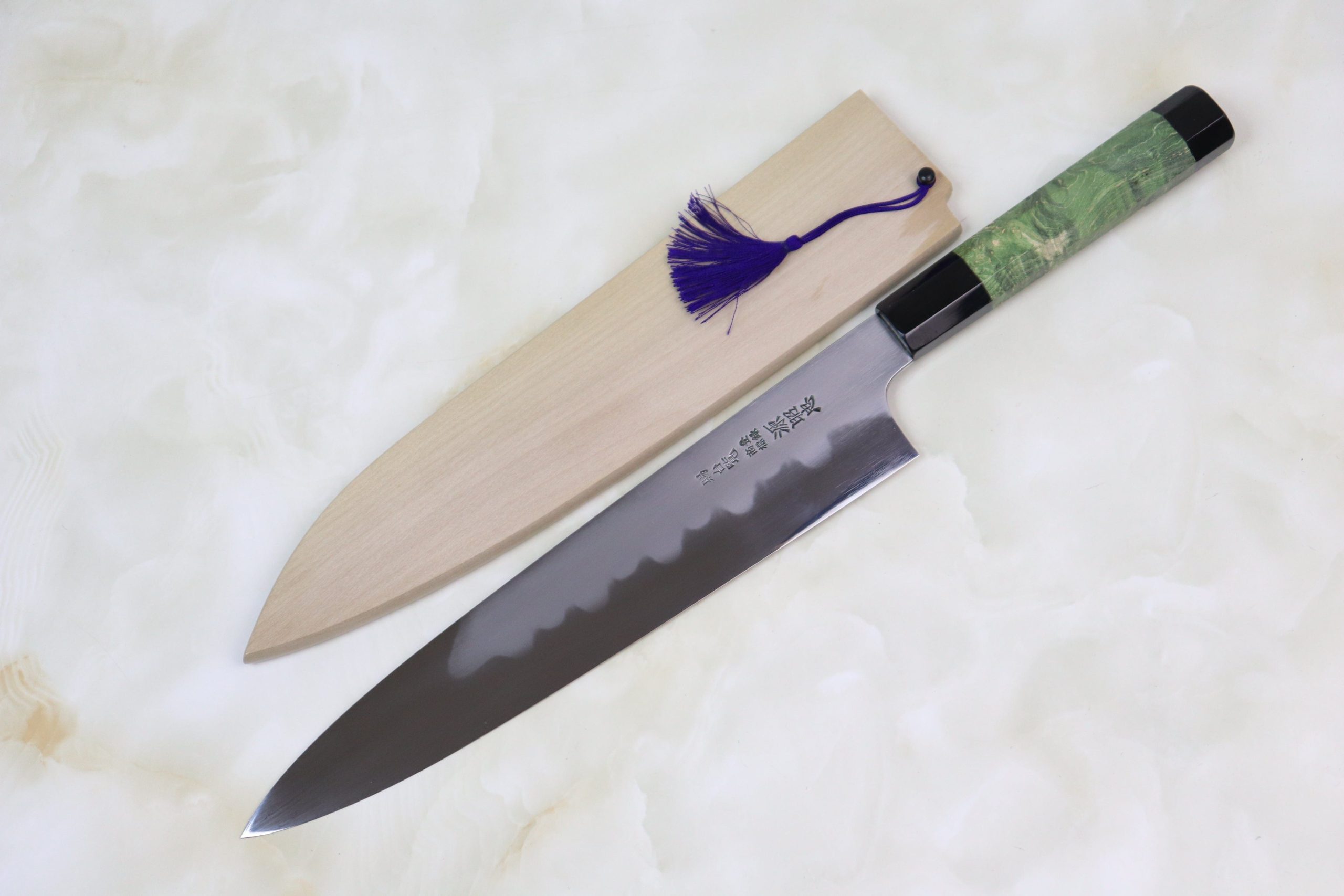 To match the beautiful art of Mizuno Tanrenjo Honyaki Wa Gyuto blade , this knife comes with Stylish Forrest Green Color of Octagonal Handle, which is made from Stabilized Maple Burl Wood and has a Water Buffalo Horn Ferrule & Butt. A handcrafted Magnolia Wood Saya (Scabbard / Sheath) is also included to protect this magnificent blade.