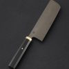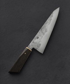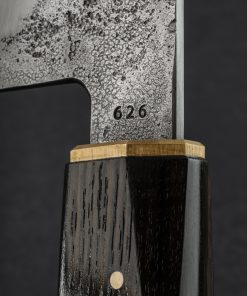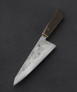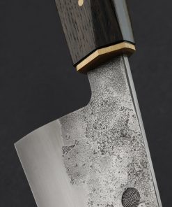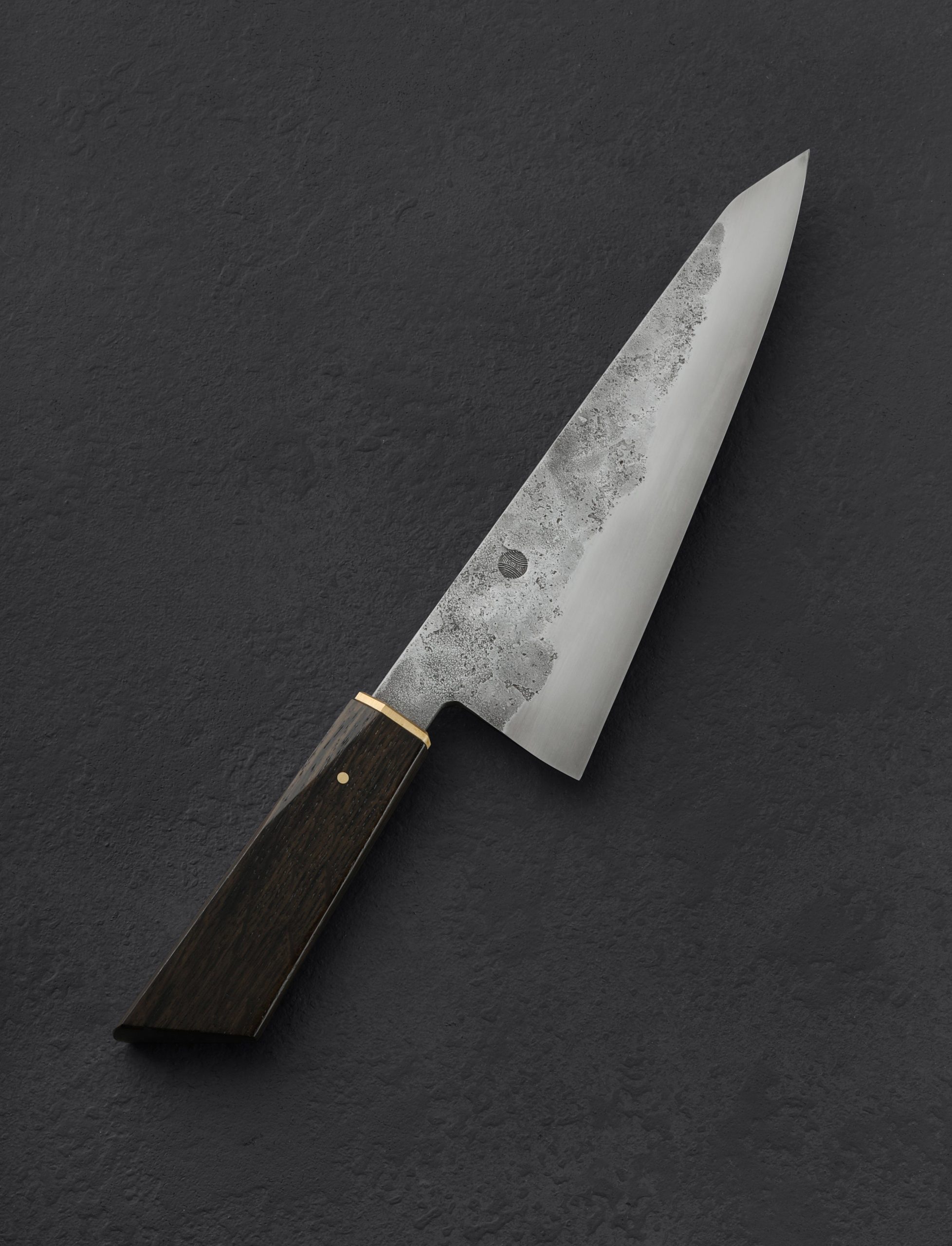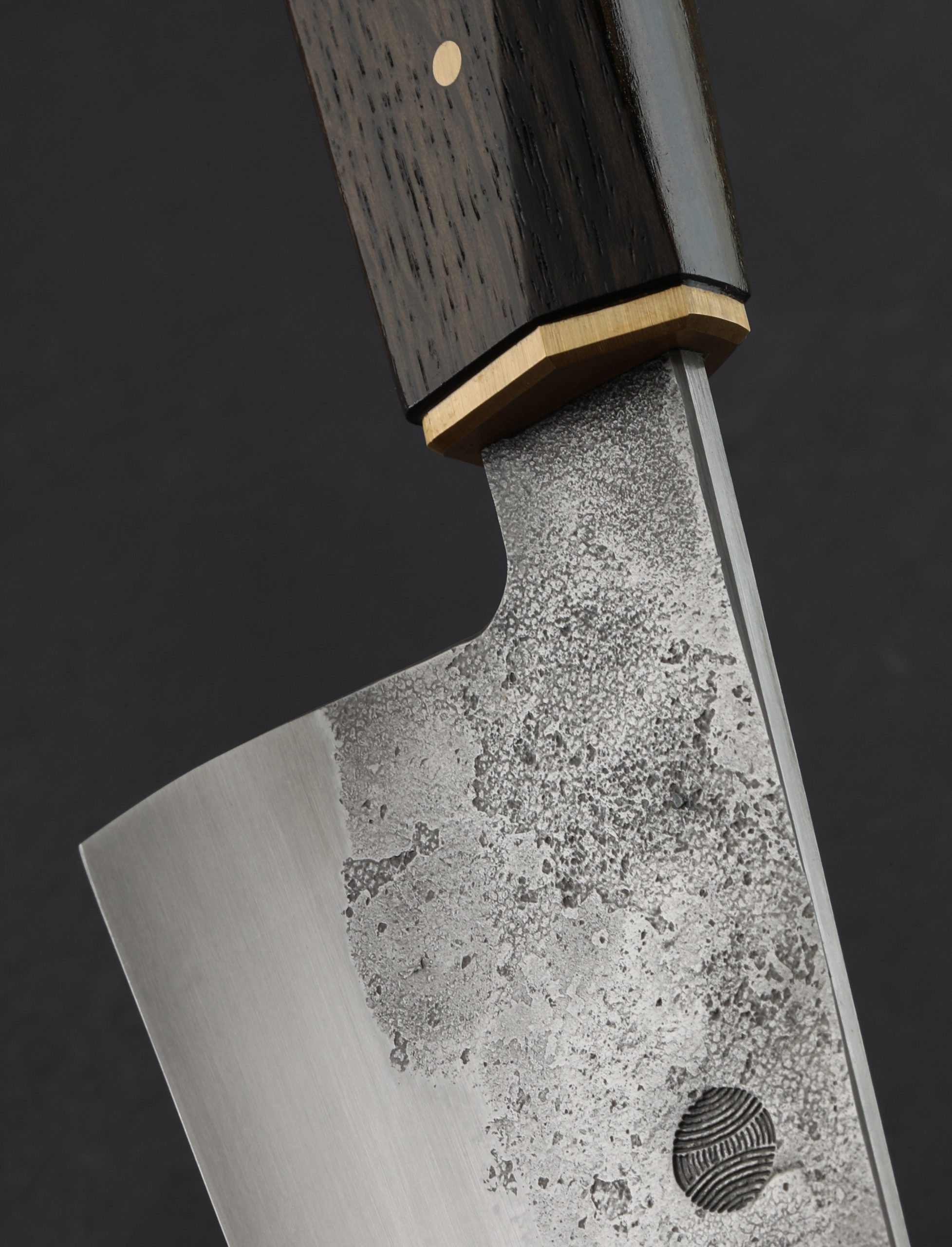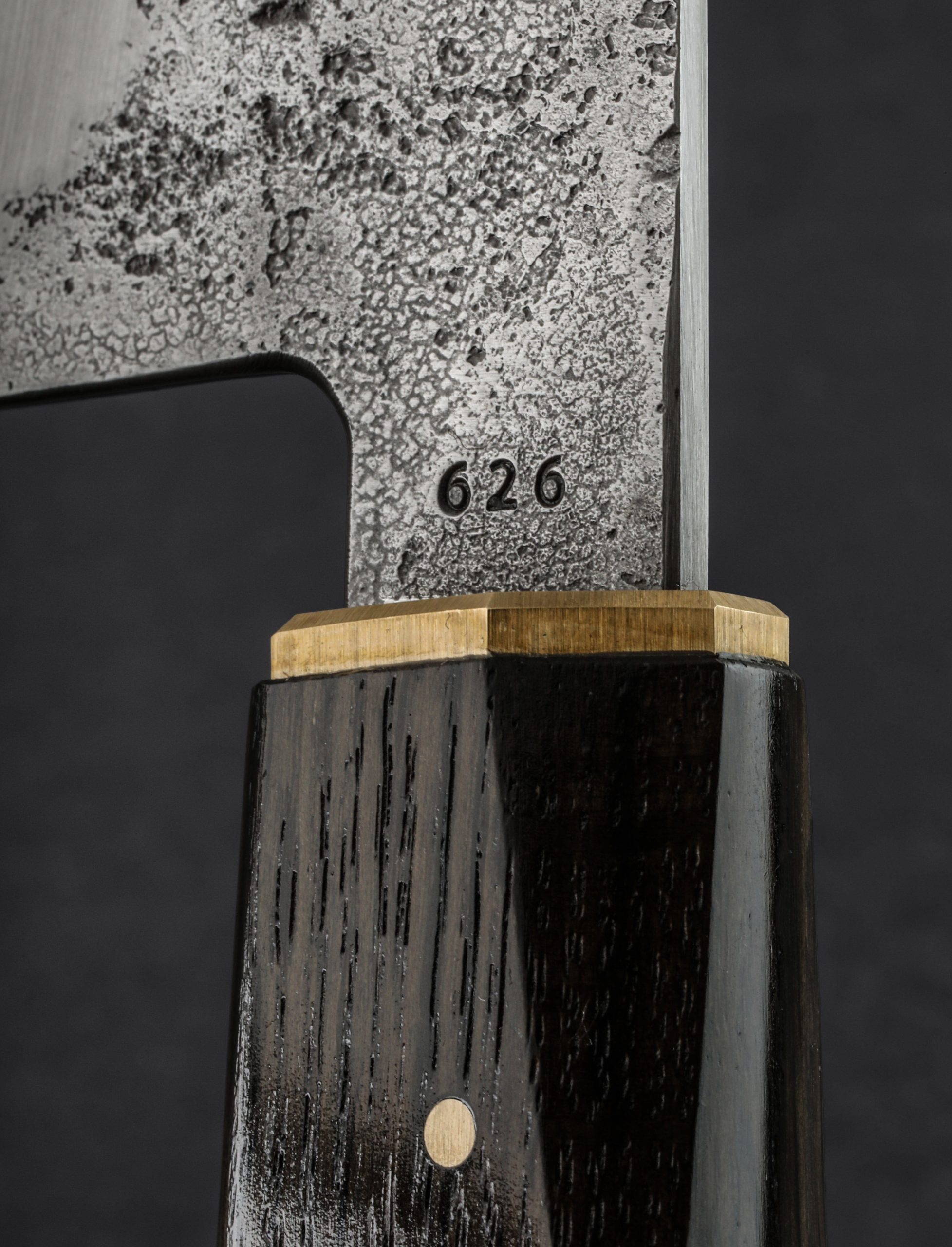 Hand forged in Kassel, Germany by bladesmith Oliver Märtens exclusively for our Living Steel collection, the Modern Chef received a design update in November 2022 with a new handle profile, added brass handle pin, and a subtly refined blade for improved performance. This handsome design features a hard, thin, and very sharp edge in Oliver’s preferred 1.2419.05 tungsten-carbon steel, prized for its toughness and edge retention. With convex bevels, a tall heel, and needle-like tip for slicing and detail work, this mid-size 180mm / 7.1″ chef’s knife is as versatile as it is elegant. Ancient bog oak and brass complete a handsome and comfortable handle in Oliver’s popular shield-style profile. Showing the marks of this talented artisan’s hand-hammered blows along the top of the blade, each knife is unique.