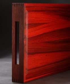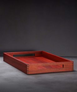 Meticulously handcrafted from premium, kiln dried, quartersawn Michigan White Oak, Burmese Teak, and African Padauk, these are the serving trays of artist José Regueiro. Functional and refined, each tray is shaped one by one from hand-selected pieces of timber and assembled with finger-jointed corners and contoured edges. Silky, hand-sanded handles on either side offer ergonomics and versatility wherever the tray is used. For matched grain and color, the sides are always cut from the same piece as the bottom, and each board is completed with a hand-rubbed, food-safe oiled finish.