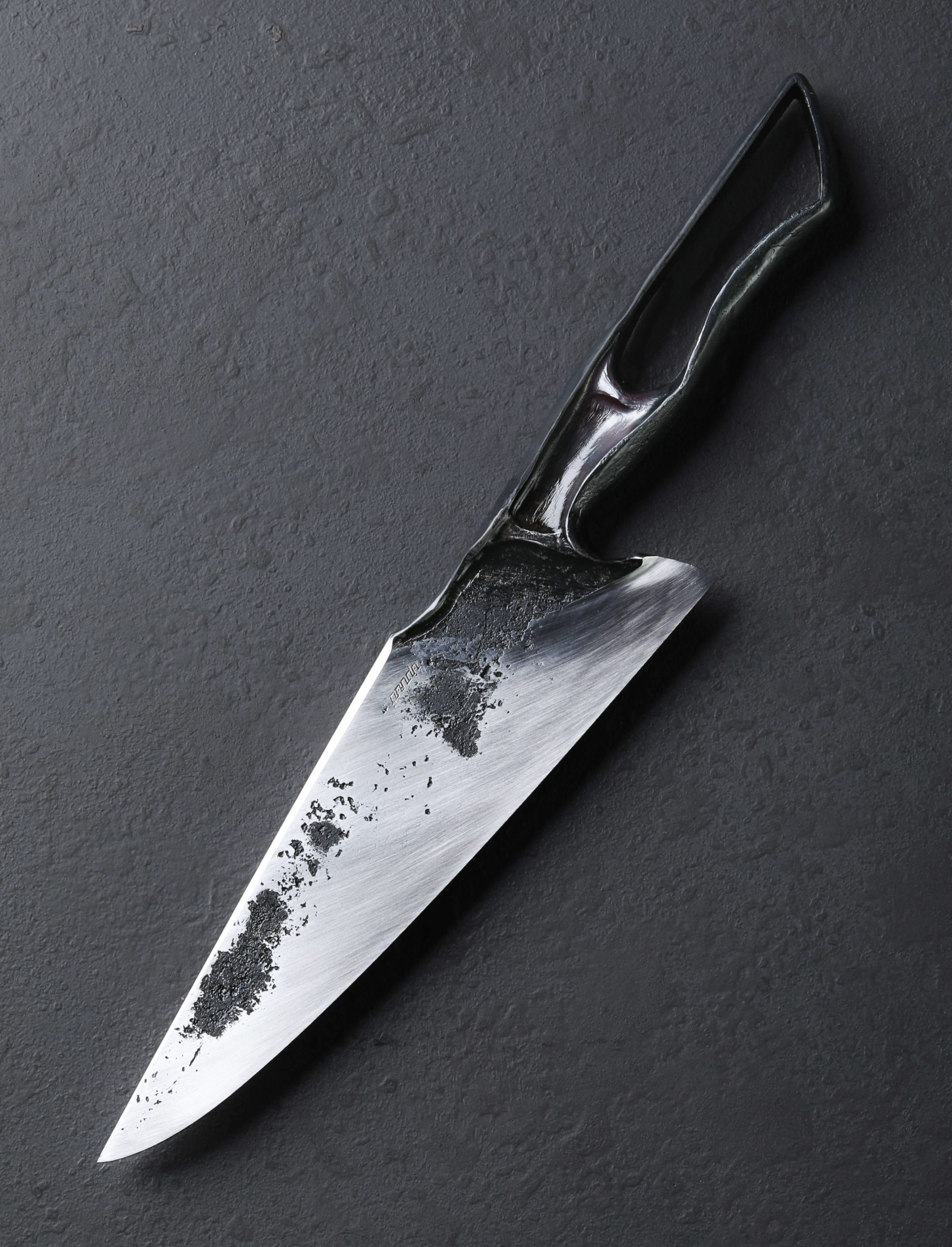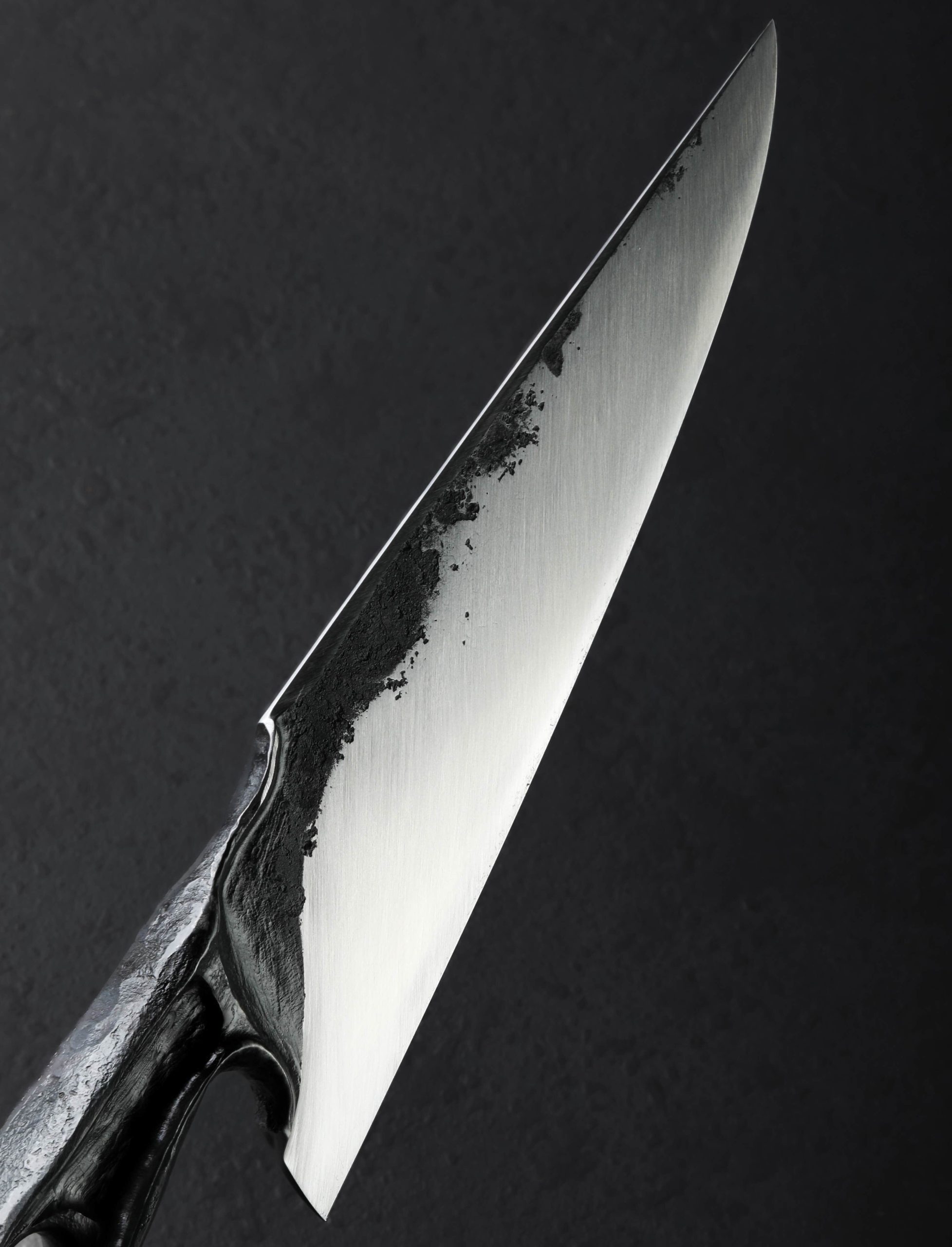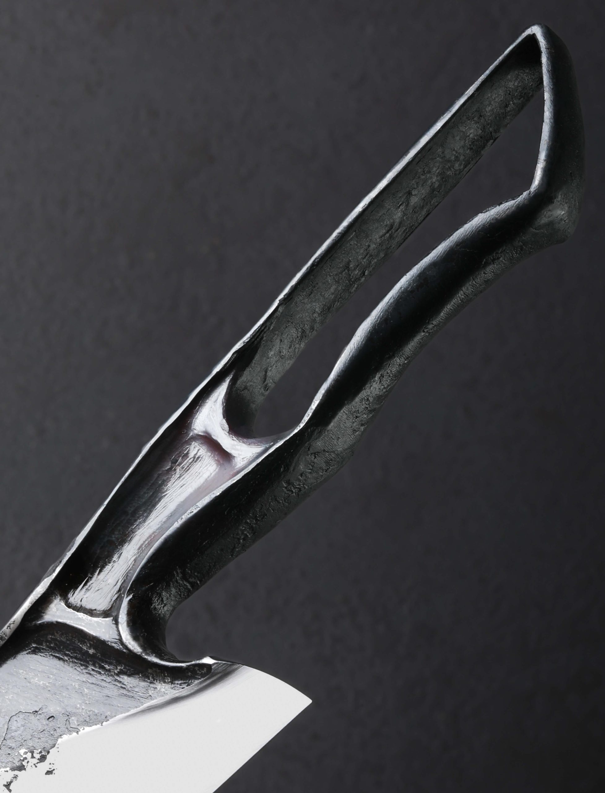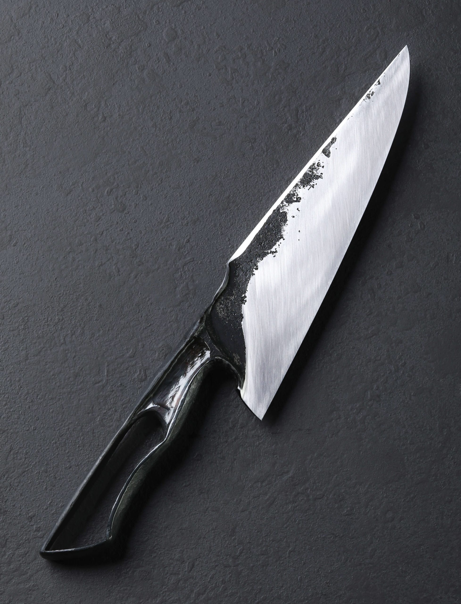 Through patience, a thoughtful vision, and carefully calculated hammer blows, bladesmith Nick Anderson transforms a two-inch by two-inch by one-inch block of 52100 high-carbon steel into the one-of-a-kind chef knife witnessed here. An organic, hand-hewn combination of dark, forge-finished surfaces pairs with the blade’s brushed bevels to produce an aesthetic worthy of decorative sculpture, and utilitarian enough to become the cook’s daily workhorse cutting tool. Pronounced convexity through the tall bevels, a thin, razor-sharp edge backed by the superb, symmetrical bevel geometry, and a full-distal taper along the beveled spine to an especially slim, pointed tip, together create a versatile blade that will both chop through the toughest ingredients and slice with finesse. To wield the 207mm / 8.1″ tool with comfort and ergonomic pleasure that has to be experienced to be believed is a handle sculpted through heat and pressure from the same singular piece of material. With every element accounted for, from the purposeful contouring and rounding of the lower portion, to the finger swells at the choil and atop where grip becomes blade, to its overall profile, the handle is a work of art in itself. And through it all, within the solid steel construction crafted at his Northern California studio, Nick finds a balance point just at the blade’s 55mm-tall heel, giving a sense of power, control, and dynamic function to anyone lucky enough to cut with such a work of art.