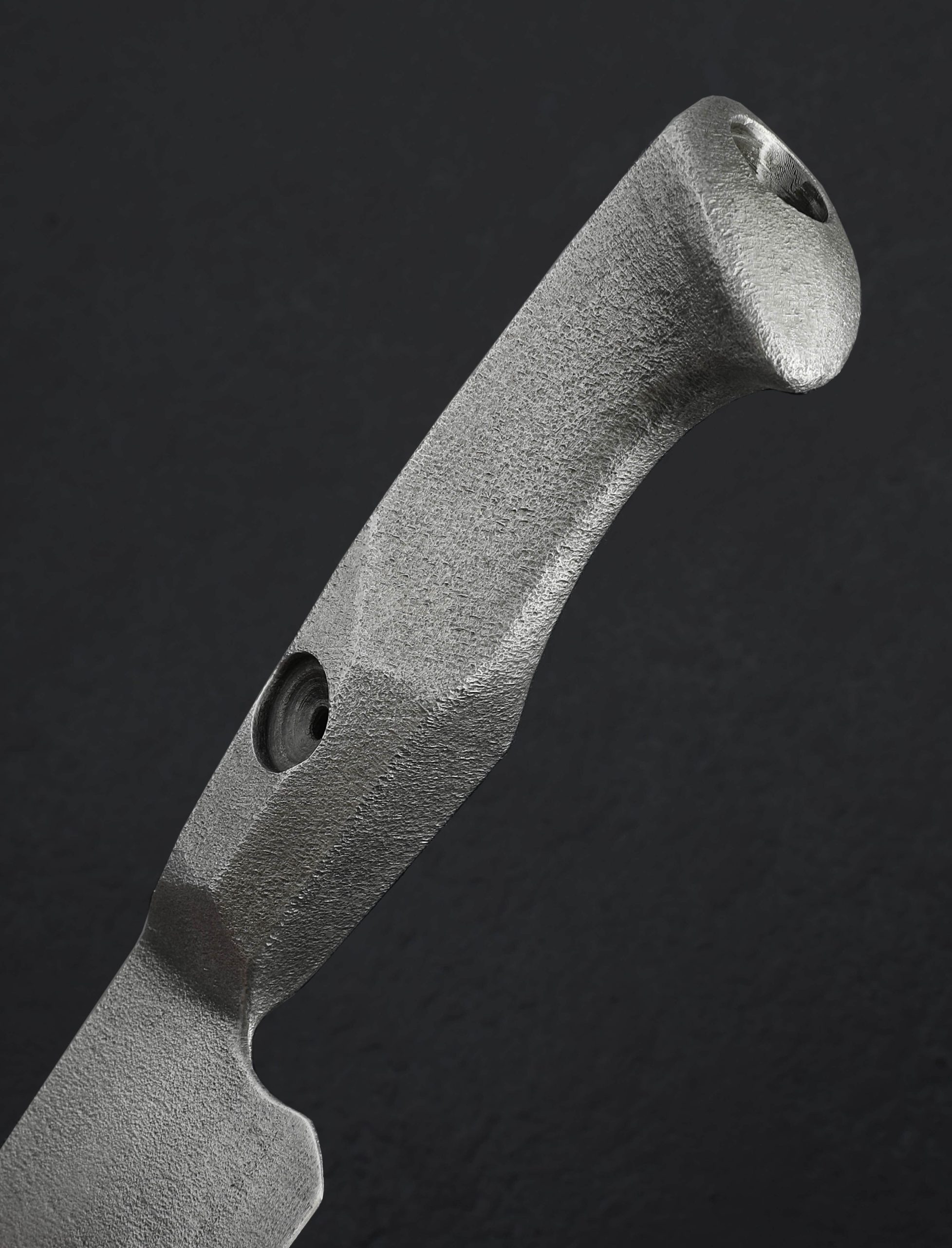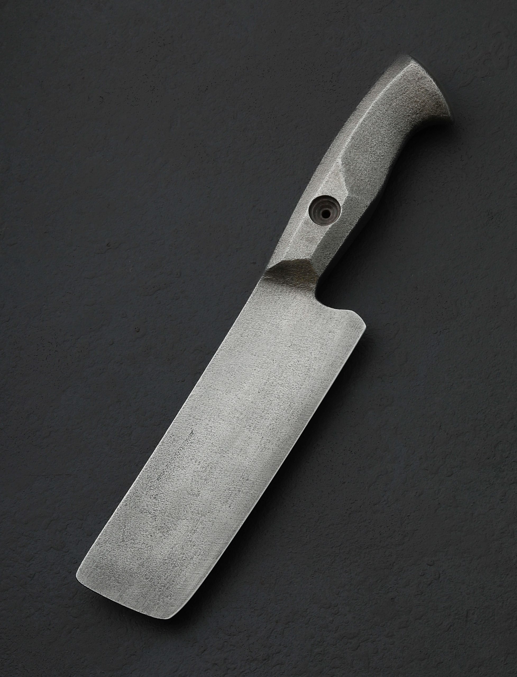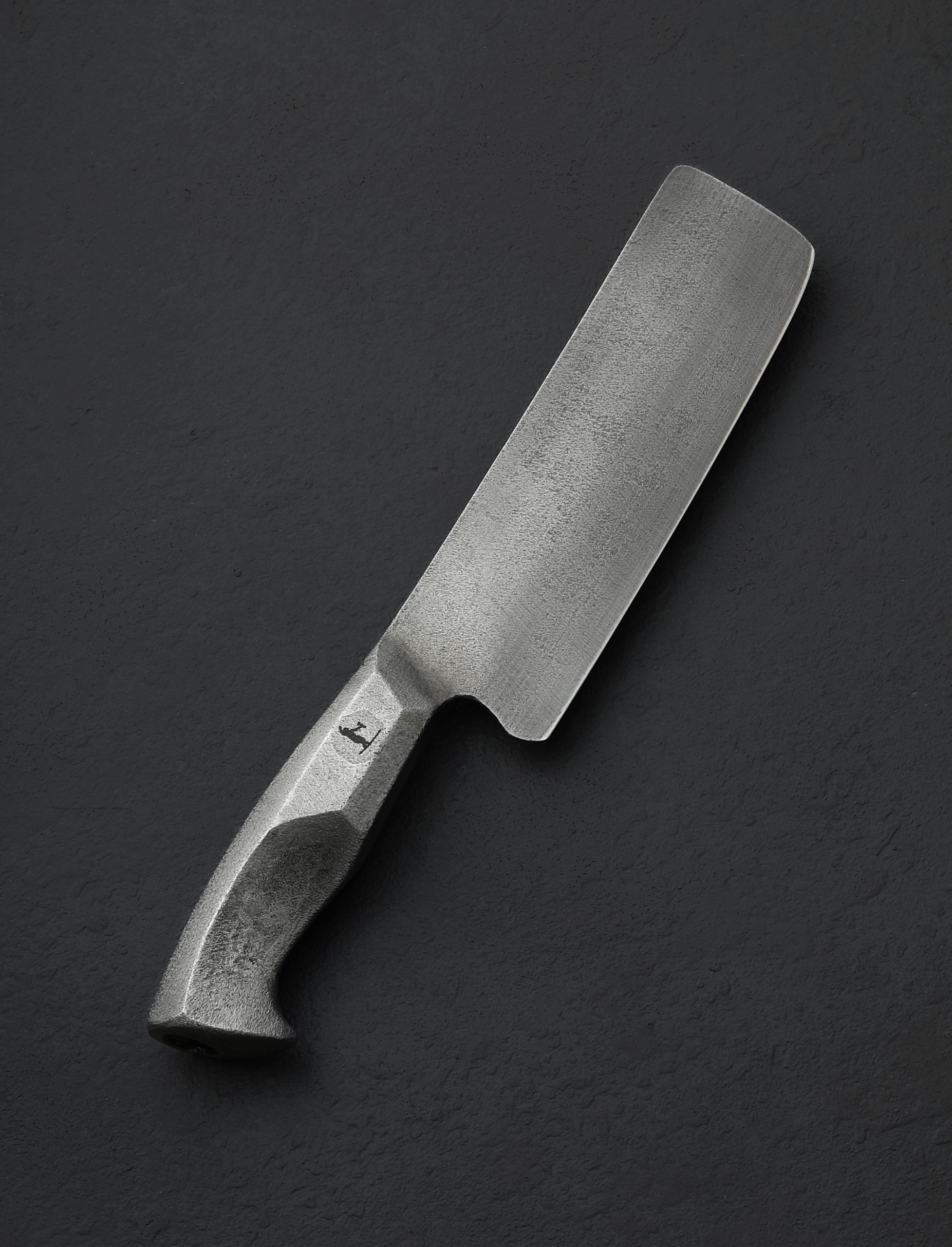 This multi-purpose, hand-forged, one-piece chef’s nakiri by artist Jayden Simisky of Colorado is designed to keep you riding high in the kitchen, chopping herbs and vegetables with pleasure and ease. Jayden begins with a single piece of 80Crv2 high-carbon steel, forging the blade and sculpting the handle for comfort, control, and performance on the butcher block, and a smooth draw between cuts. The 143mm / 5.6″ long blade stands 49mm tall at the heel, shaped for versatility in daily meal preparation, thin, sharp, and hard at the edge beneath tall bevels. The compact overall profile is powerful and rewarding in the hand, with all-steel construction offering a tactile experience not to be missed. We believe every culinary knife can be a conduit to an enlightened state, and Jayden gives that mission fresh energy with his Piper series of kitchen tools.
