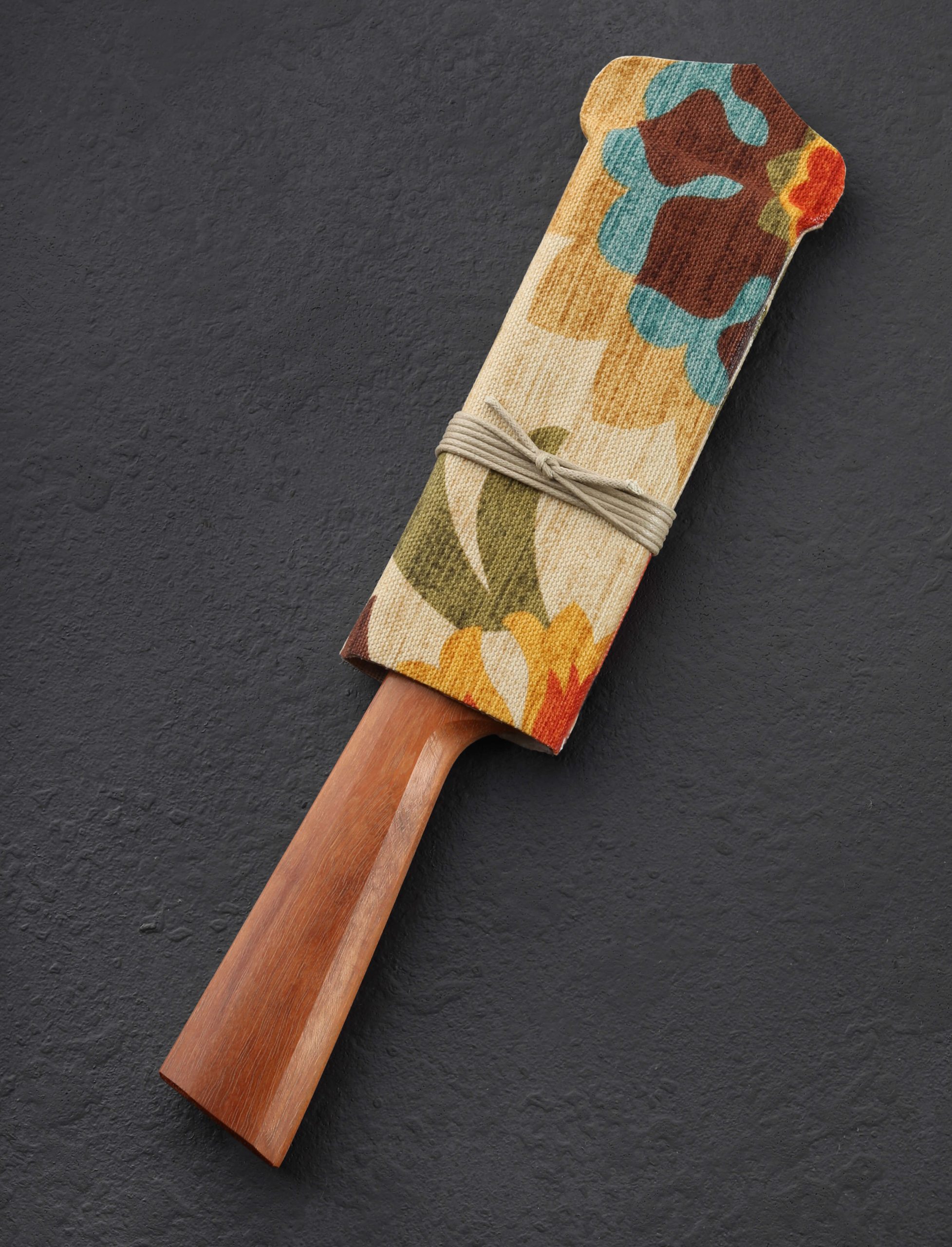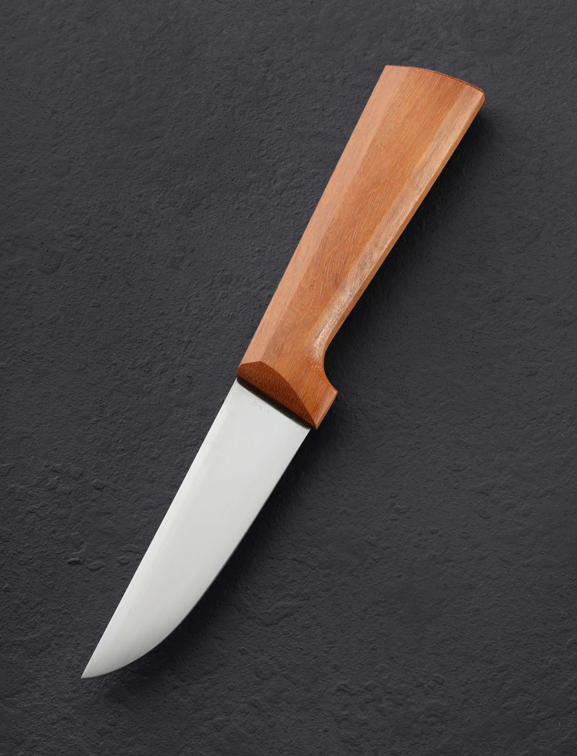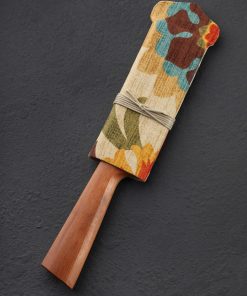 Dressed in handsome, natural mahogany, this Don Carlos Andrade butcher’s knife in his Alsace styling is built for uncompromising performance. Modeled after the French tools of centuries past, Don’s Alsace knives all feature this comfortable, recognizable, hand-filling handle design, especially suited to hard-use knives like this short, tough butcher’s boning knife where a solid grip is crucial for use while trimming and separating meat from bone. For this build, the formally trained chef behind its creation selected CTS-XHP stainless steel, a high carbon, powder metallurgy alloy with high corrosion resistance. Sharp and strong at the edge below his usually superb convex geometry, Don gives the bevels a silky, hand-sanded satin finish below a rounded and polished spine that tapers steadily from handle to tip. A handcrafted cloth-covered saya is included.