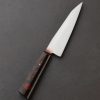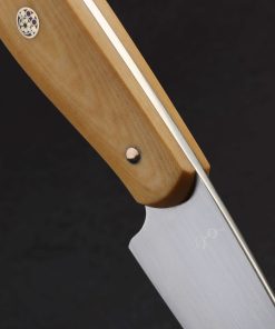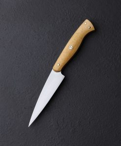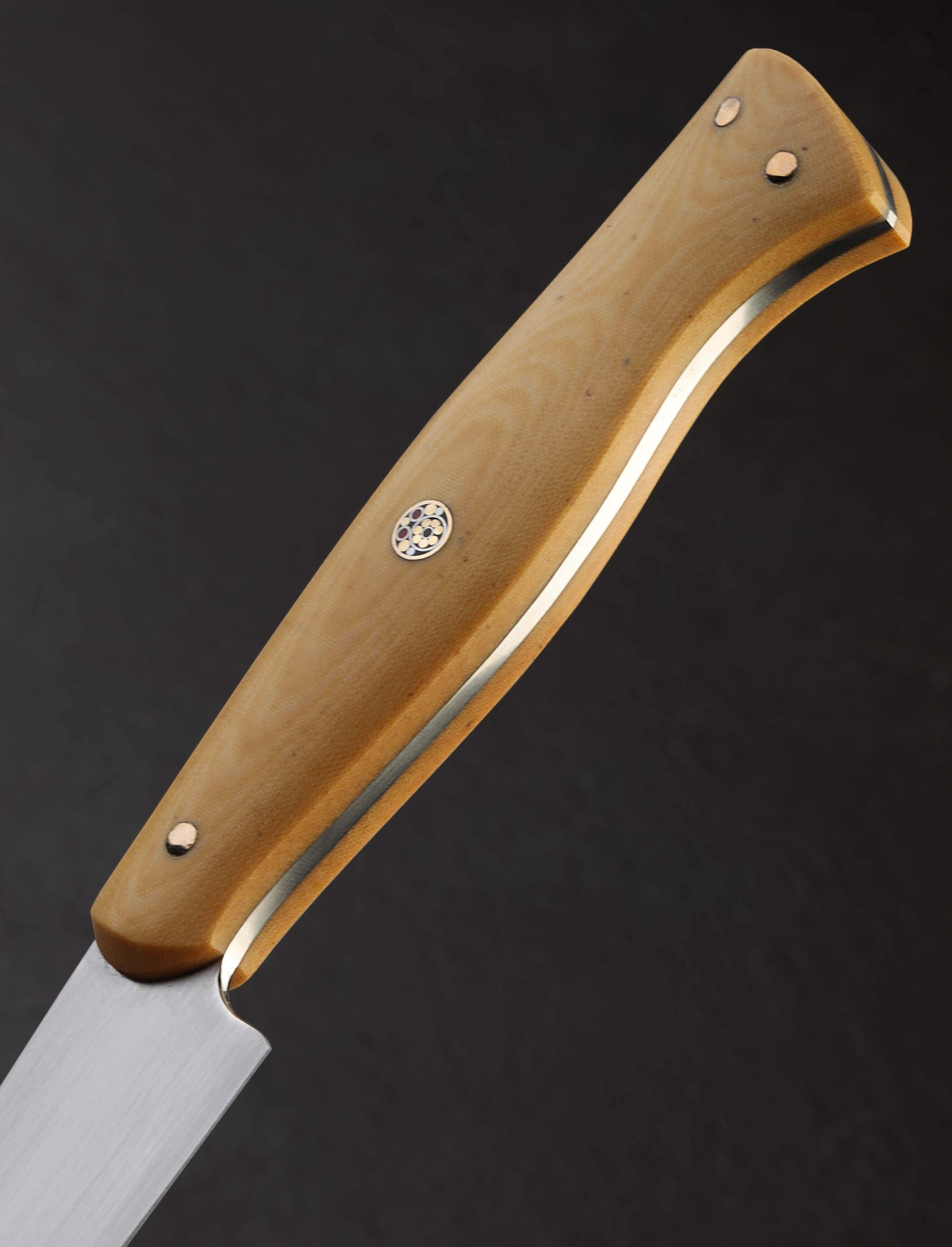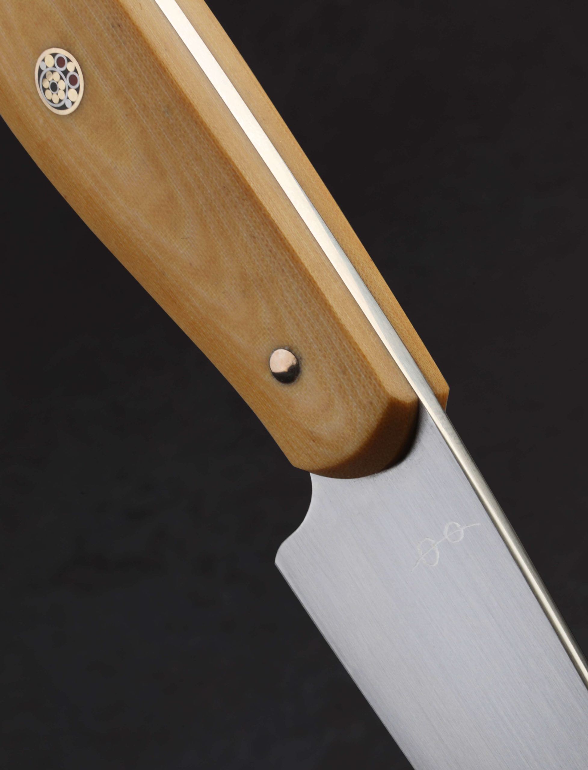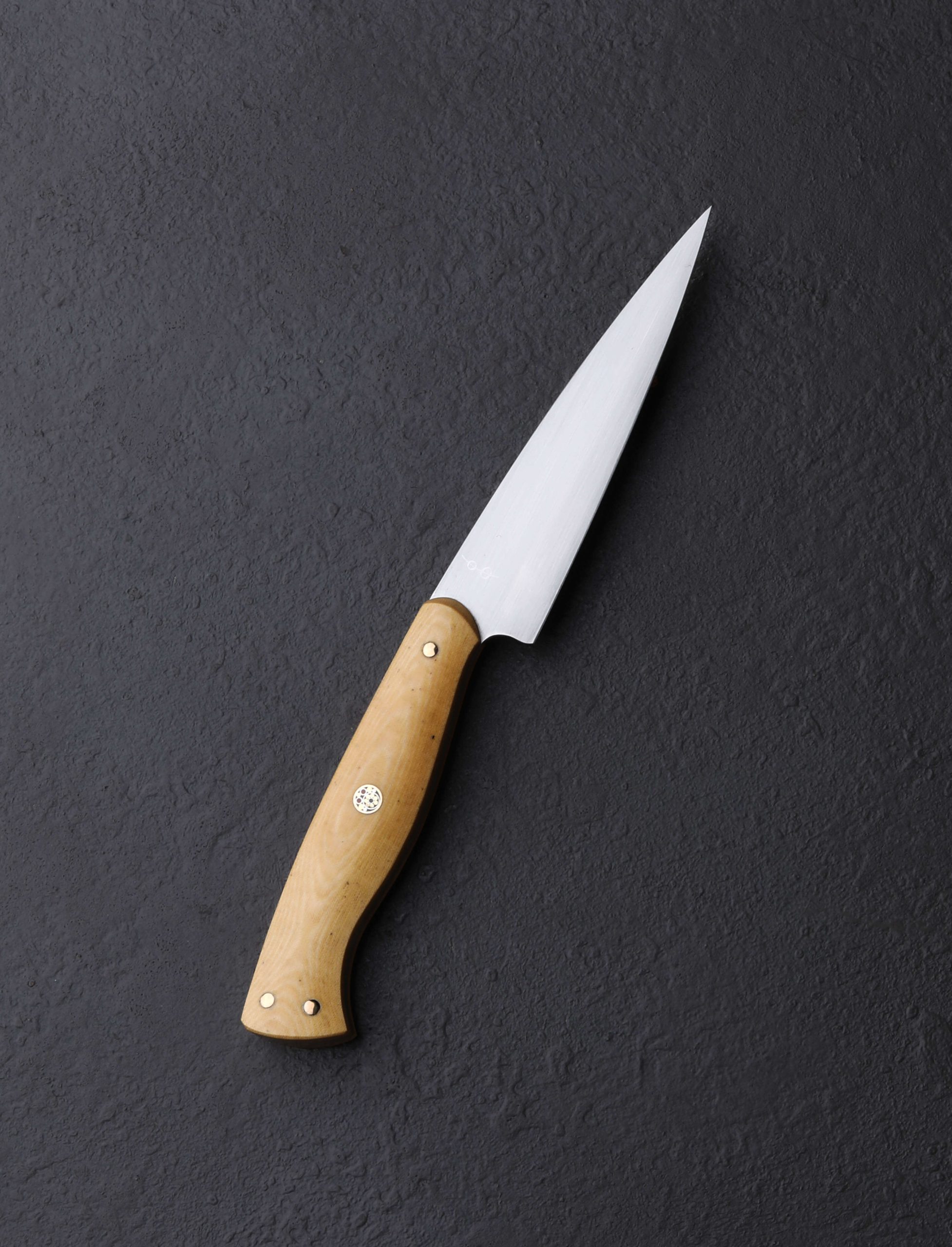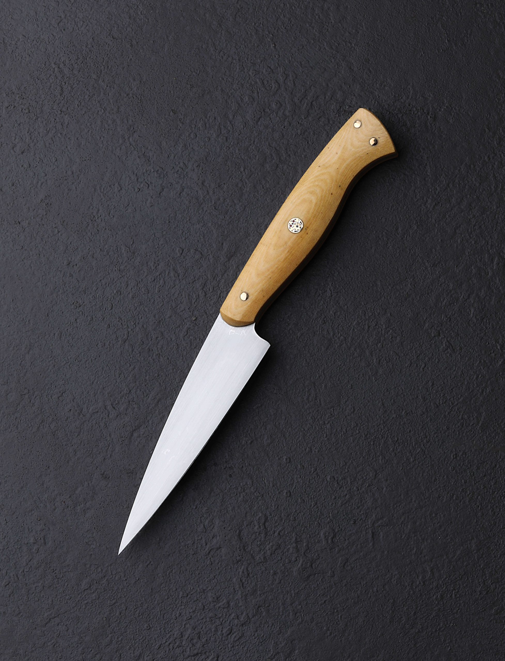 The moment has arrived: Don Carlos Andrade paring knives tend to be rare birds, and this one-of-a-kind build is the first of the 2024 holiday season to grace our collection. Dressed in vintage ‘Oatmeal’ Westinghouse micarta, the sculpted Western style full-tang handle is as comfortable as it is handsome, secured by three hand-peened brass pins and a single, intricate, multi-color mosaic pin in the center. Although it may try to steal the show, the handle is but the conduit to the hard-working blade, shaped from RWL-34 high-performance stainless steel, a blade-specific material made in small batches by Damasteel in northern Sweden. Don gives his pronounced and impressive freehand convex bevels, tough and robust above a thin edge, a silky, hand-sanded satin finish contrasted by the polished and rounded blade spine and choil. The spine tapers steadily forward from 2.5mm out of the handle to an especially fine, needle-like tip designed to perform any number of delicate and detail-oriented cuts. Whether working on the cutting board, or to peel, carve, and perform other handheld work above the board, this outsanding chef’s companion will be there through thick and thin.