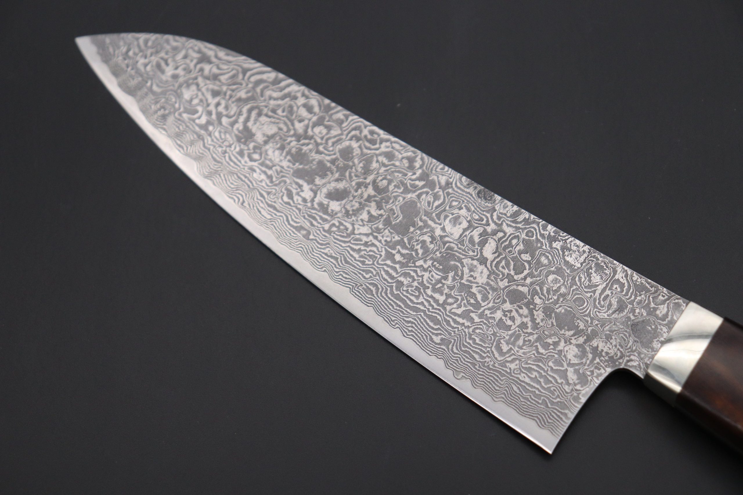Mr. Itou uses R-2 Powdered High Speed Tool Steel for the cutting edge of his knives (HRc. 62) and he also creates the incredibly beautiful and powerful appearance Damascus knives.