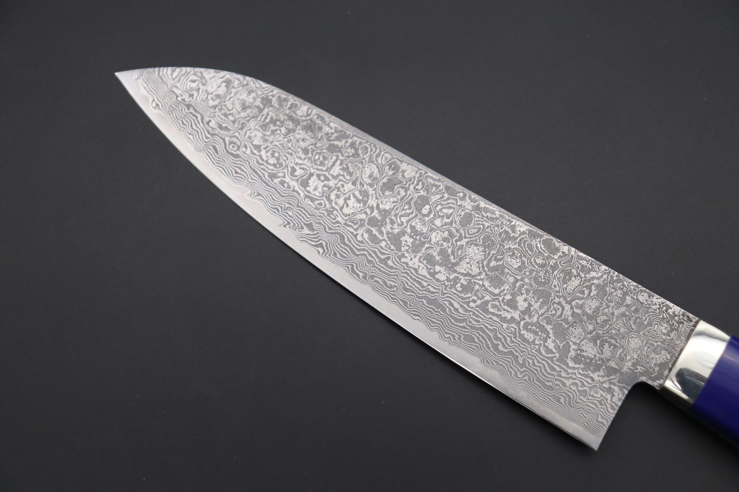 Mr. Itou uses R-2 Powdered High Speed Tool Steel for the cutting edge of his knives (HRc. 62) and he also creates the incredibly beautiful and powerful appearance Damascus knives.
