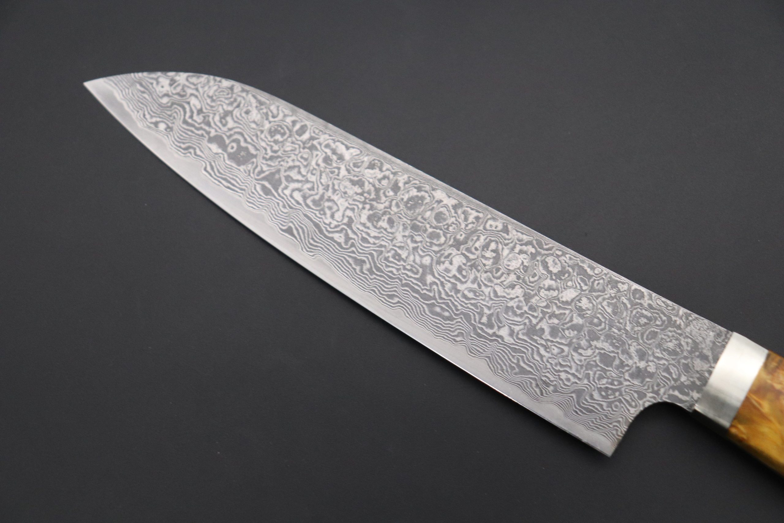 Mr. Itou uses R-2 Powdered High Speed Tool Steel for the cutting edge of his knives (HRc. 62) and he also creates the incredibly beautiful and powerful appearance Damascus knives.
