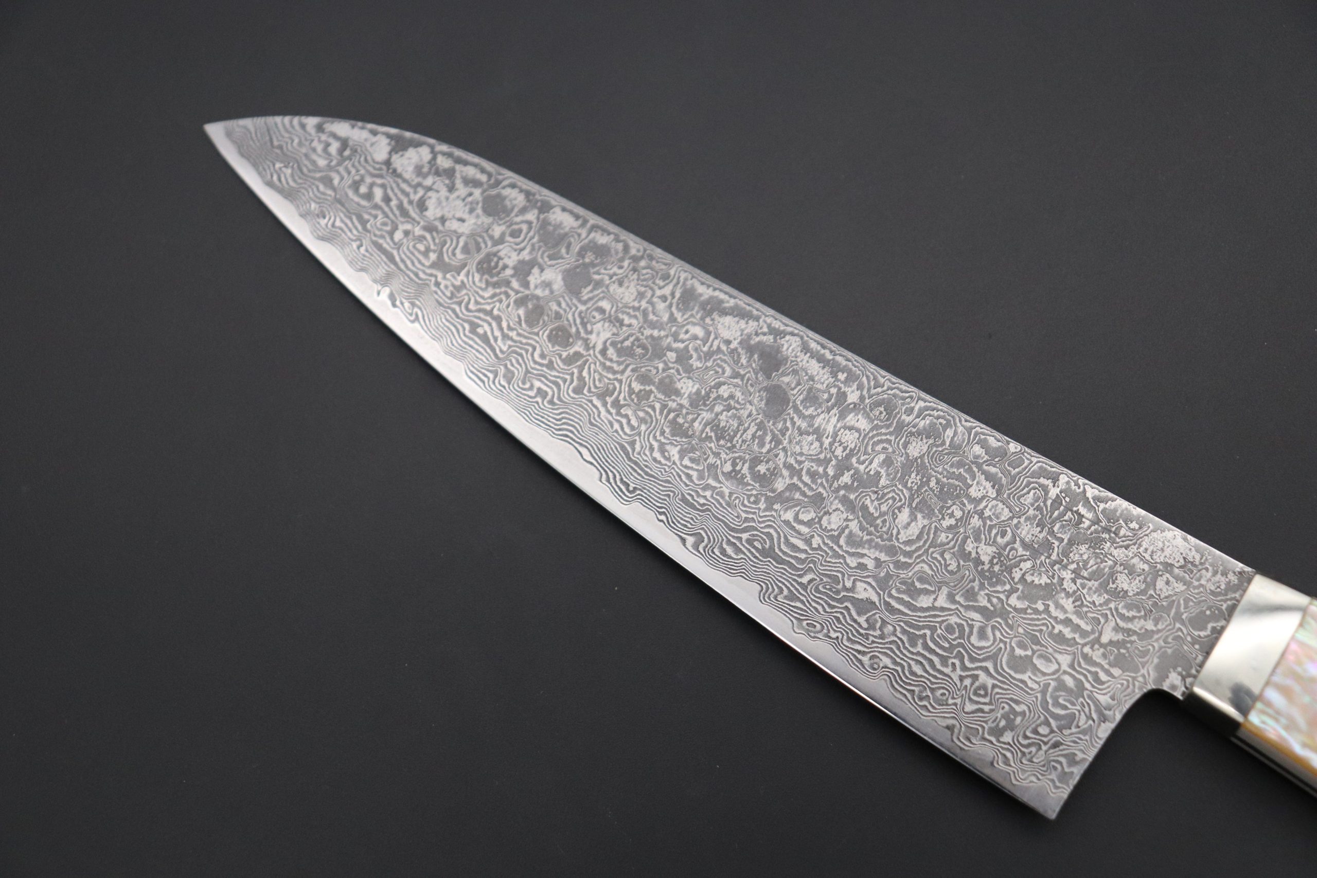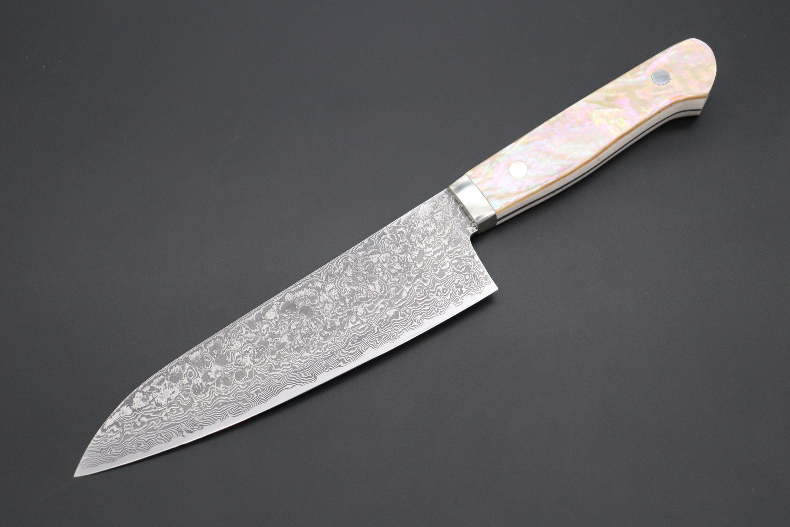 As seen on other expensive full tang custom knives, Mr. Itou hand tapers the blade tang in order to reduce weight and to perfectly balance the blade and handle. He contours and polishes the handle to ensure a perfect grip and an attractive finish. This knife comes with beautiful and good strength, Mr. Itou’s Original White Abalone Handle.