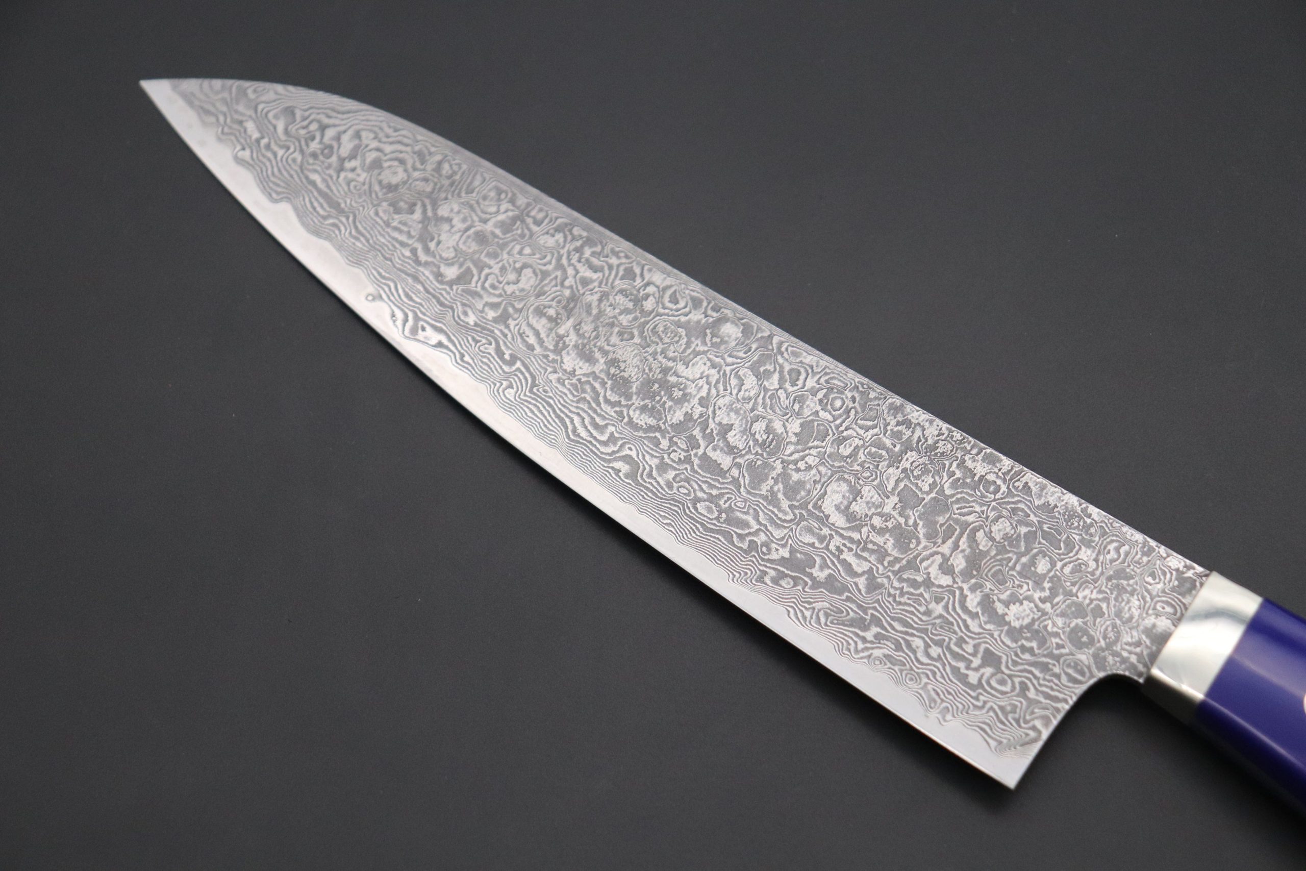 Mr. Itou uses R-2 Powdered High Speed Tool Steel for the cutting edge of his knives (HRc. 62) and he also creates the incredibly beautiful and powerful appearance Damascus knives.