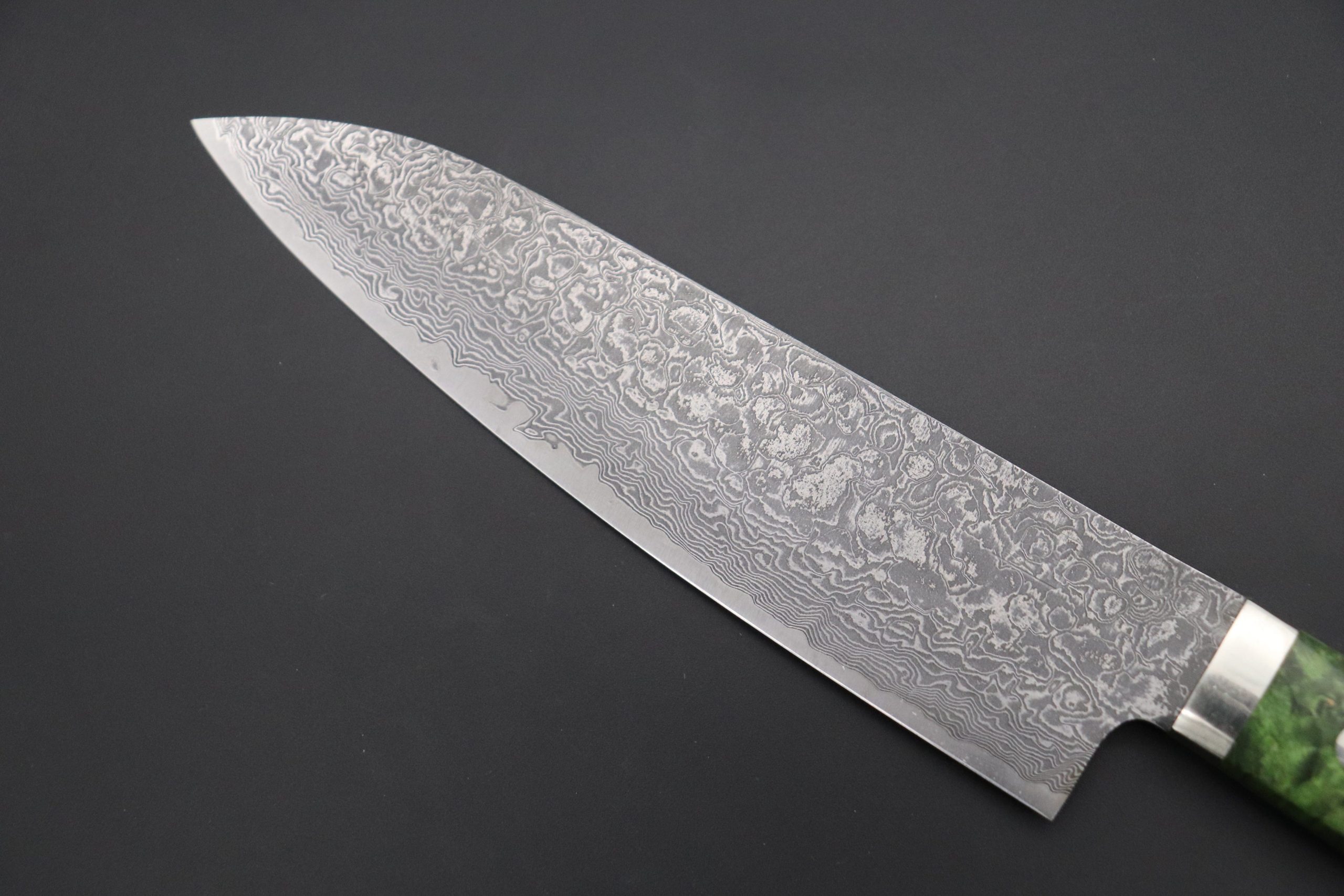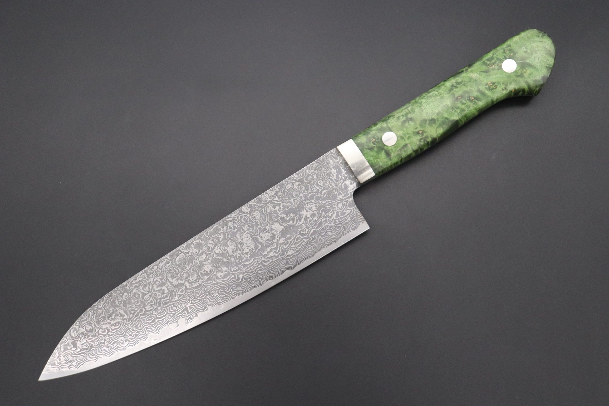 As seen on other expensive full tang custom knives, Mr. Itou hand tapers the blade tang in order to reduce weight and to perfectly balance the blade and handle. He contours and polishes the handle to ensure a perfect grip and an attractive finish. This knife comes with unique natural wood texture and durability of Stabilized Green-Color Maple Burl Wood Handle.