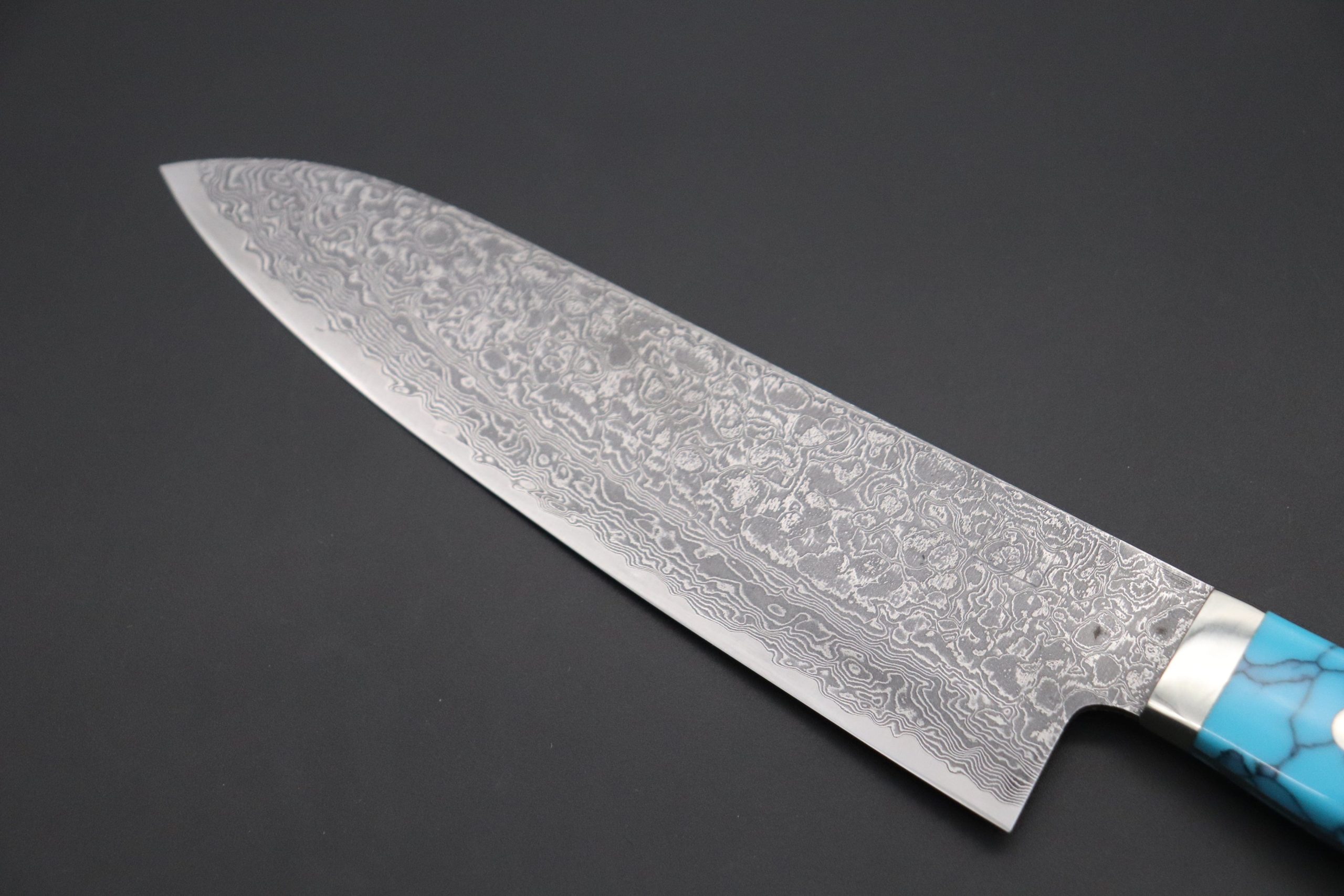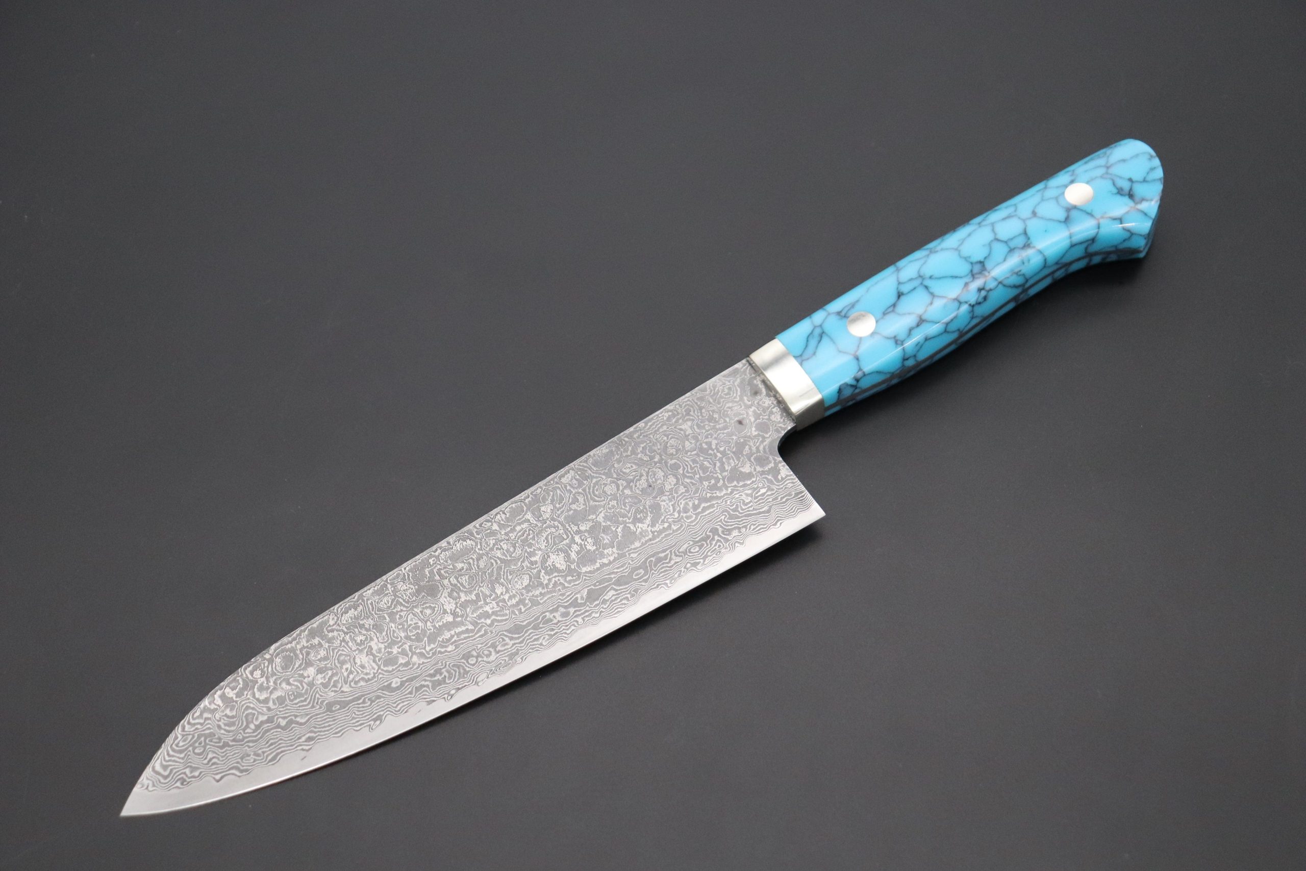 As seen on other expensive full tang custom knives, Mr. Itou hand tapers the blade tang in order to reduce weight and to perfectly balance the blade and handle. He contours and polishes the handle to ensure a perfect grip and an attractive finish. This knife comes with unique and beautiful Turquoise Gem-Composite Stone Handle.