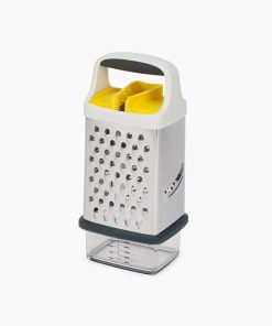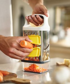 The ultimate box grater designed with a precision food grip for safe and precise slicing and grating. Featuring four razor-sharp, stainless-steel blades for easy, mess-free meal prep.