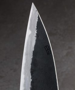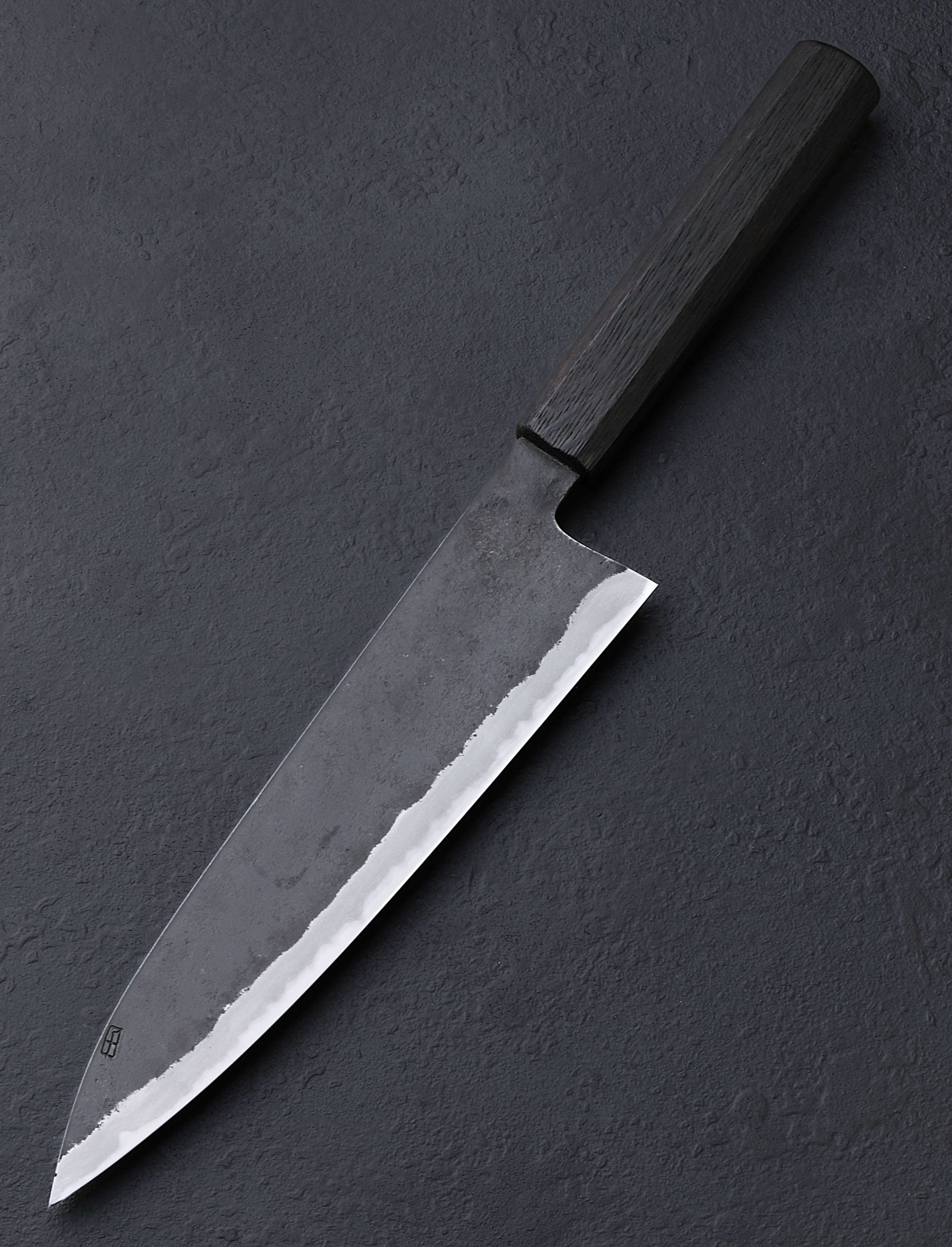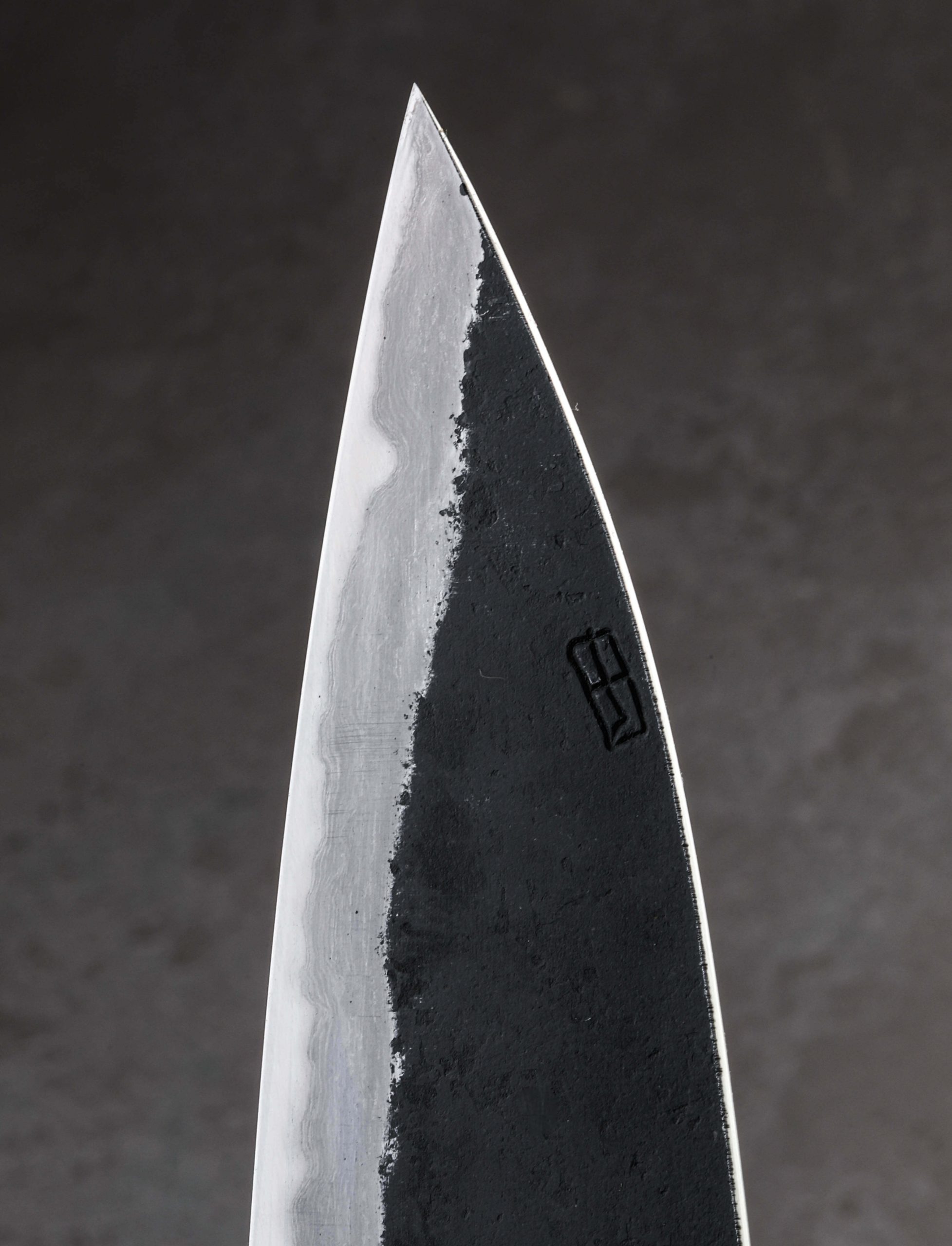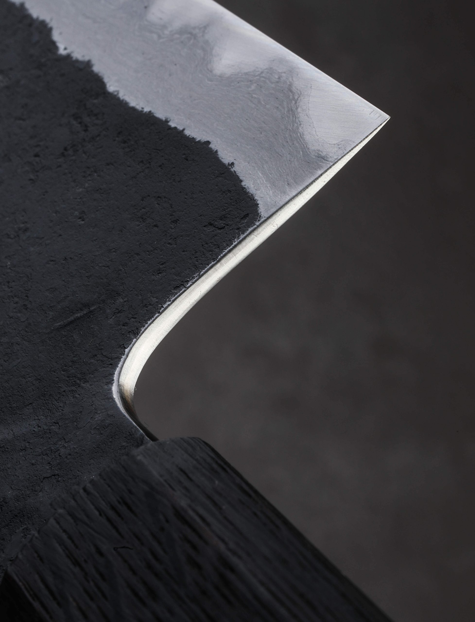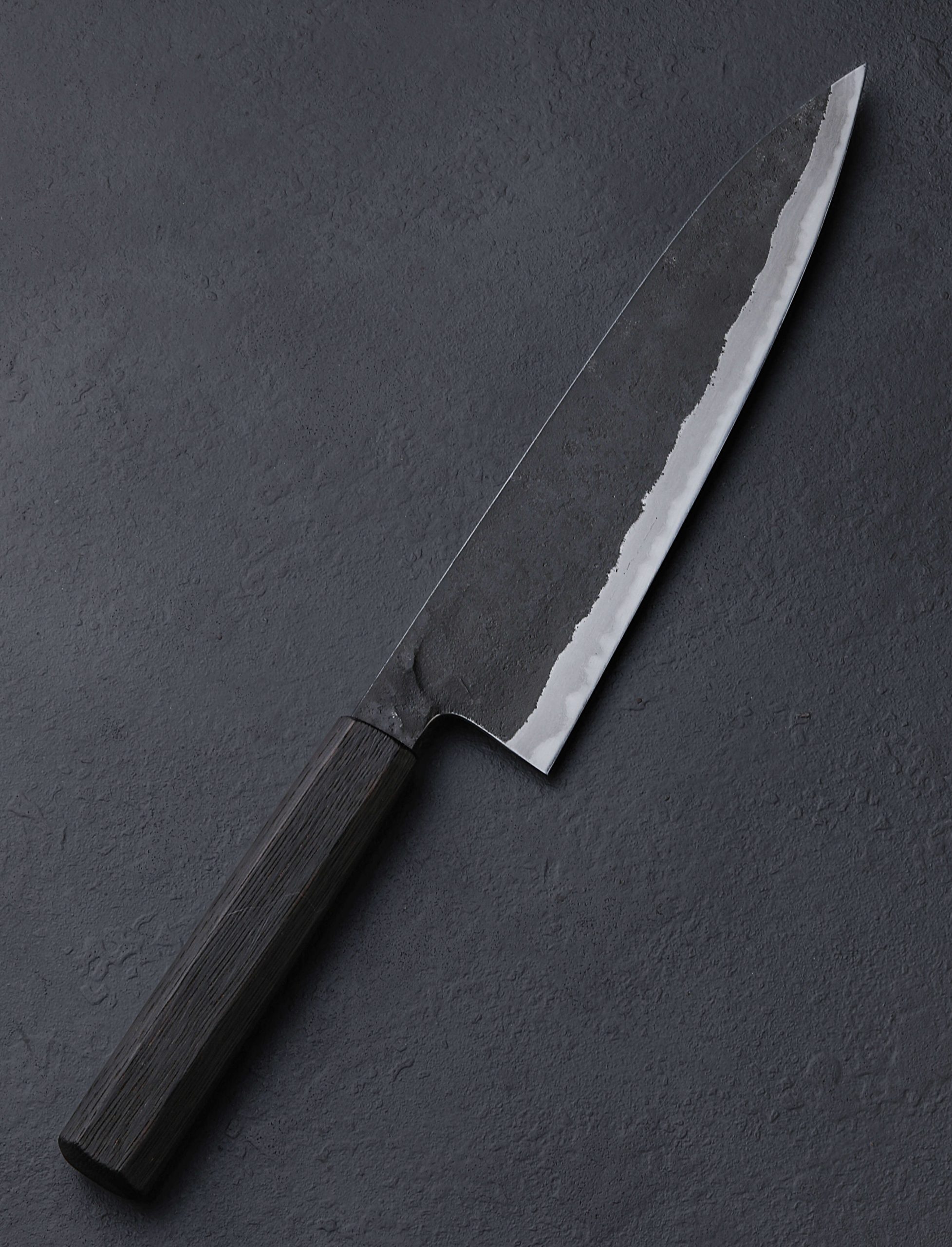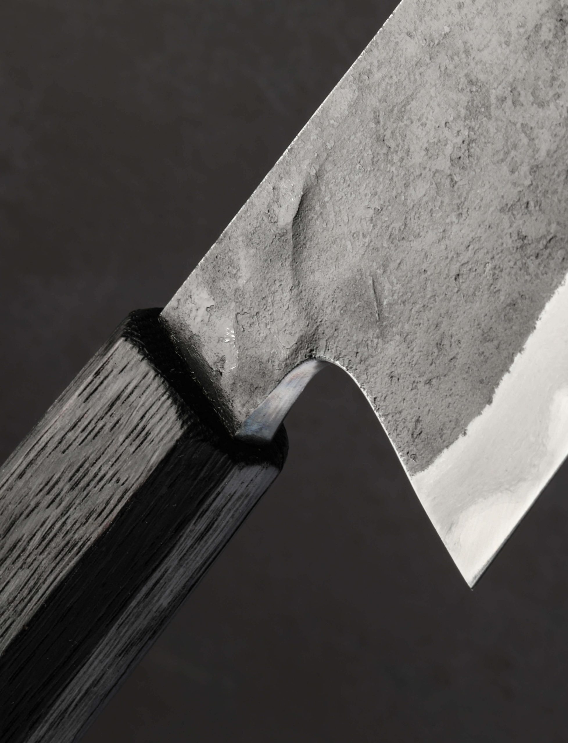 In a first from the Auvergne workshop of bladesmith Bryan Raquin comes a gyuto clad in countless layers of reclaimed wrought iron and XC10 mild steel. For months Bryan worked this material daily, adding a few new folds at a time, producing in the end a bar of material with over one million layers. That’s million, with six zeroes. Enough layers, so tightly packed, that visually distinguishing between the metallic multiplicity is no easy task, yet not impossible. Providing a stiff, hard-working exterior, this impressive cladding material jackets of a core of Bryan’s preferred 145sc (‘super clean’) high-carbon steel, one which was created by his friend in Germany in one, small batch. Baring his well-loved kasumi finish below dark, forge-finished flats, the primary bevels are convex and beautifully honed to produce a balanced and versatile edge that is both thin enough for a high degree of precision, while tough enough for the demands of the fast-moving kitchen. The polished, rounded blade spine tapers steadily from handle to tip where it culminates at a fine, pointed, yet tough tip. Past the blade’s tang that shows the hammer marks of the blade’s hand-forged origins as it disappears into the handle, is a piece of locally sourced, burnt oak, a recognizable sight for anyone familiar with Bryan’s chef’s knives. Hand filling, octagonal, and finished to produce a wonderful, tactile surface, the grip offers comfort and control over the striking, 252mm long by 60mm tall, one-of-a-kind blade.