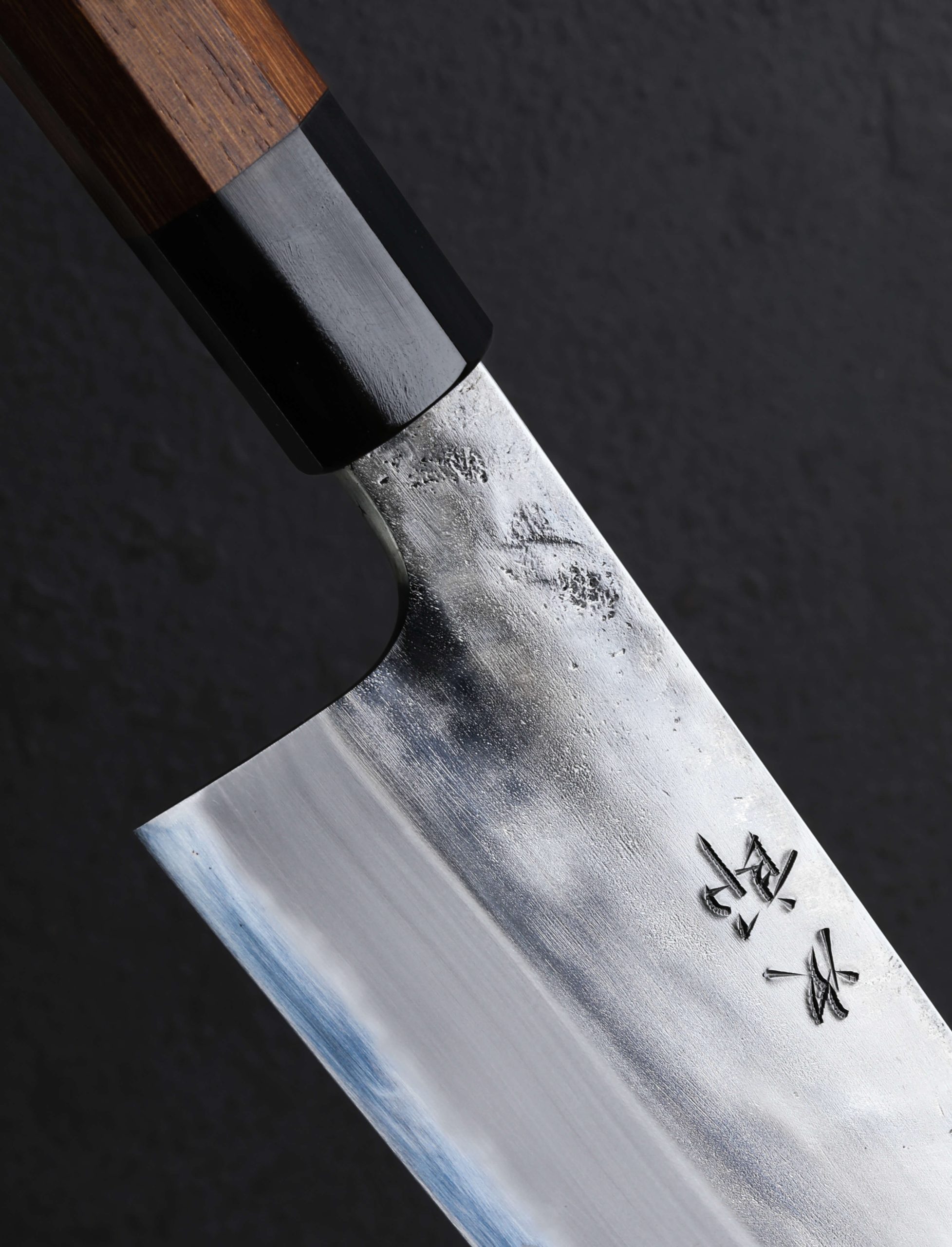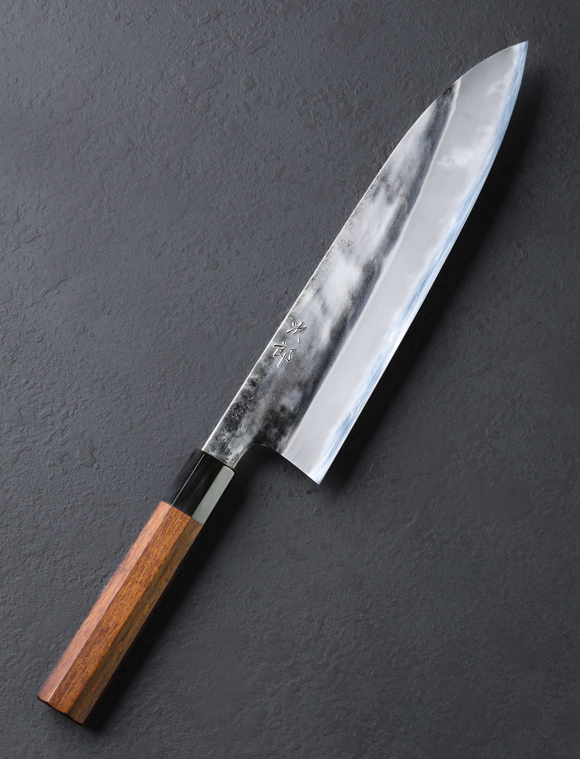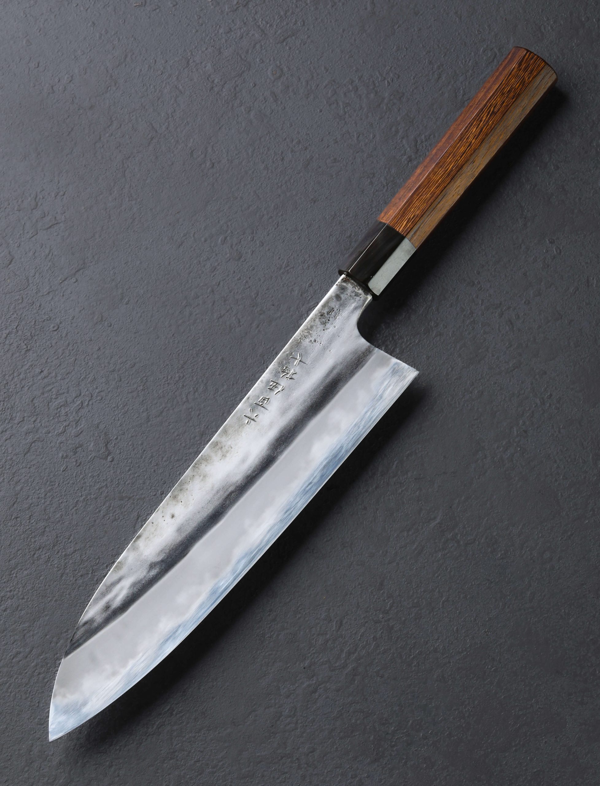 An outsanding culinary tool crafted in Nagano, Japan by the skilled bladesmith Jiro Nakagawa is proudly offered here in pre-owned, unused, like-new condition. This sough-after gyuto is forged by hand from Shirogami White No.1 high-carbon steel san mai to produce a thin, razor sharp, 245mm / 9.6″ edge beneath superbly shaped convex bevels. Standing 57mm tall at the heel with a deep belly and thin, low tip, this large chef’s knife will make a fine kitchen workhorse for even the most discerning cooks. The blade’s spine flares into a wide collar and tang that enters a traditional, octagonal wa handle of Taihei Tagayasan wood with buffalo horn. Original box is included.