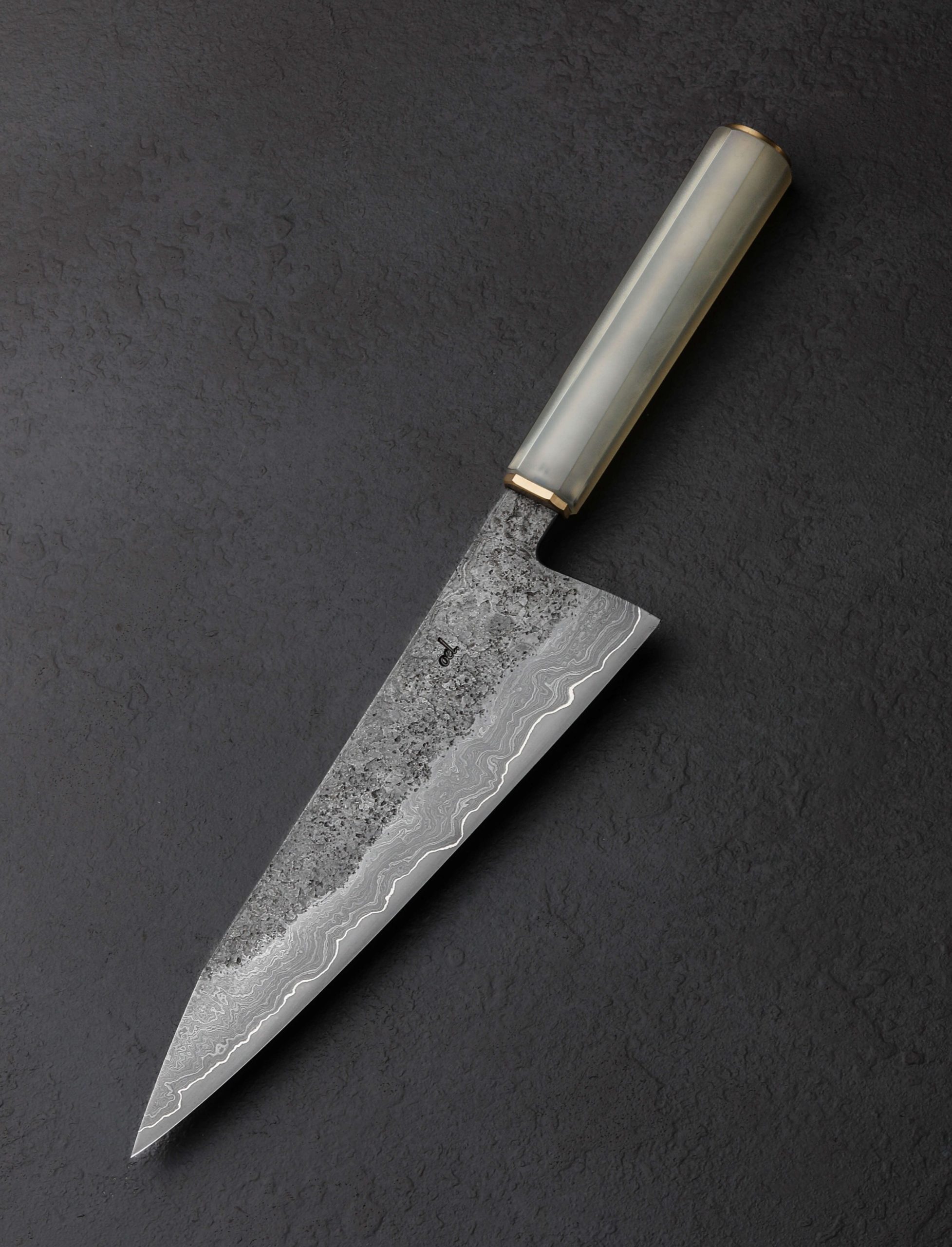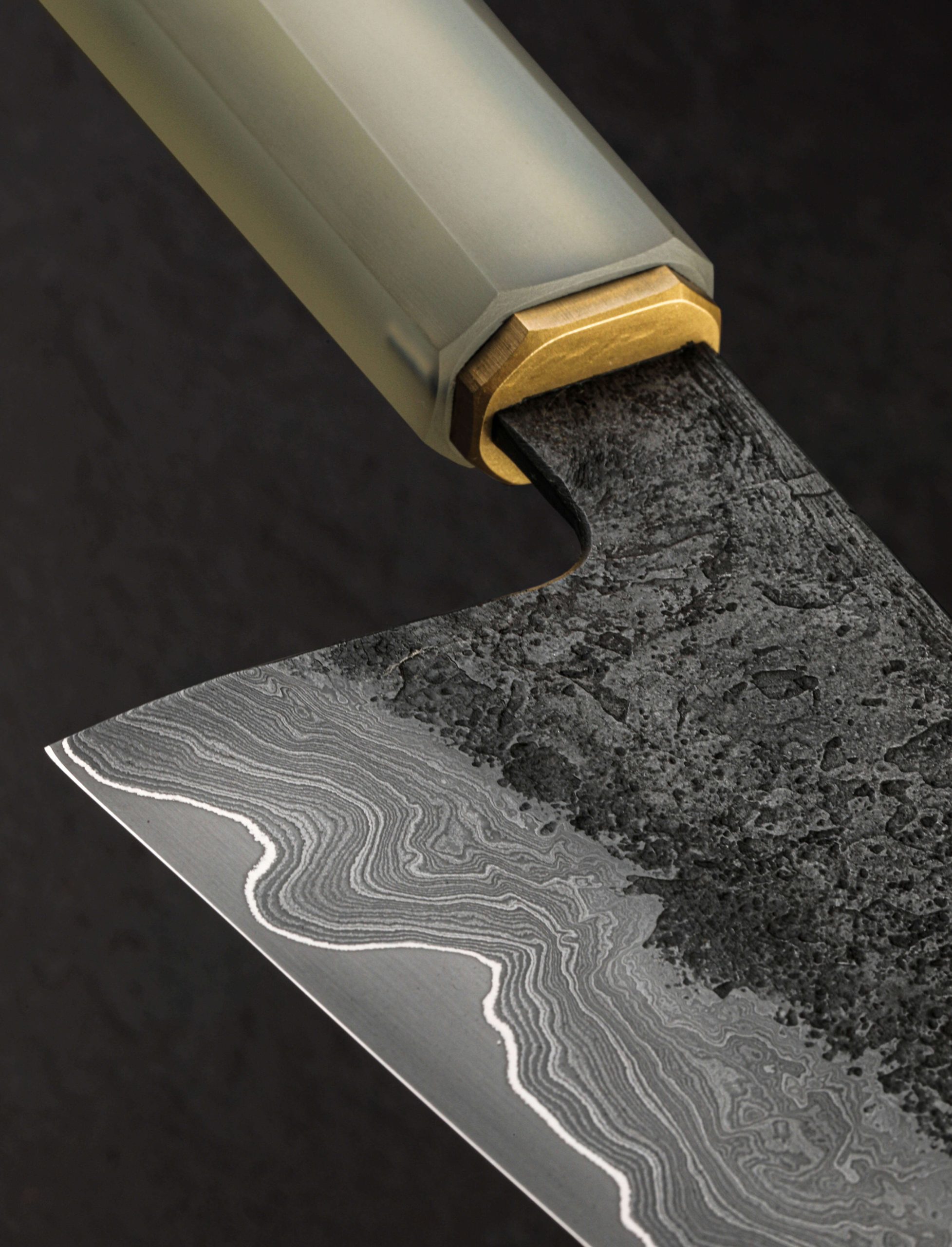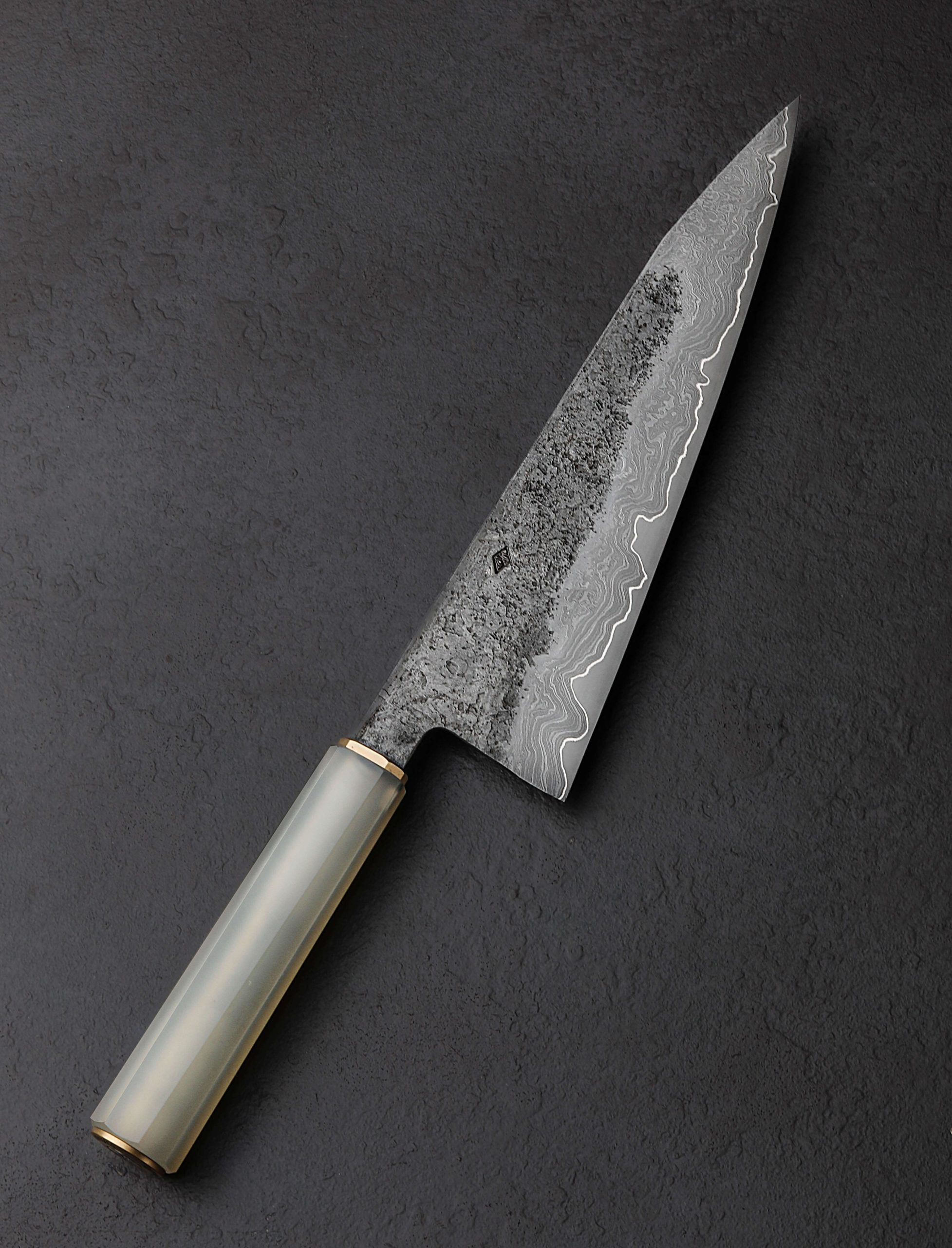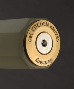 Each build of late by the talented and innovative Oliver Märtens has brought with it new styles, material combinations, and finishes, all while maintaining the outstanding geometry and performance for which his work is known. Those qualities certainly hold true in this head-turning 205mm / 8.1″ gyuto that boasts Oliver’s convex bevels above a razor-thin, hard, and sharp edge, all shaped from a five-layer formula of his making. Oliver first forges a handsome damascus pattern from 1.2842 & 75Ni8 carbon alloys to create the outer cladding; the damascus is then layered over a vein of pure nickel on each side, and finally, between these components, lies the core of ApexUltra tungsten-carbon steel. Thin, lightweight, and quick in the hand, the blade enjoys a spine that slims from 2.8mm above the 58mm-tall heel, to just 1mm an inch from the tip, and further still to a truly glass-thin tip suited for the most delicate and precise slicing jobs. Beneath the spine, faceted on each side for comfort, are forge-finished flats that show the hammer marks of the blade’s hand-hewn origins, with a gorgeous, matte gray forced patina finish throughout the blade’s surfaces. For comfort and control with one-of-a-kind styling, the octagonal wa handle is sculpted from a translucent green composite and capped at the both ends with brass. A titanium locking screw at the rear of the handle allows for its removal in case care and maintenance are needed.