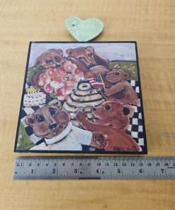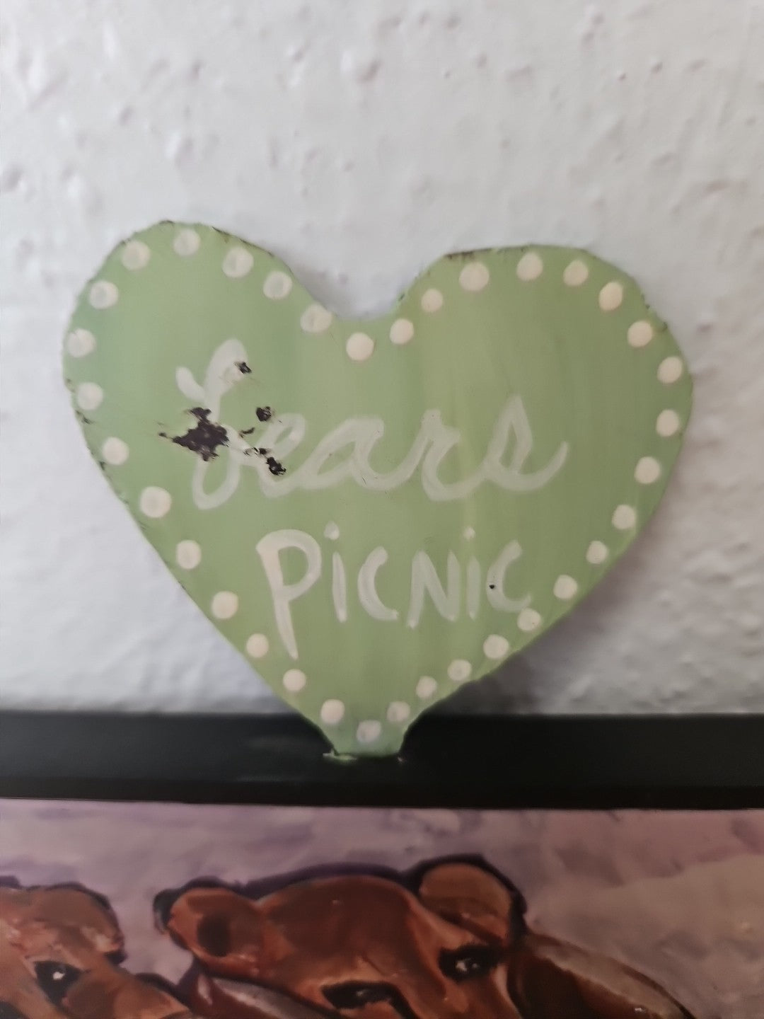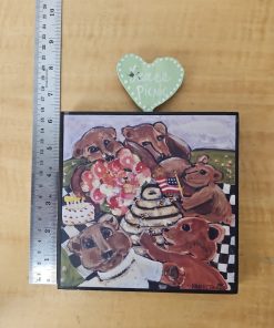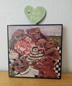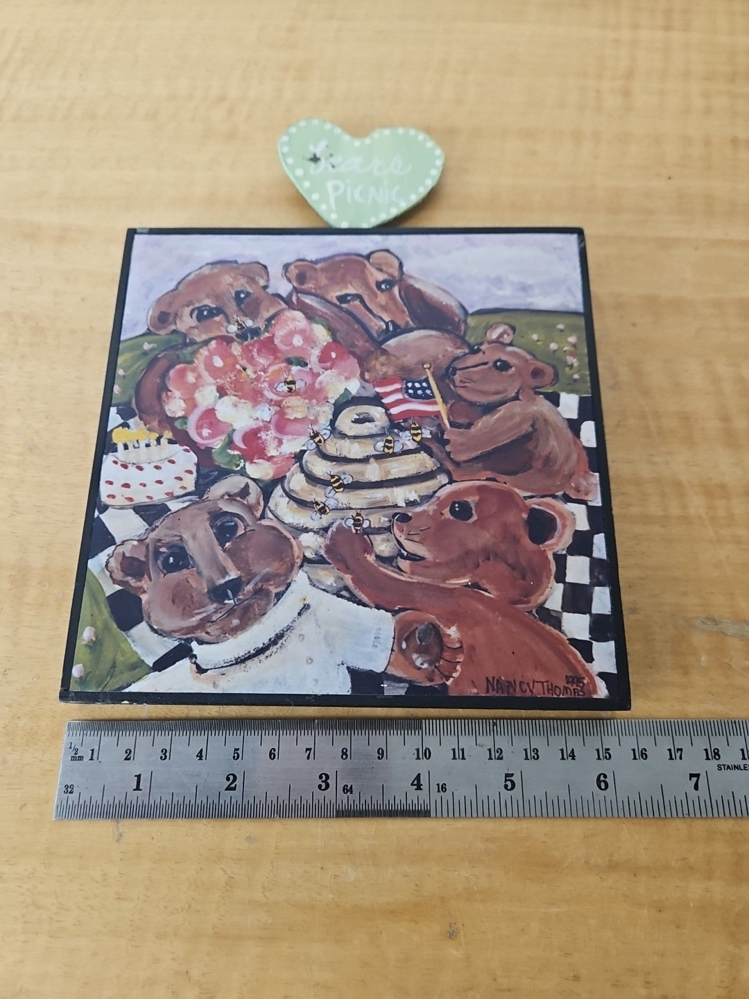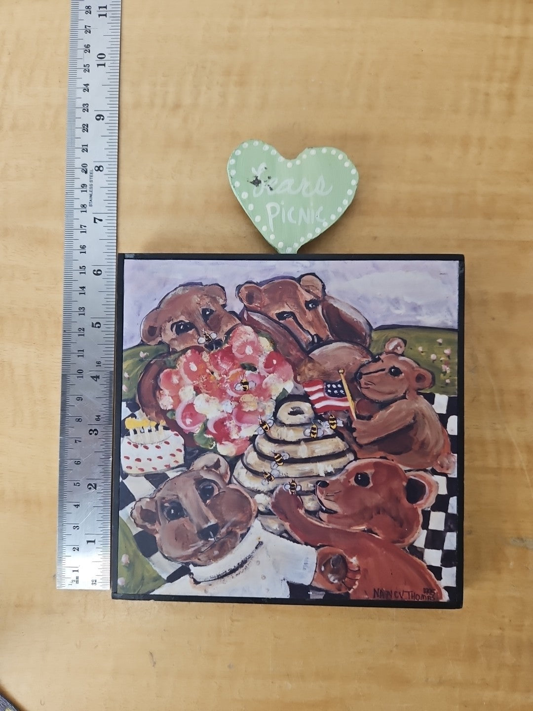 Nancy Thomas Folk Art Wall Plaque ~ BEARS PICNIC flag honey bees, flowers family