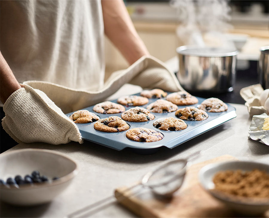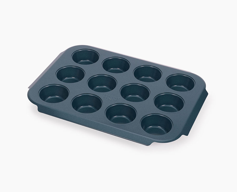 This stackable 12-cup muffin pan features easy-pull handles on the sides to provide a larger gripping point when wearing oven gloves, making it easier and safer to handle.