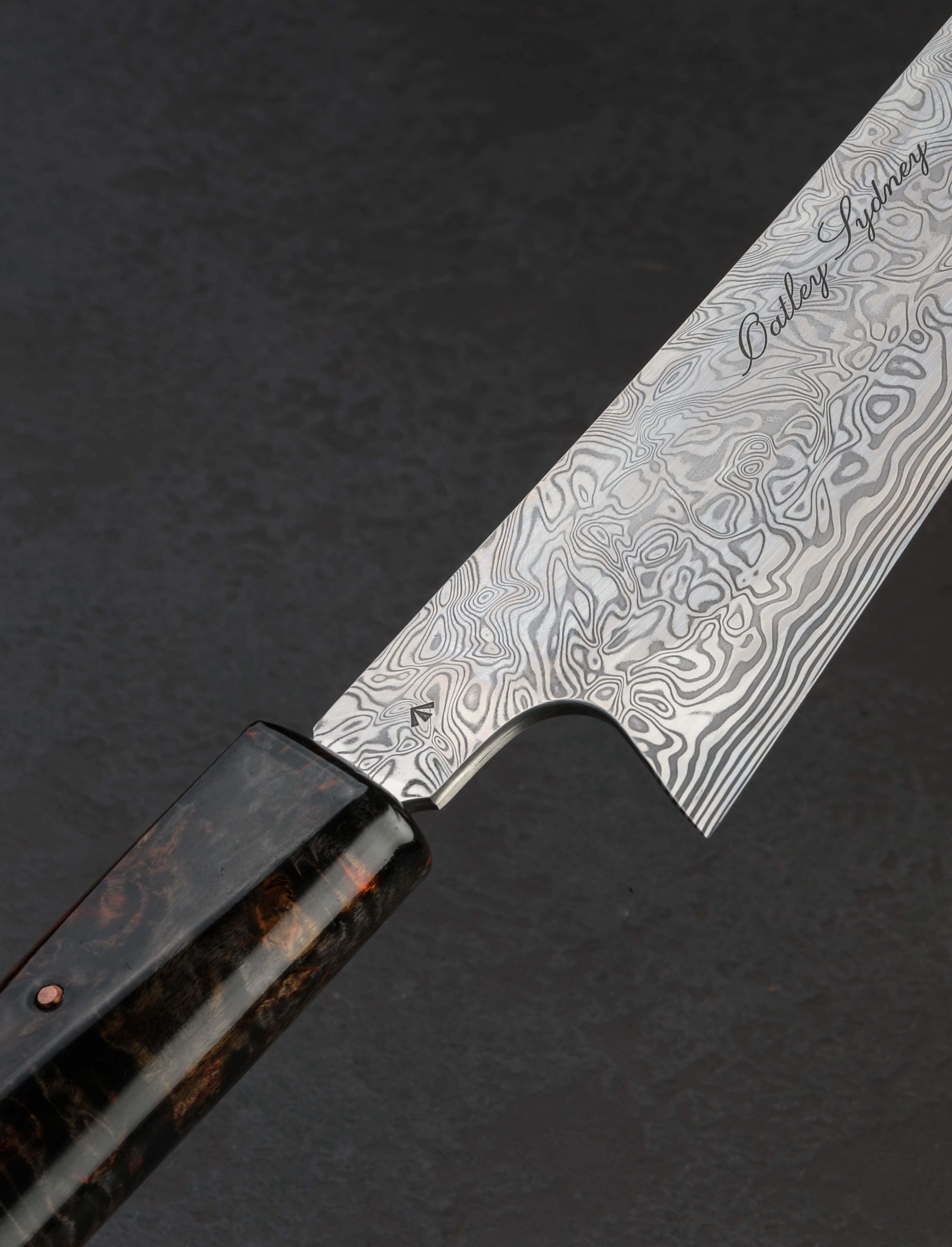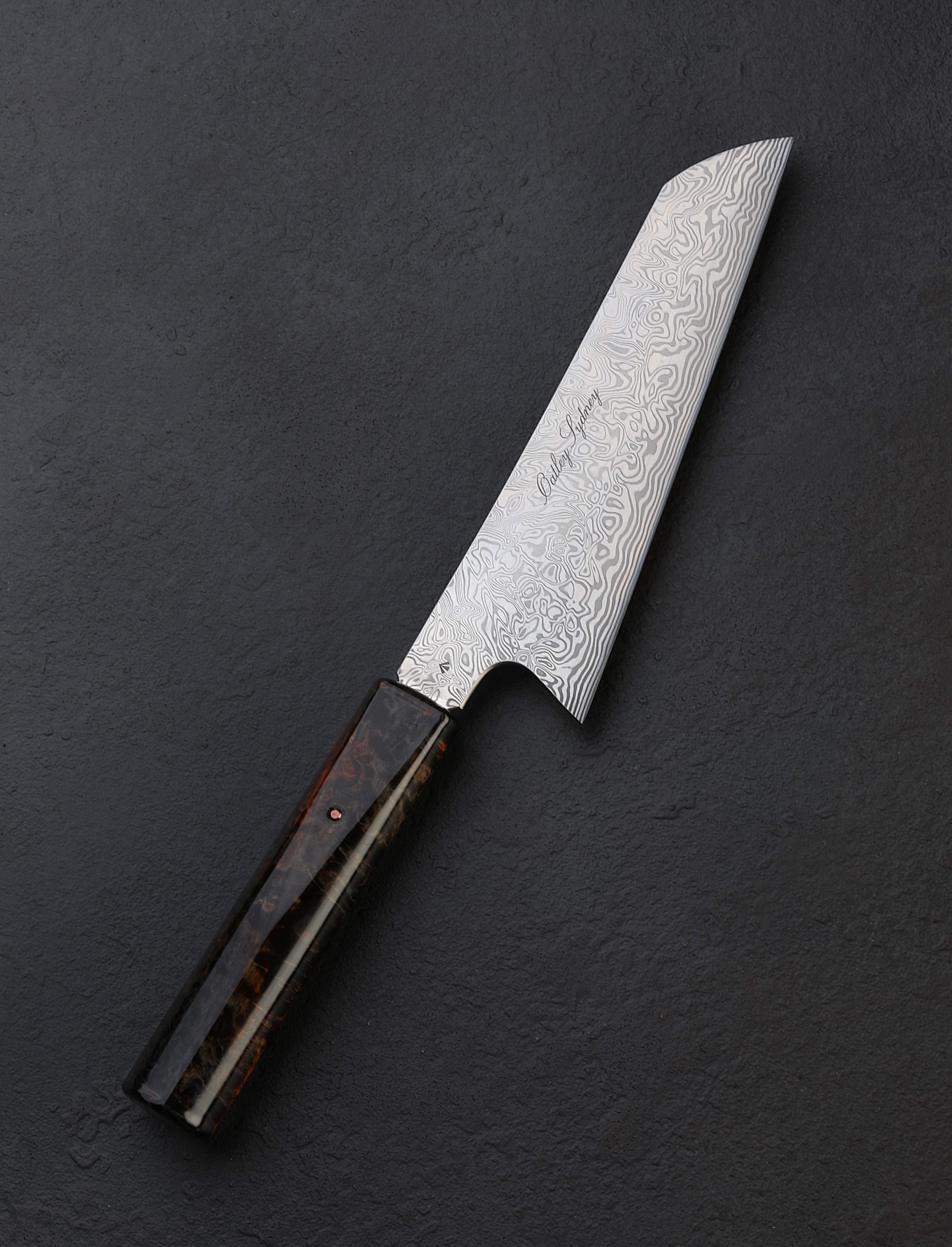 Behold the final offering from a small collection of superb gyutos by James Oatley, each of which features a versatile, workhorse blade of polished and etched Vinland pattern Damasteel stainless damascus and a unique handle of double-dyed stabilized maple. With a single copper pin, the wa-style handle in James’ well loved, symmetrical D-shape profile is removable in case care and maintenance are needed. Razor sharp along a near-zero edge, the 178mm / 7″ blade is designed to perform every task in the home or professional kitchen. Short, symmetrical bevels feature pronounced convex geometry that balances toughness and durability for the most demanding work, with finesse and precision, especially at the slim tip and heel, all in a size and profile suited to nearly every cut, every meal. Made in small batches in Sweden, the Damasteel stainless damascus is a high-performance, blade-specific material that boasts a high hardness, the beauty of patterned steel, and the ease of care usually reserved for simpler stainless alloys. With its Night Fire maple handle grain and color, this last build from James’ Sydney, Australia studio will set any kitchen aflame.