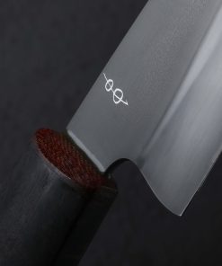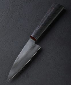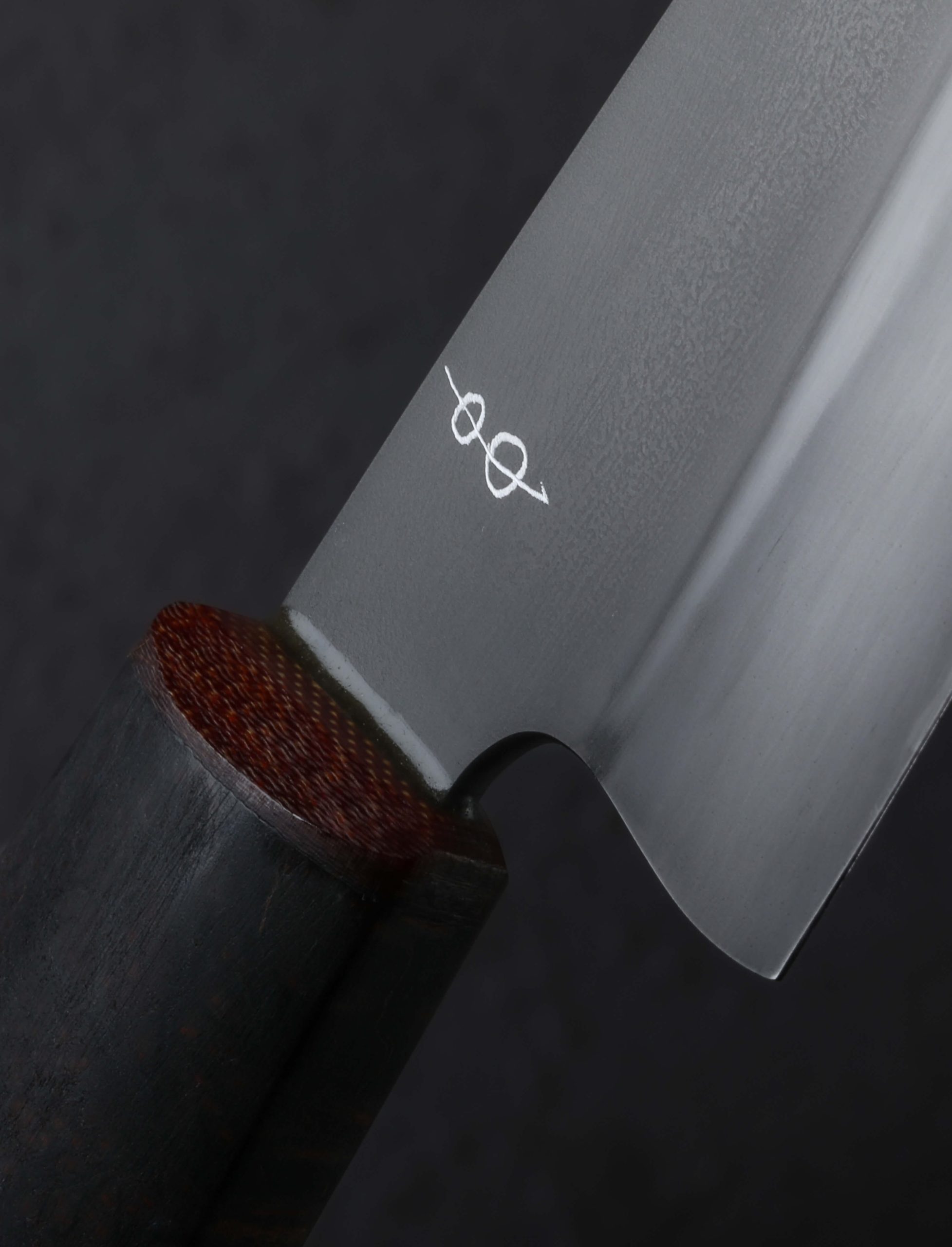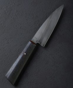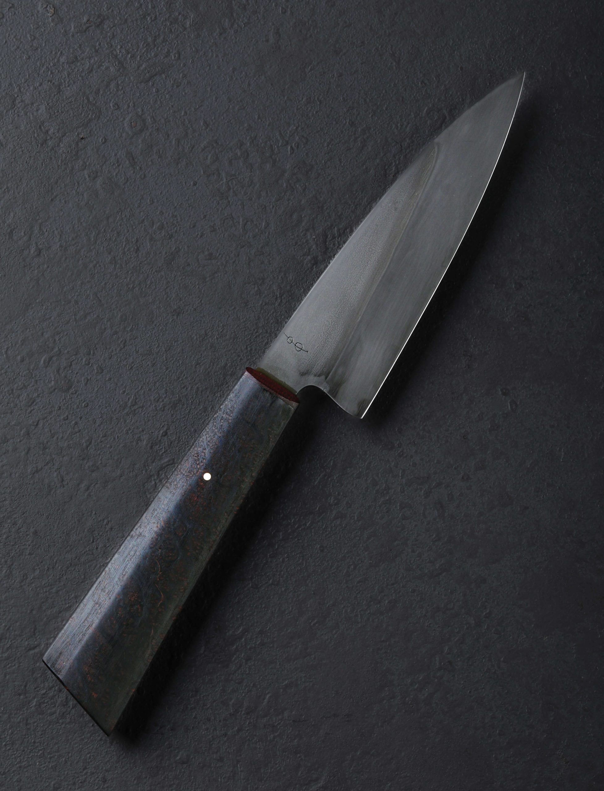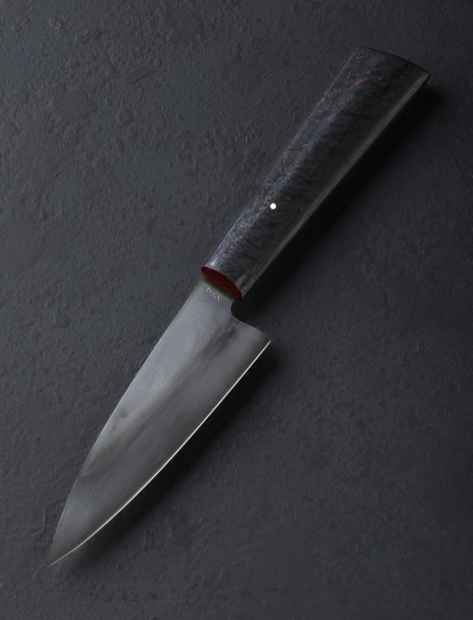 If ever there were a chef’s knife in a size, profile, and material combination suited to virtually every cut on the home kitchen’s cutting board, it’s the Dark Night Petty by California bladesmith Don Carlos Andrade. As a formally trained chef and artist-knifemaker of over 20 years, this is exactly the kind of versatile, hardworking tool Don is known for, all in an heirloom-quality package. For the 135mm / 5.3″ blade, 26c3 “spicy white” high-carbon steel is used, a clean, all-business alloy prized for its fine grain structure, hard, sharp edge, and ease of sharpening. With Don’s superb, freehand convex bevel geometry, a thin yet tough edge, and full-distal taper along the spine to a pointed tip, every ingredient is in play no matter the meal being prepared. A two-tone, foggy matte gray finish is a result of the carefully calibrated differential heat treatment and hardening process for which which Don is known. A hand-sanded satin finish and etch reveal the technique’s quench line. Control over the 39mm-tall blade is enjoyed via a handle of redwood, capped with a burgundy G7 laminate ferrule and secured with a single, flush, bronze pin. The handle’s form is that of the artist’s well loved shield-style wa rendition that sees a tall, tapering profile becoming slimmer toward the font, rounded along the sides, with flat faces on top and bottom.