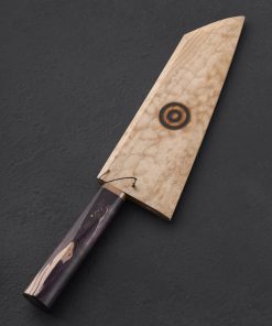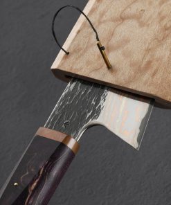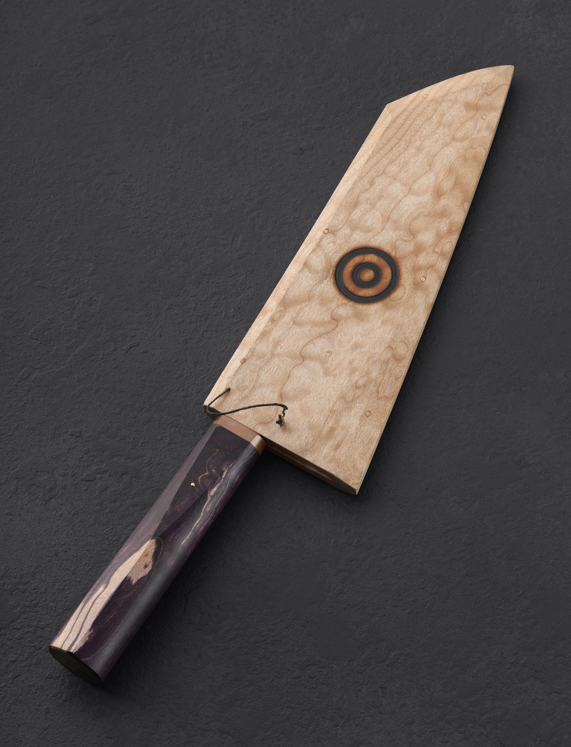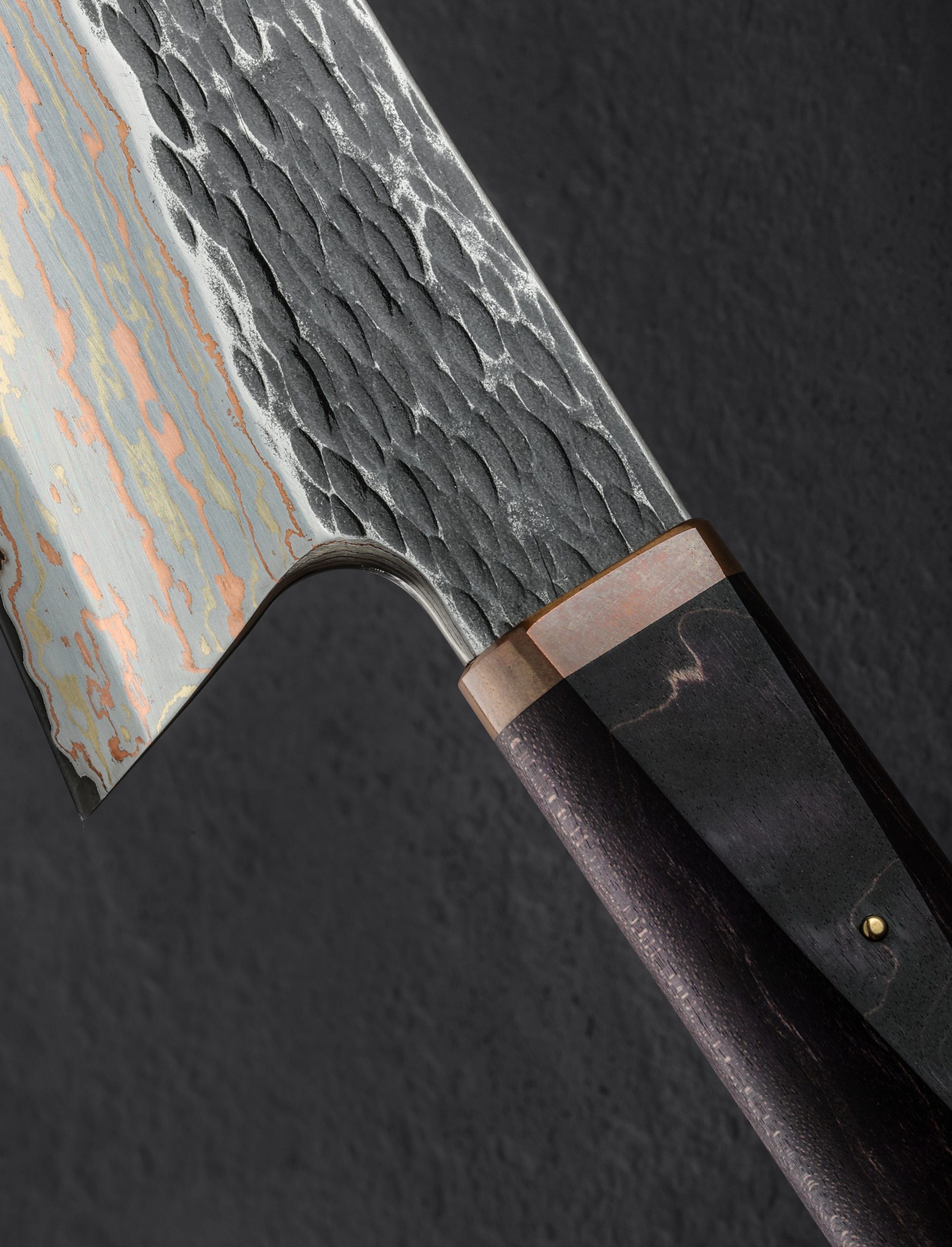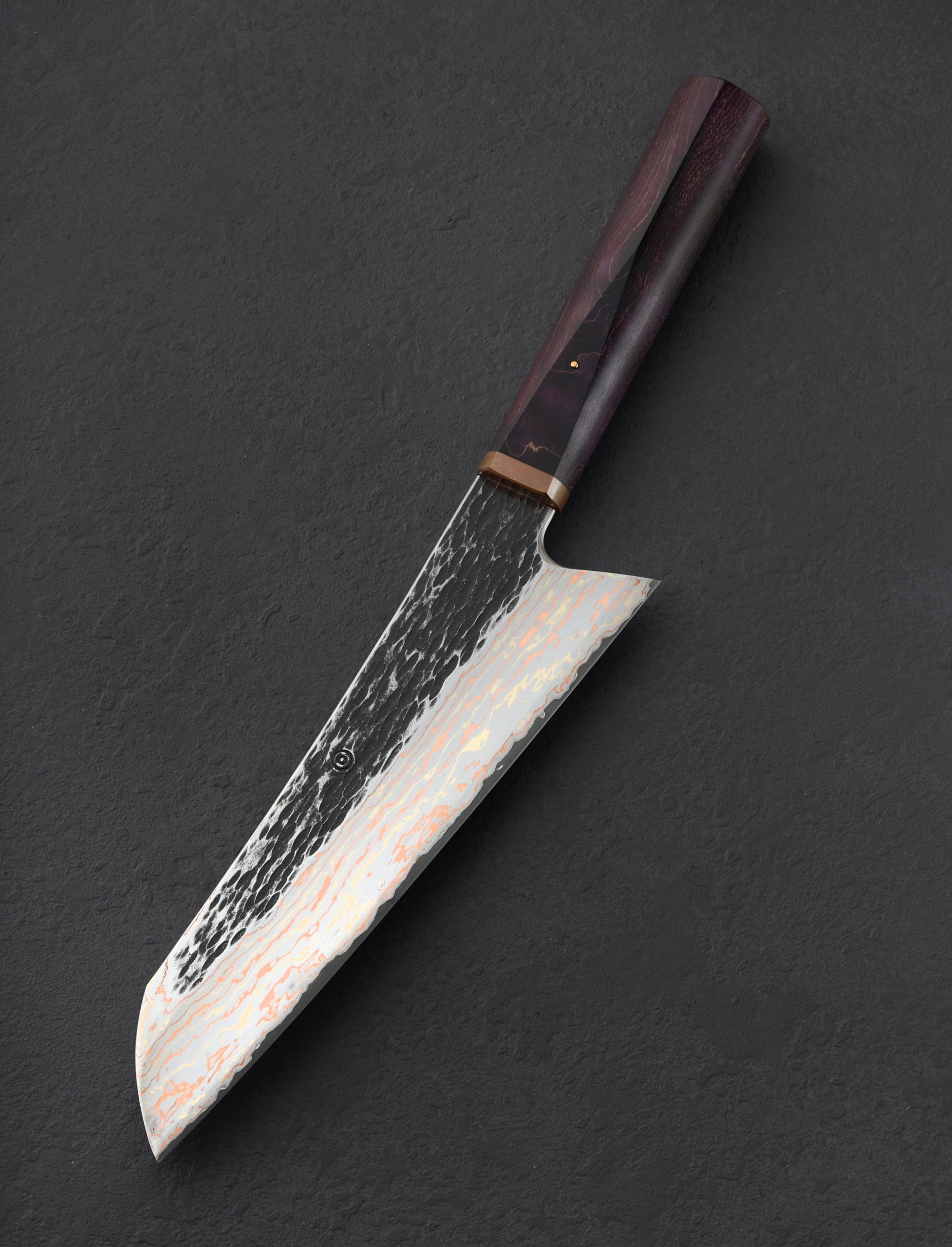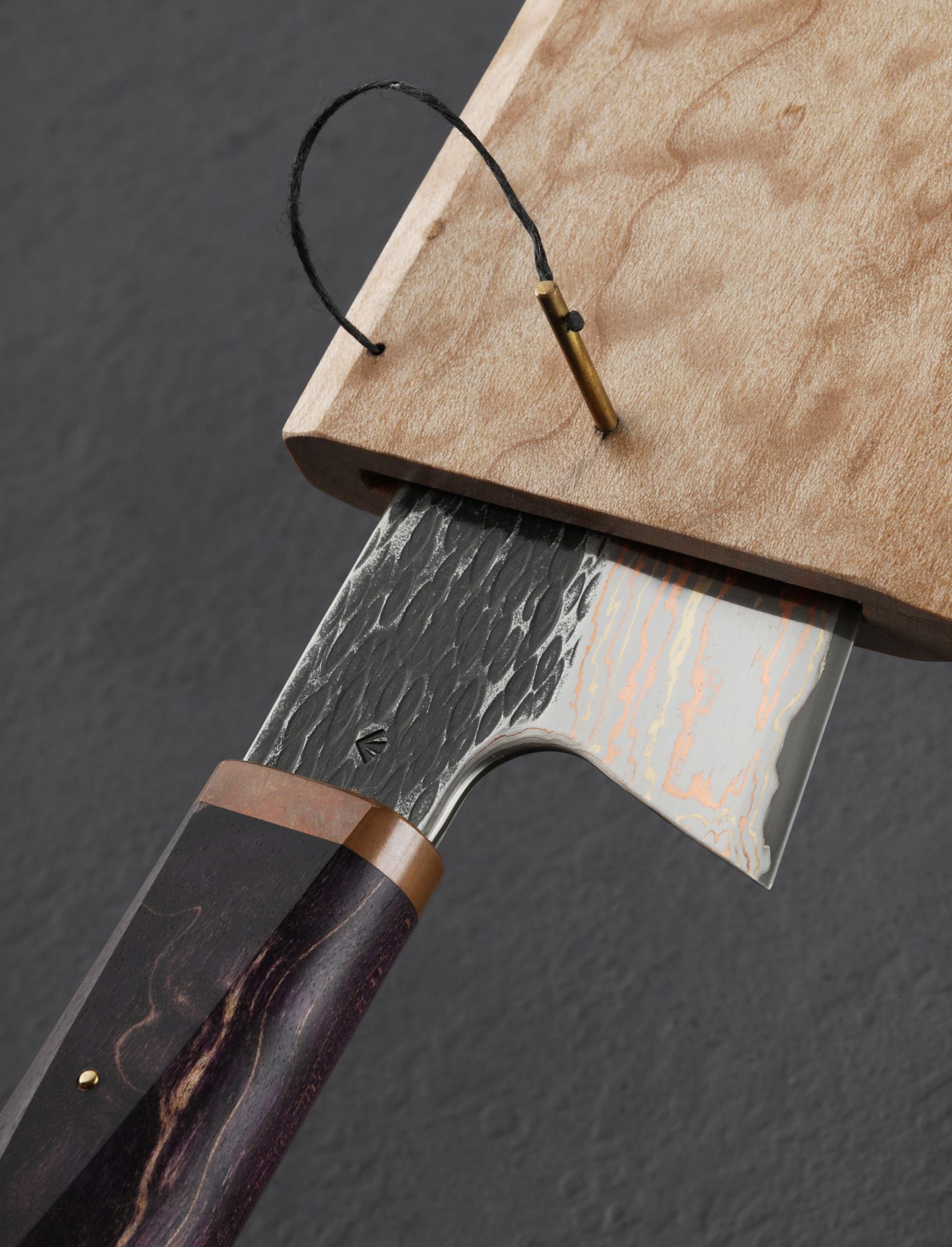 A show-stopping piece from Australia, this pre-owned James Oatley chef knife was used for 2-3 test cuts only and has been cleaned and polished to make available here in exquisite, like-new condition. The 215mm / 8.5″ blade is hand-forged from stainless, brass, and copper damascus-clad VToku-2 carbon steel featuring textured, forge-finished flats above high-polish bevels. A rounded spine tapers only slightly, providing strength, toughness, and weight that powers a thin, hard, razor-sharp edge below James’ superb convex ‘S-grind’ bevel geometry that stretches from the blade’s heel to a slim, needle-like tip. The edge profile is suited to push-pull cutting while also rocking nicely on the board, and the 64mm tall heel height positions this is a large tool to handle the biggest cuts in the kitchen. In his well-loved, simple, and comfortable style, James has sculpted two-tone maple into a symmetrical D-like shape that tapers toward the front where it is capped with a ferrule of solid copper. A domed brass pin allows for disassembly for care and maintenance. Includes is a custom maple saya with copper pin.