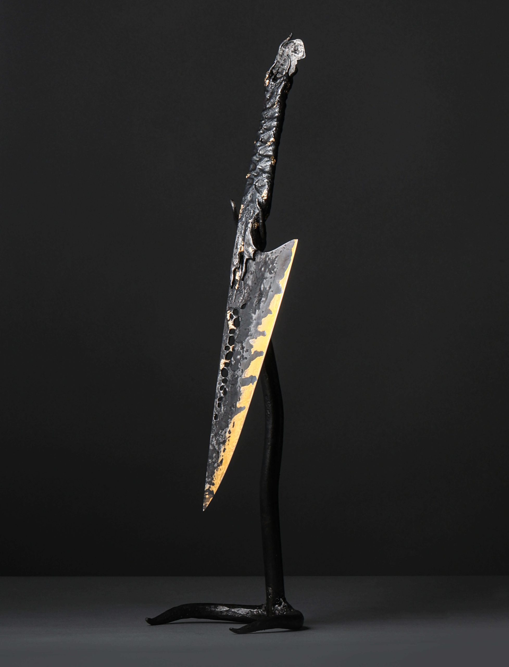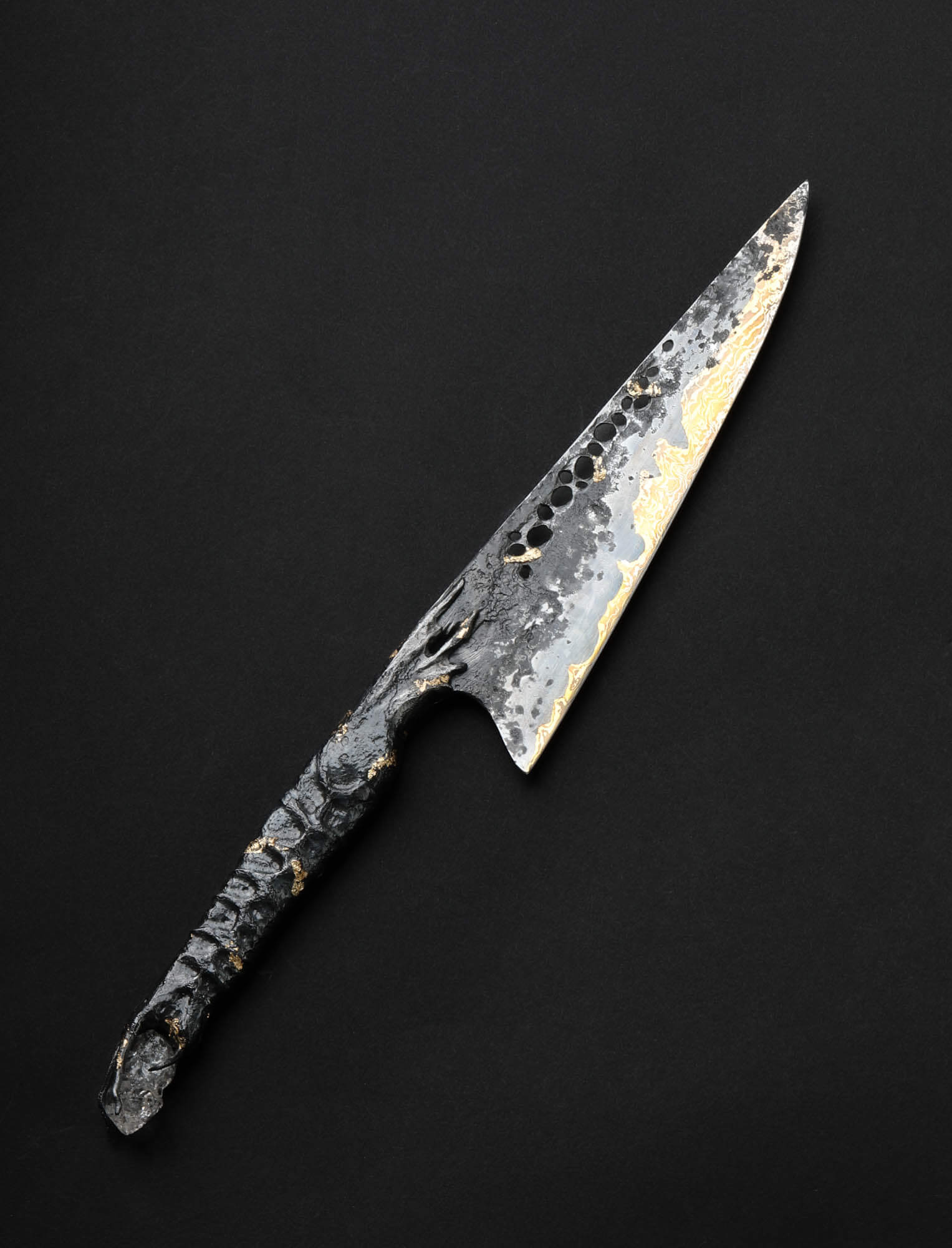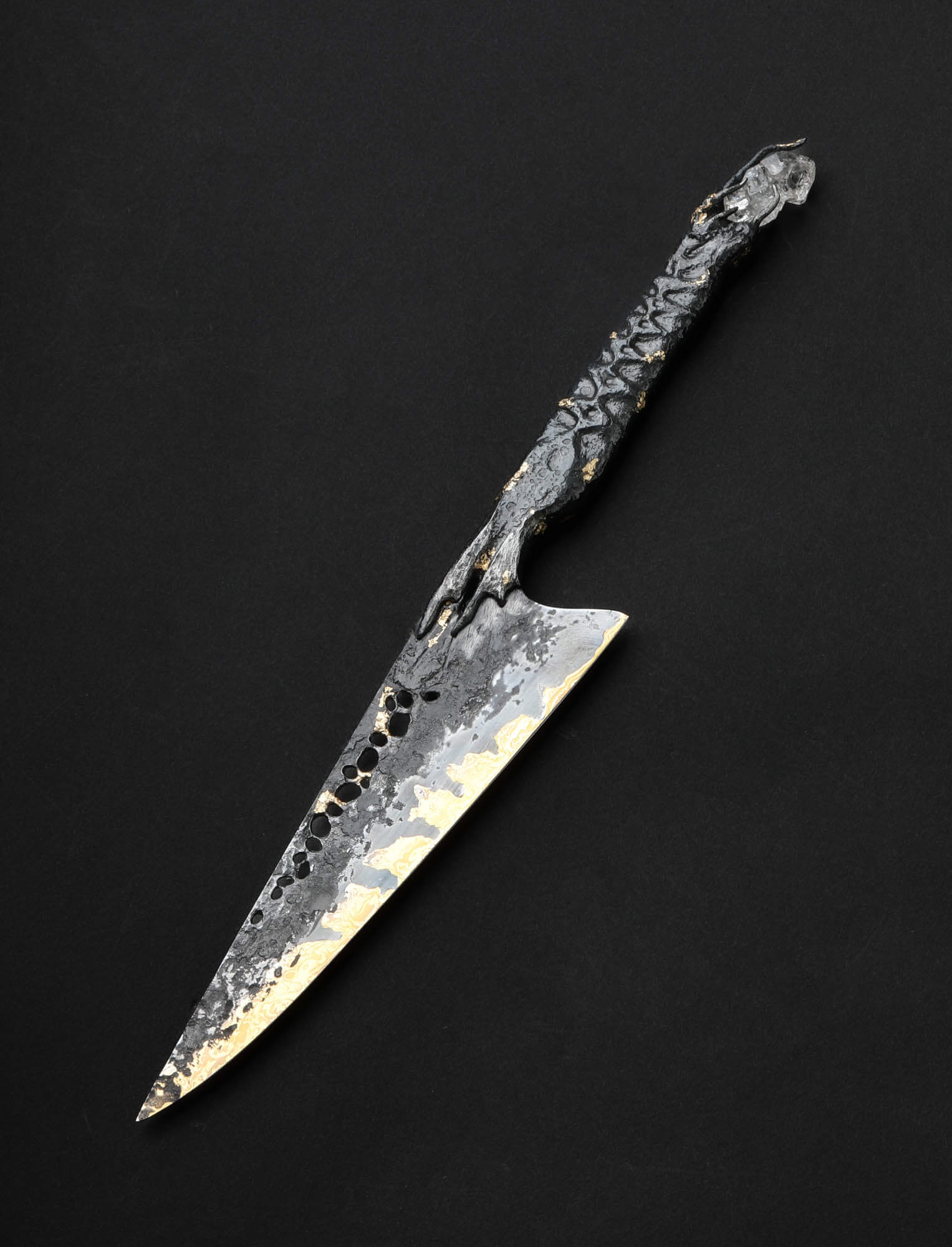 Idaho artist Tristan Dare’s contribution to The Art of Cutlery, a chef knife named “Olympus,” on show during summer 2024 in Tribeca, NYC, merges ancient meteorite, iron, and gold in the style for which this visionary young maker has become so admired. The blade is forged from a homemade damascus formula that combines two carbon steel alloys with material from the iron-rich Mounionalusta meteorite, one of the oldest to ever have been found on Earth. Gilded with pure 24k gold, both blade and iron handle are finished with a wrought aesthetic that seems to mimic the surface of a far-off world. Set into the end of the handle is a carved piece of quartz. A forged iron table-top display stand presents the knife. Sharpened and refined for culinary use, the blade is crafted for function.
