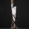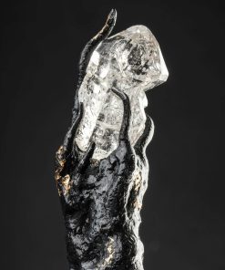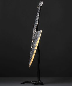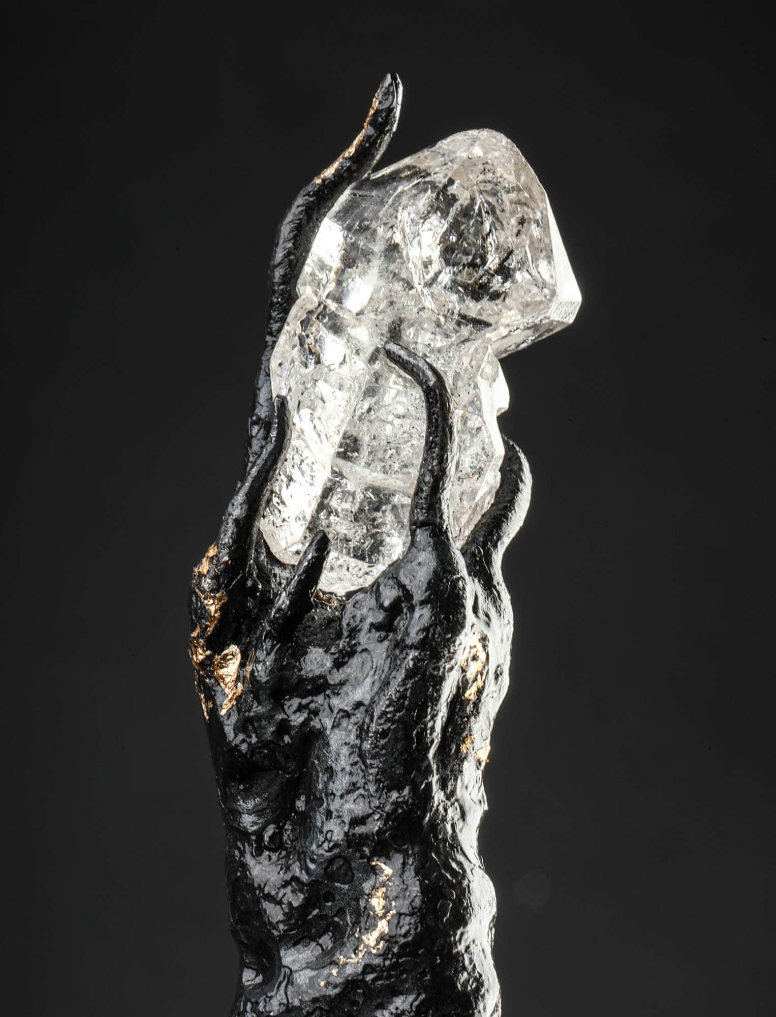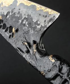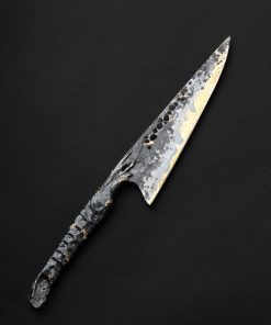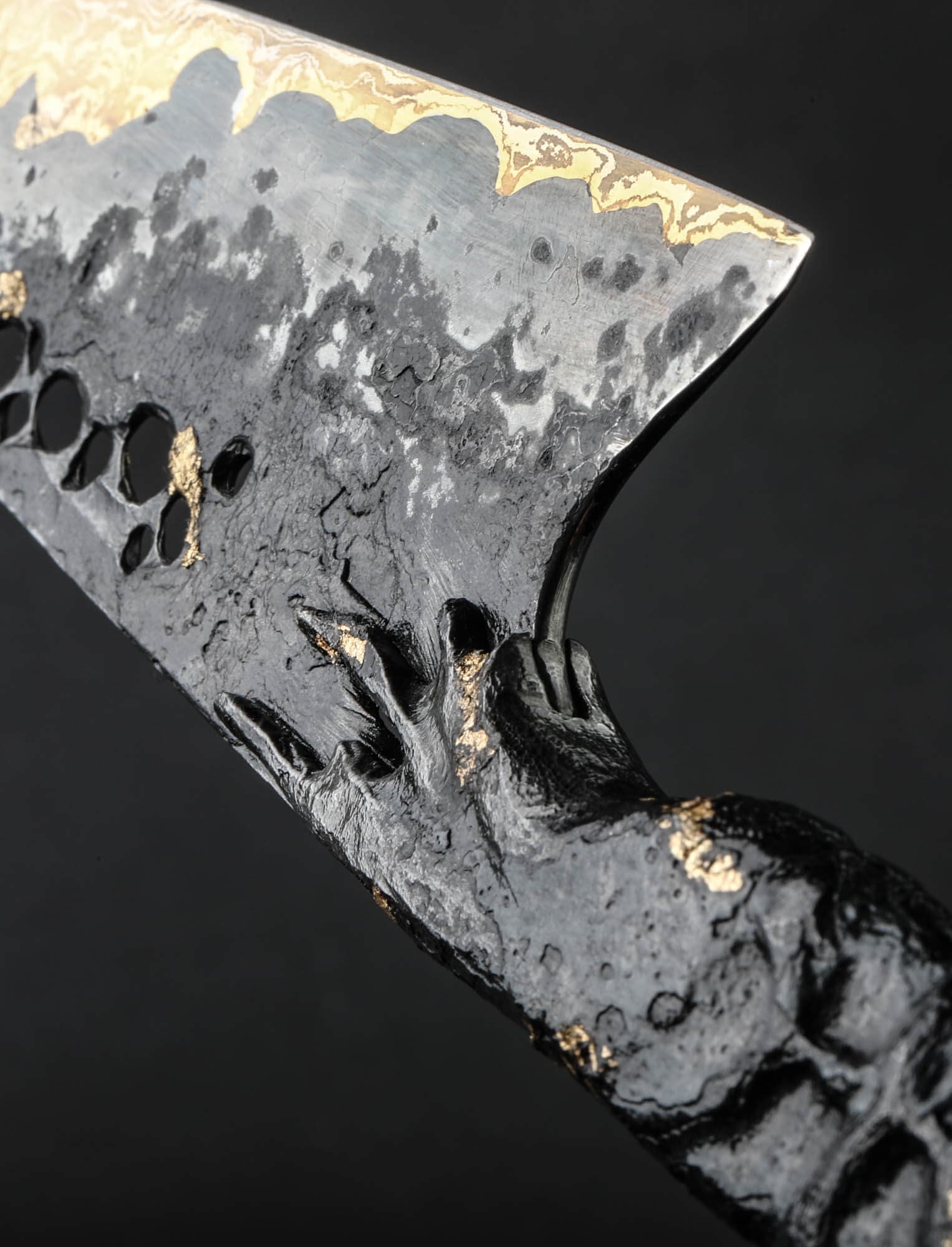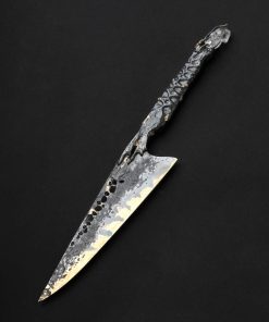 Idaho artist Tristan Dare’s contribution to The Art of Cutlery, a chef knife named “Olympus,” on show during summer 2024 in Tribeca, NYC, merges ancient meteorite, iron, and gold in the style for which this visionary young maker has become so admired. The blade is forged from a homemade damascus formula that combines two carbon steel alloys with material from the iron-rich Mounionalusta meteorite, one of the oldest to ever have been found on Earth. Gilded with pure 24k gold, both blade and iron handle are finished with a wrought aesthetic that seems to mimic the surface of a far-off world. Set into the end of the handle is a carved piece of quartz. A forged iron table-top display stand presents the knife. Sharpened and refined for culinary use, the blade is crafted for function.