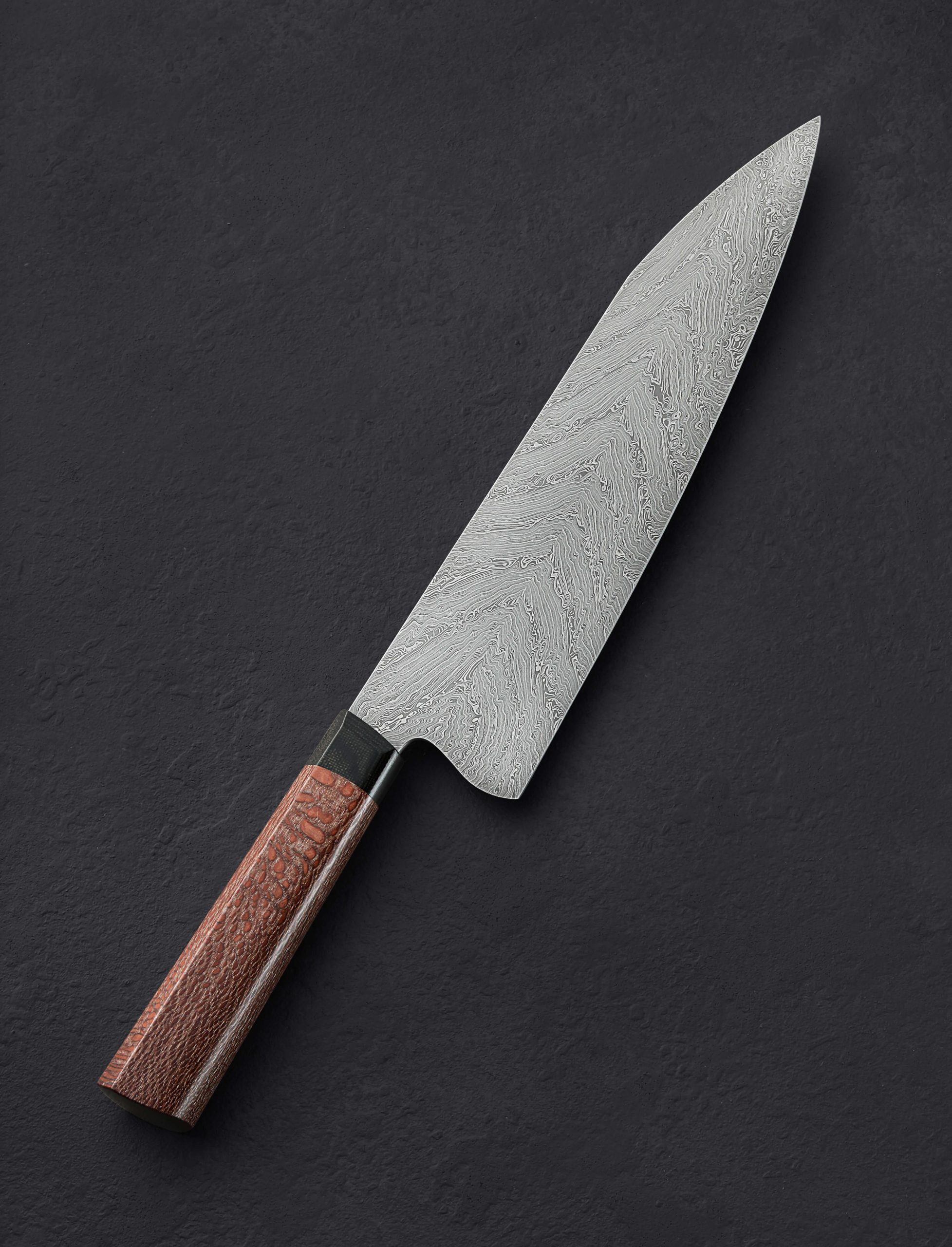 A full-size chef knife handmade by Peter Swarz-Burt to fill the cook’s hand, heart, and belly. From its beautifully honed edge geometry, thin and convex, to the forward-leaning balance point an inch in front of the blade’s heel for effortless cuts, to the outstanding finish and beauty of Peter’s two-bar mosaic carbon damascus steel, this piece will easily become the go-to workhorse in any kitchen. The mid-height bevels and full-distal taper along the blade’s spine result in a versatile tool that combines finesse and toughness wonderfully, suited to demanding chopping work and detail cuts with the tip in the same breath. With Eastern gyuto inspiration, from the relatively low tip (in spite of a nicely curved edge profile, possible due to its overall length) for precision slices, to the comfortable, tapering shield-style wa handle, Peter ensures the knife will suit almost every grip and cutting style. To wield this one-of-a-kind work, macadamia wood with blade micarta provides a welcoming, tactile experience at the cutting board with looks to match.