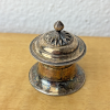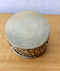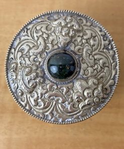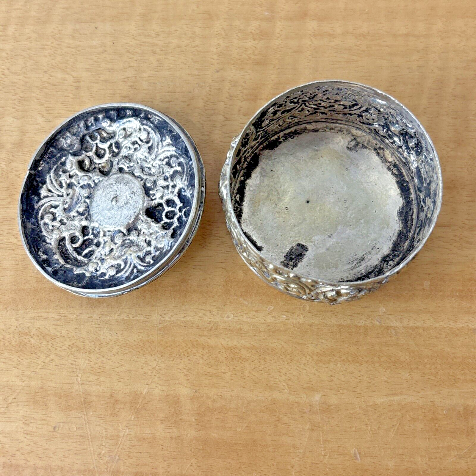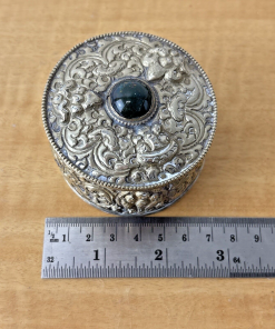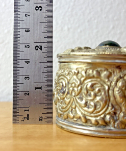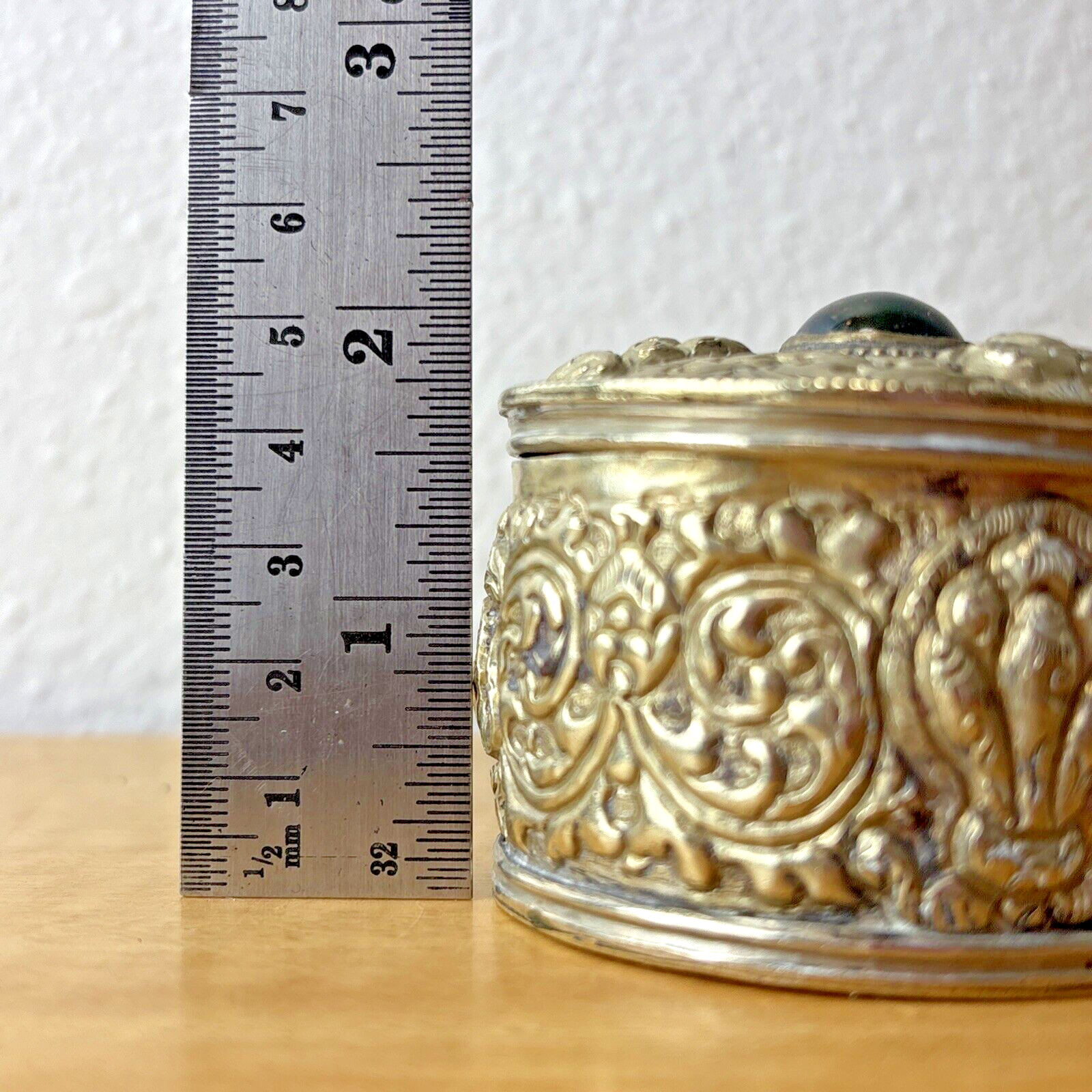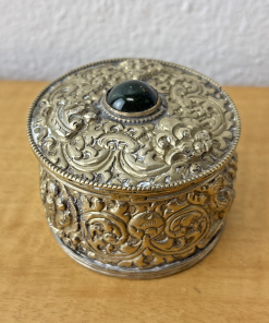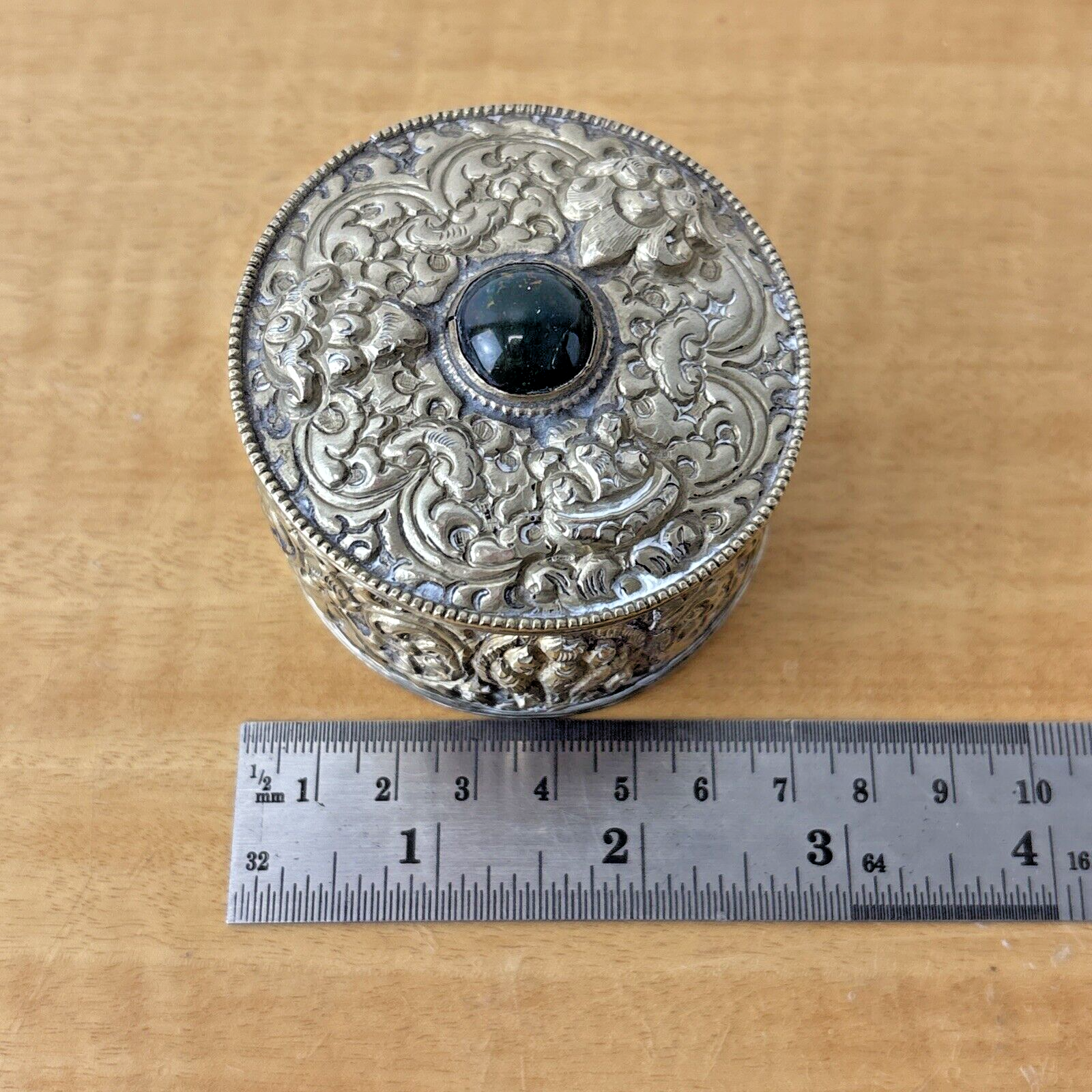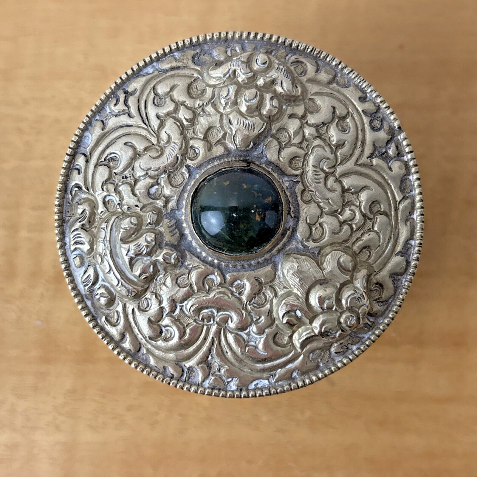 Ornate Round Silver/Gold Metal Trinket Jewelry/Pill Box Vintage With Green Rock