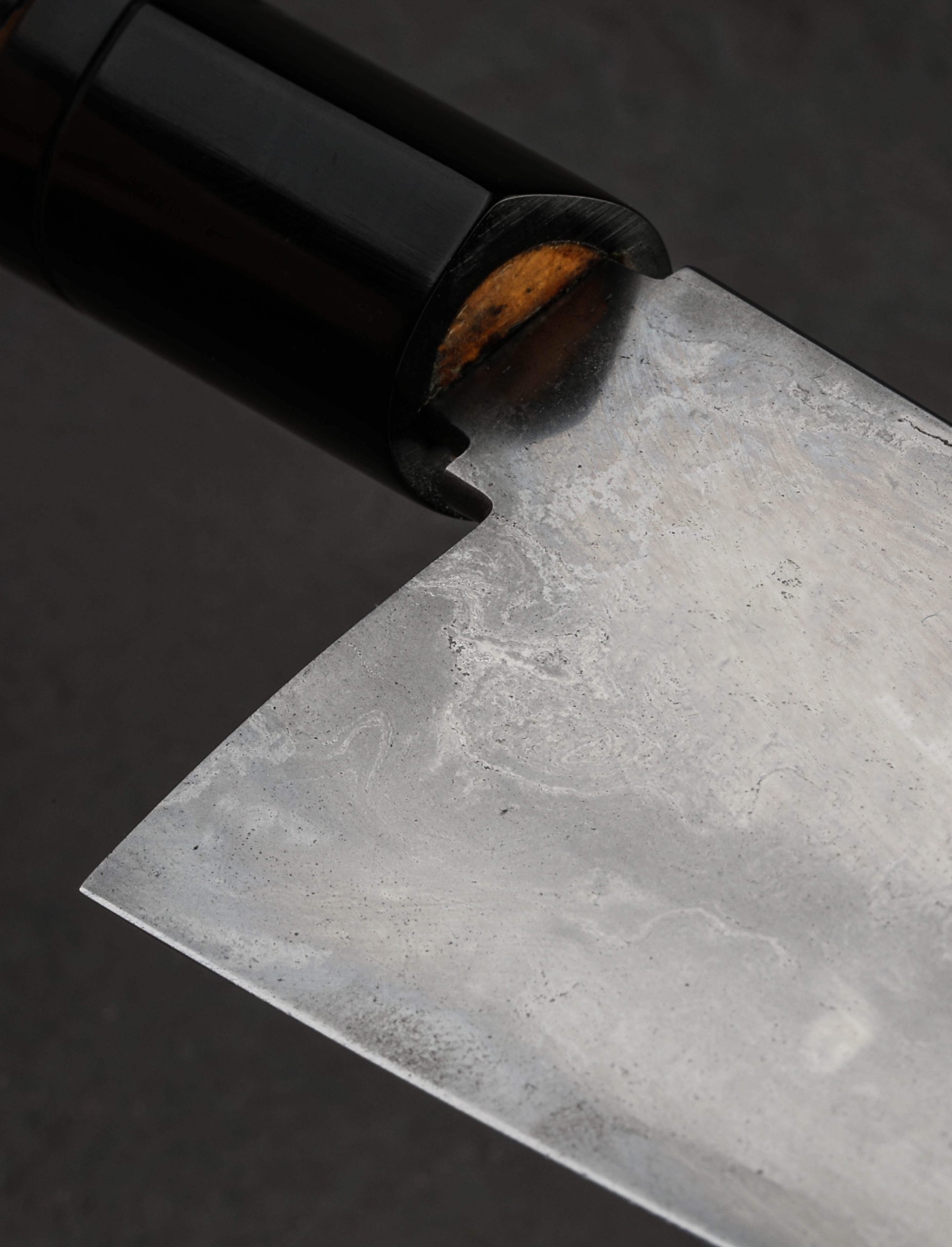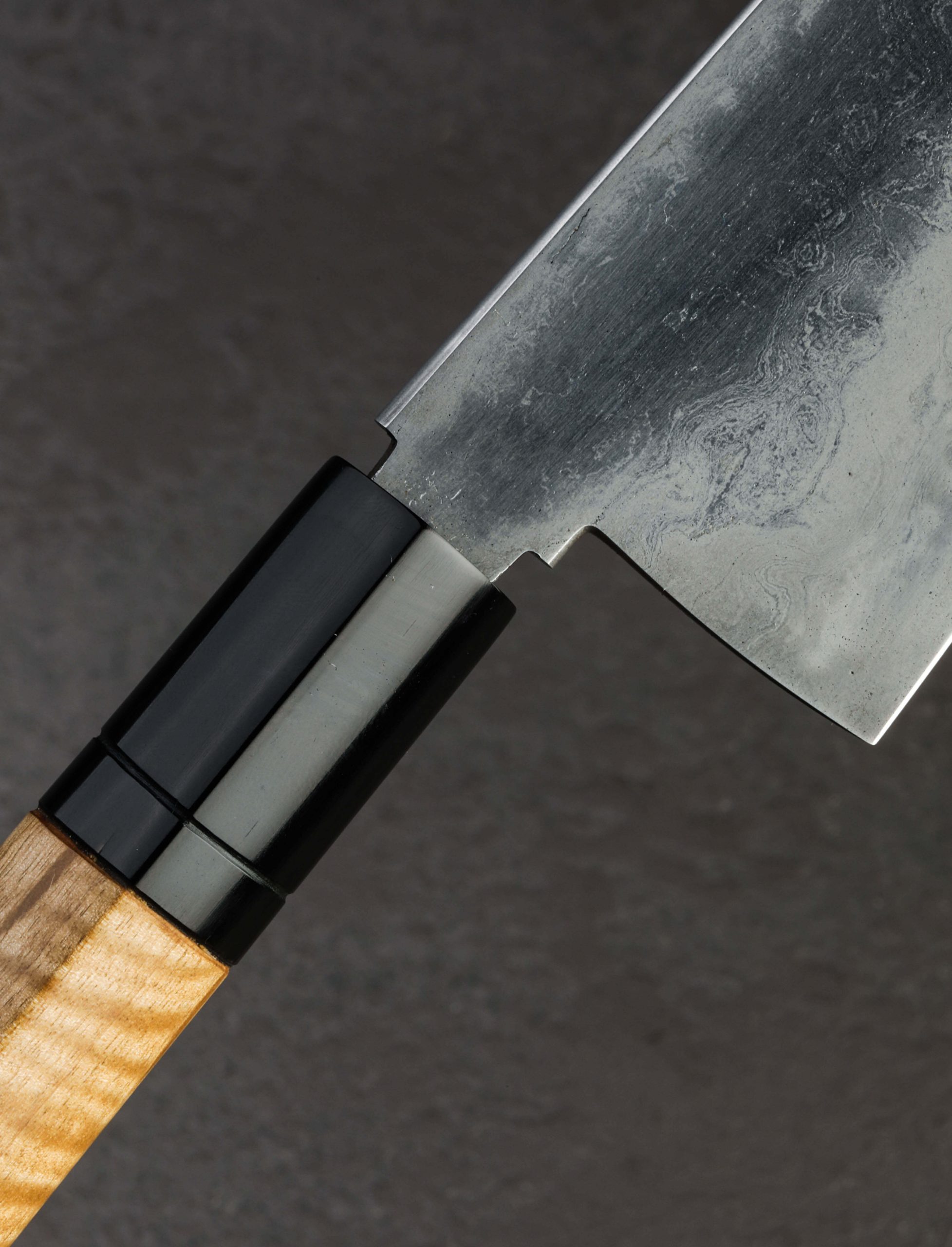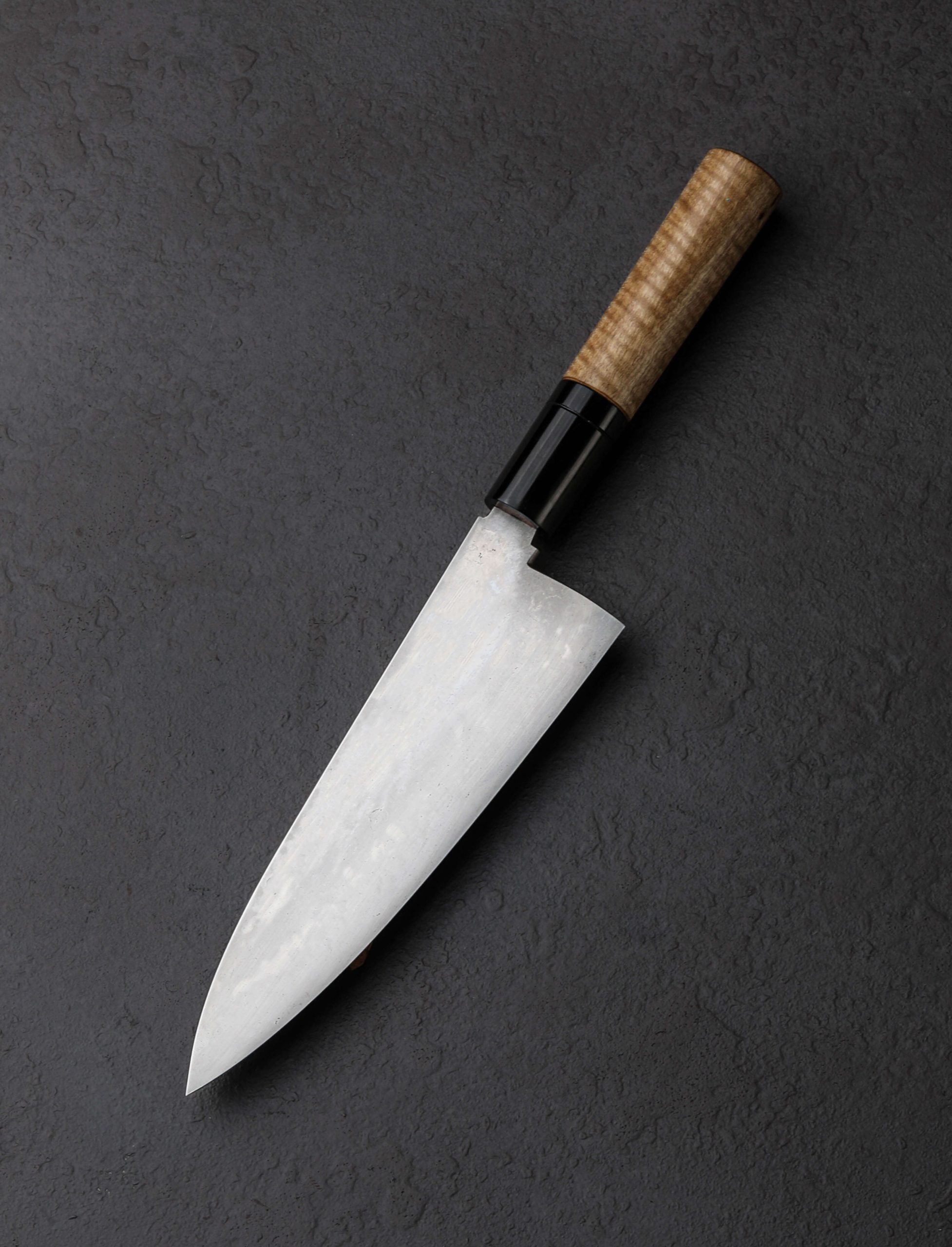 Many knives are easy to pick up. This petty chef by Emiliano Carrillo is hard to put down. Forged by hand from oroshigane carbon steel which Emiliano makes in small batches using a homemade furnace at his New Jersey studio, the 150mm / 5.9″ blade is stunning and versatile from tip to heel. Superbly honed, symmetrical convex bevels are polished and etched to reveal the 12 folds of the steel, the differential, water-quenched hardening, and the beautiful, damascus-like alloy banding. Standing 45mm tall at the heel with a rounded spine measuring a full 4.1mm wide out of the handle, the blade is weighted and tough, ideal for all manner of daily meal preparation in a compact profile. The near-zero edge is razor sharp and quite thin, culminating at a needle-like tip positioned perfectly for precision slicing and detailed cuts. A simple D-shaped wa handle for right handed chefs provides comfort and control, sculpted from crepe myrtle wood and capped with a carved bolster of buffalo horn. True to his focus on traditional craftsmanship and use of clean, high-quality, small-batch steels, Emiliano delivers yet another heirloom chef’s knife to pass down through the generations.