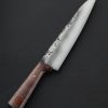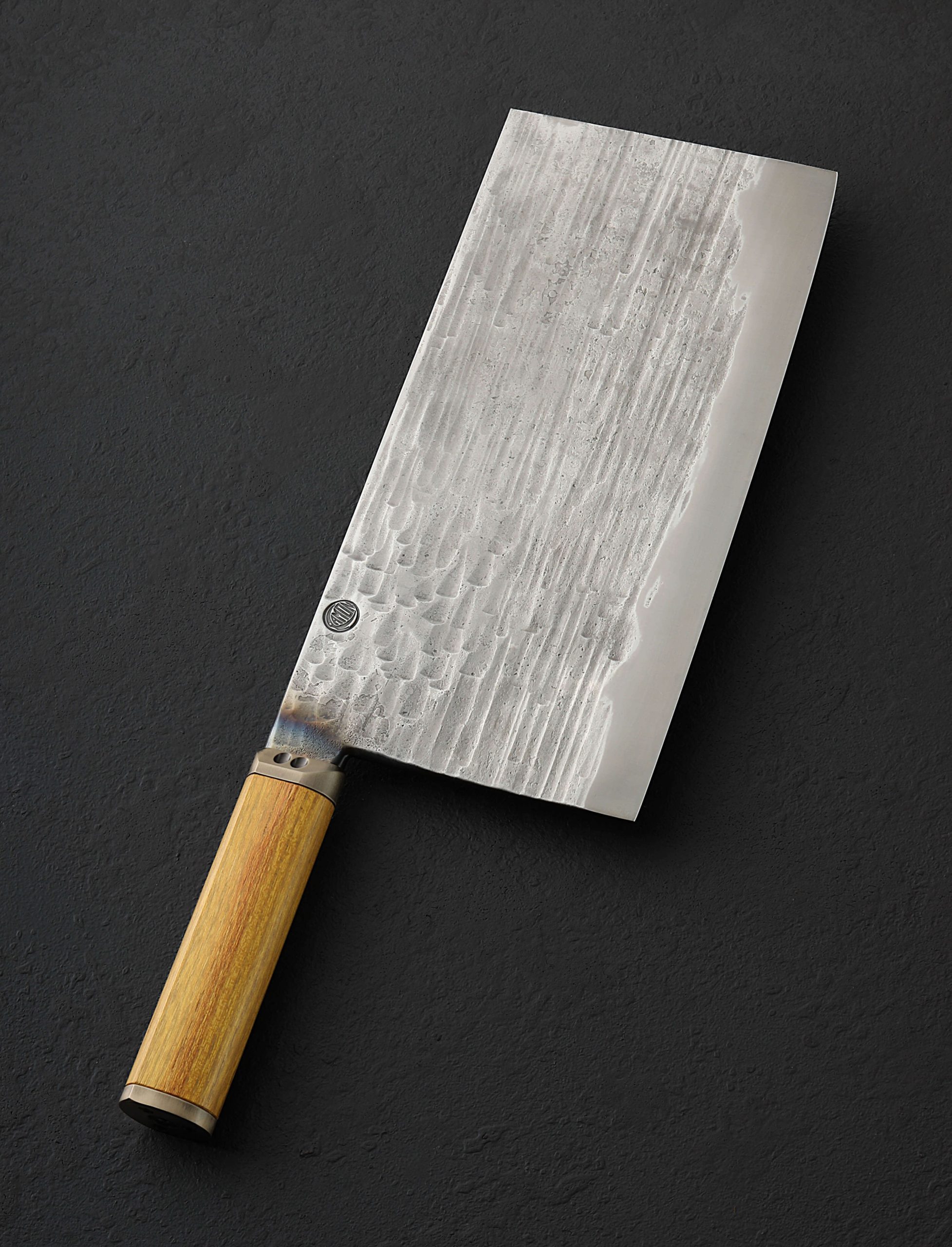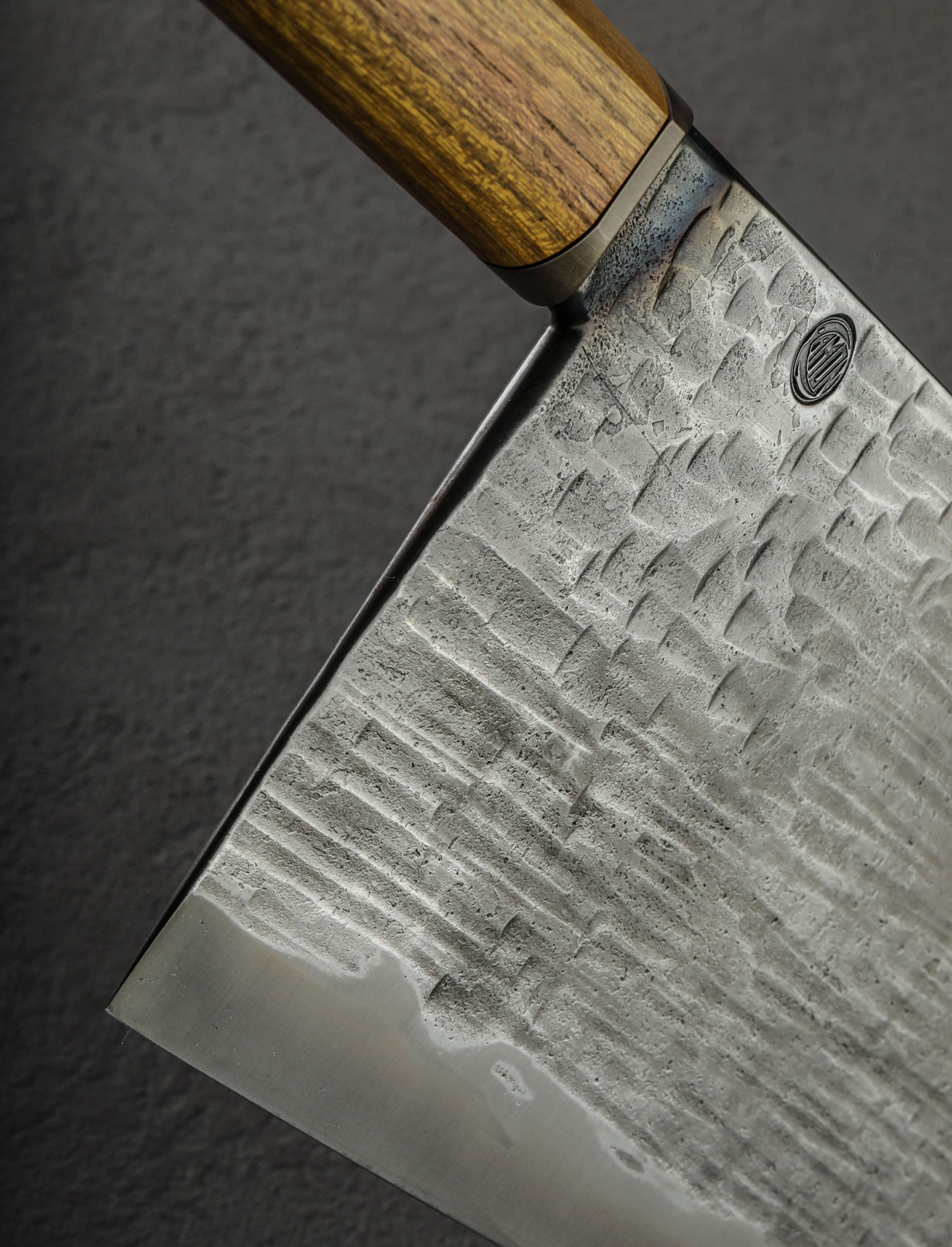 Forged by hand at his studio north of Vienna from ApexUltra carbon steel, Benjamin Kamon crafts a Chinese cleaver that is anything but ordinary. Standing an eye-popping 110mm tall, Benjamin has hardened the high-performance ApexUltra blade steel, developed in large part by fellow Austrian metalsmith and Eatingtools artist Tobias Hangler, to a whopping 67 HRC on the Rockwell hardness scale. Thin below short, slightly convex bevels, the 205mm / 8.1″ edge is razor sharp, allowing the 15.4oz / 438g overall package to move effortlessly downward through anything between it and the cutting board. Benjamin’s Wave texturing along the flats and an oil-slick etch below a nicely rounded spine give this short-neck vegetable cleaver the unmistakable look of a classic Kamon tool. To manipulate this extraordinary build is a D-shape osage orange wa handle with titanium Torpedo-style end caps with a brushed bronze finish. Removable via a retention bold nut at the rear, care and maintenance of the knife and handle are a breeze. A custom saya is included.