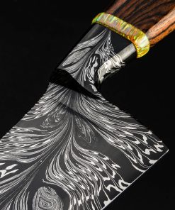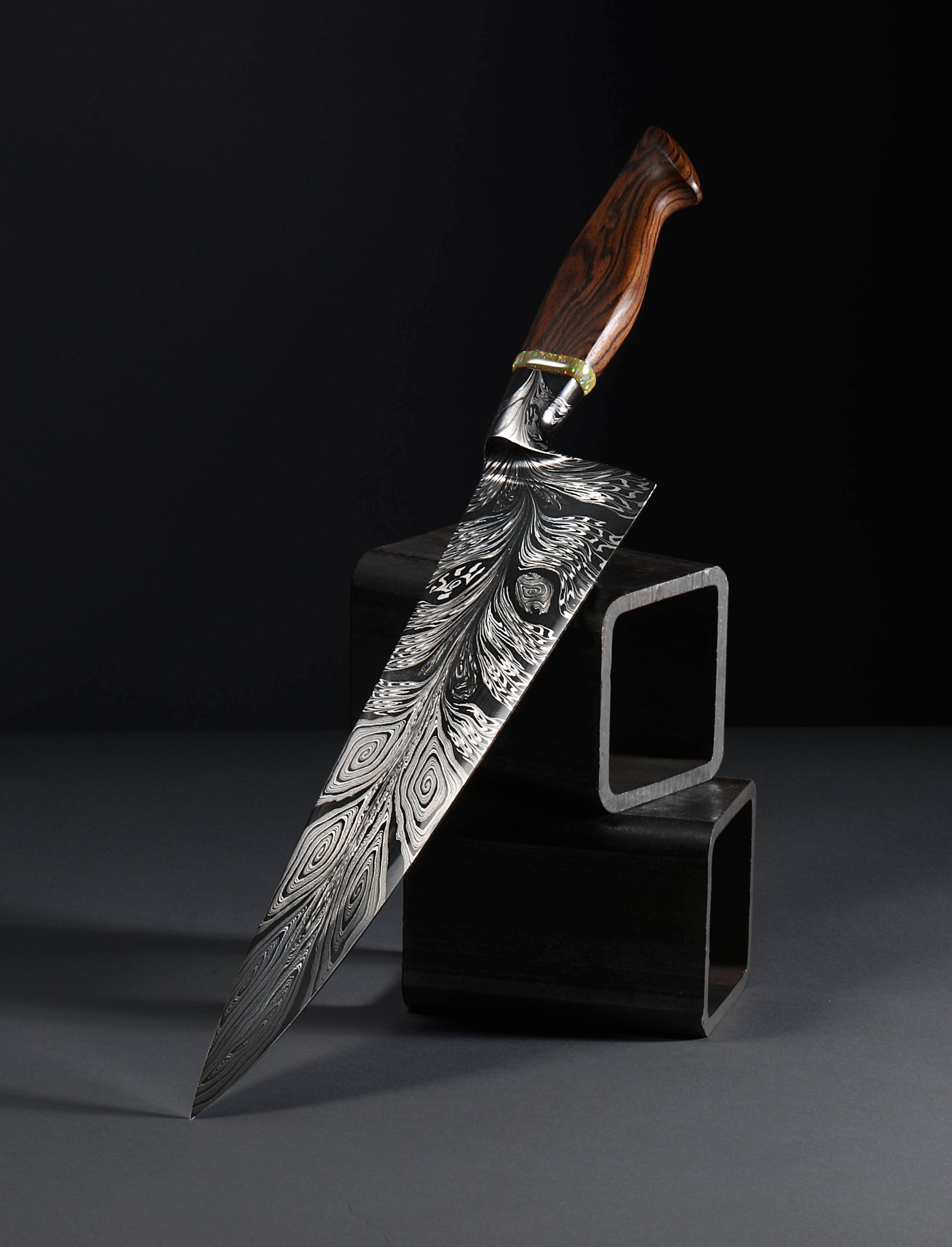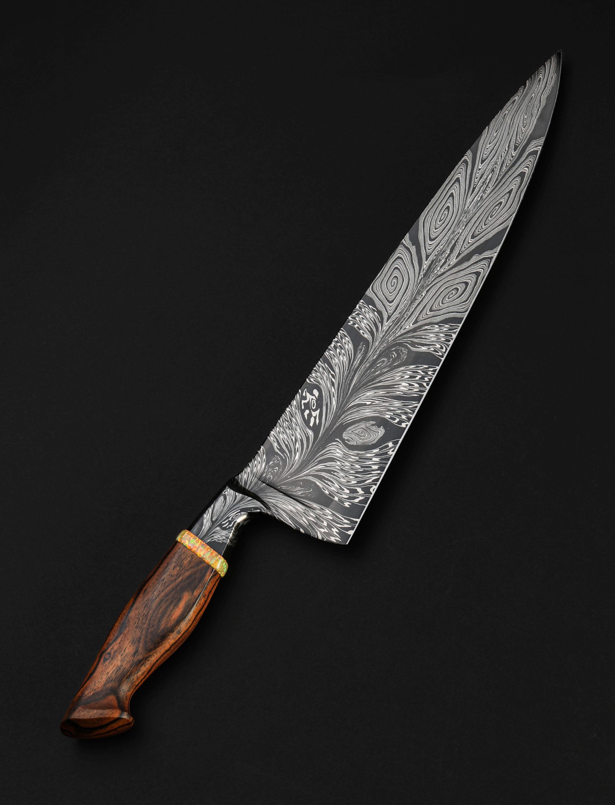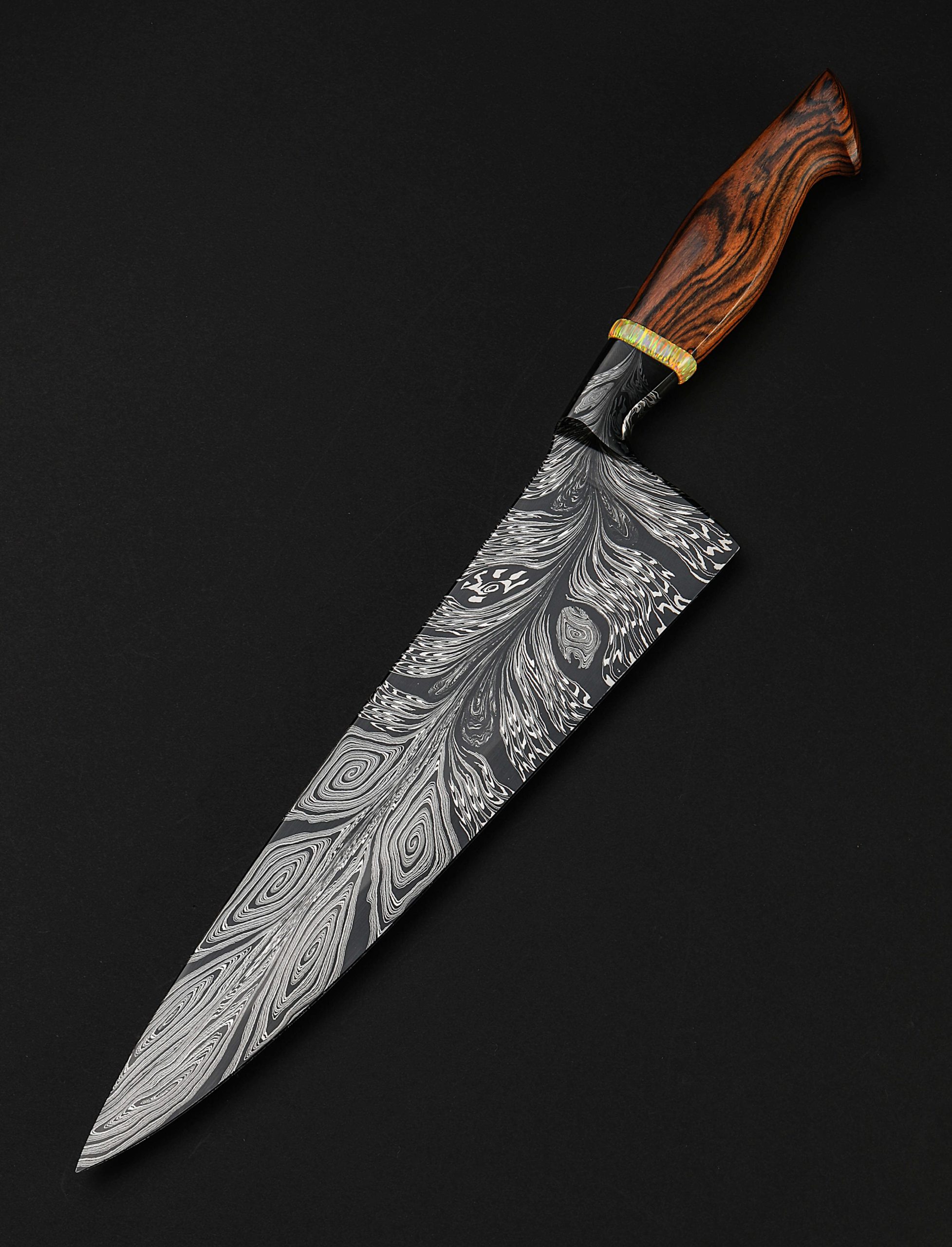 Rhode Island artist Joshua Prince’s contribution to The Art of Cutlery, a chef knife named “Peacock,” on show during summer 2024 in Tribeca, NYC, represents the maker’s eclectic eye, creative talents, and technical skills in an object that sacrifices neither form nor function. Forged from a feathered mosaic of varying damascus steel patterns of Joshua’s making, the blade features compound ‘S-grind’ bevel geometry in a versatile profile that reaches nearly 11″ in length. Beyond the blade’s choil, the damascus’s pattern condenses into the shape of the sculpted, integral handle bolster, through which the feathering concentrates, before appearing to be devoured by a ring of synthetic opal. To complete the sculpted, comfortable grip is a piece of carved bocote wood. This knife is razor-sharp and crafted for culinary use.