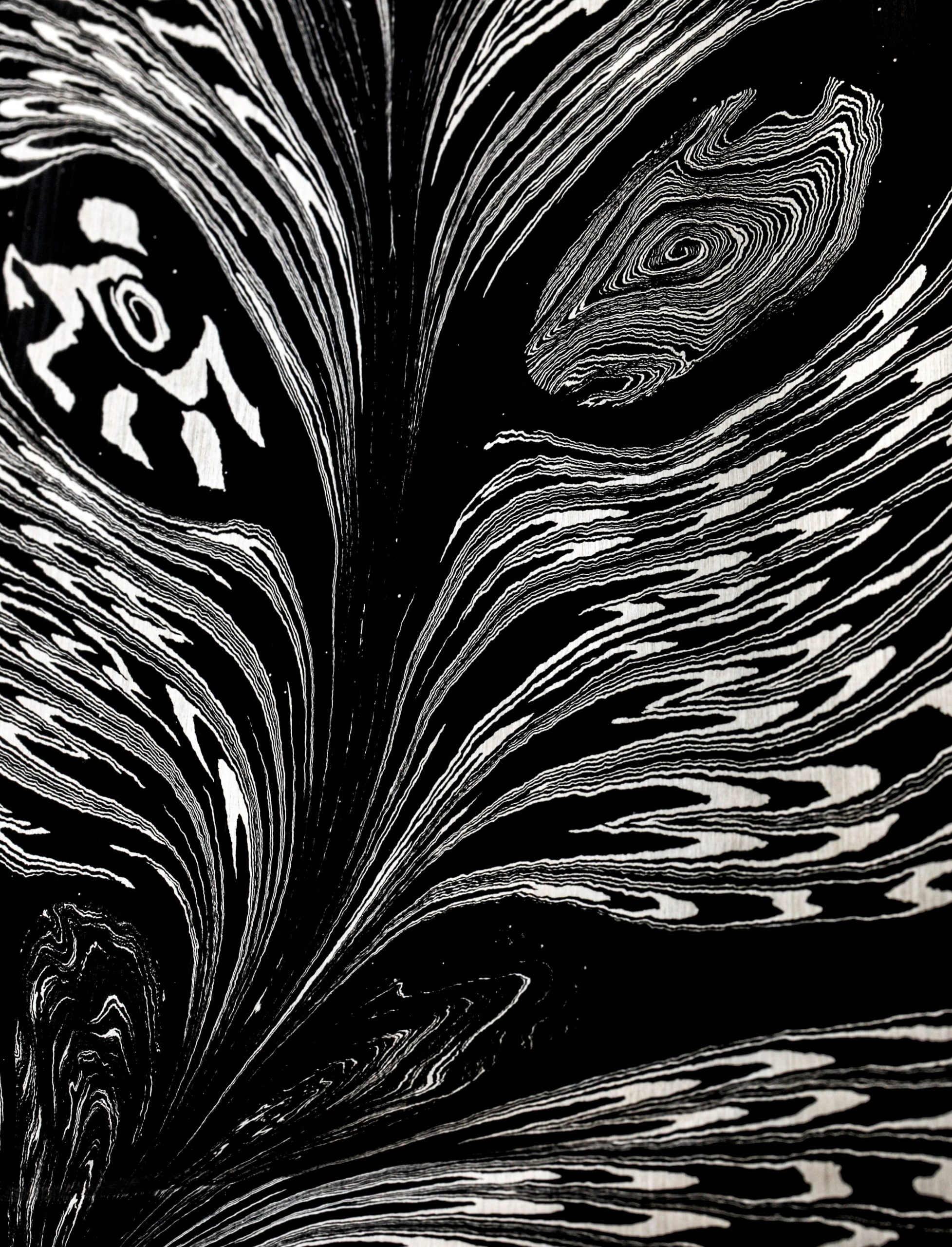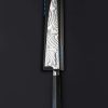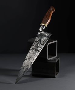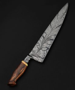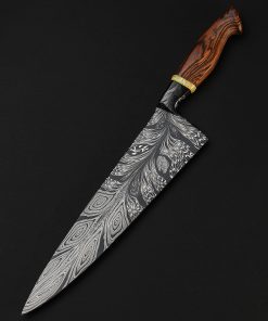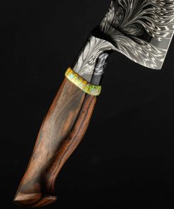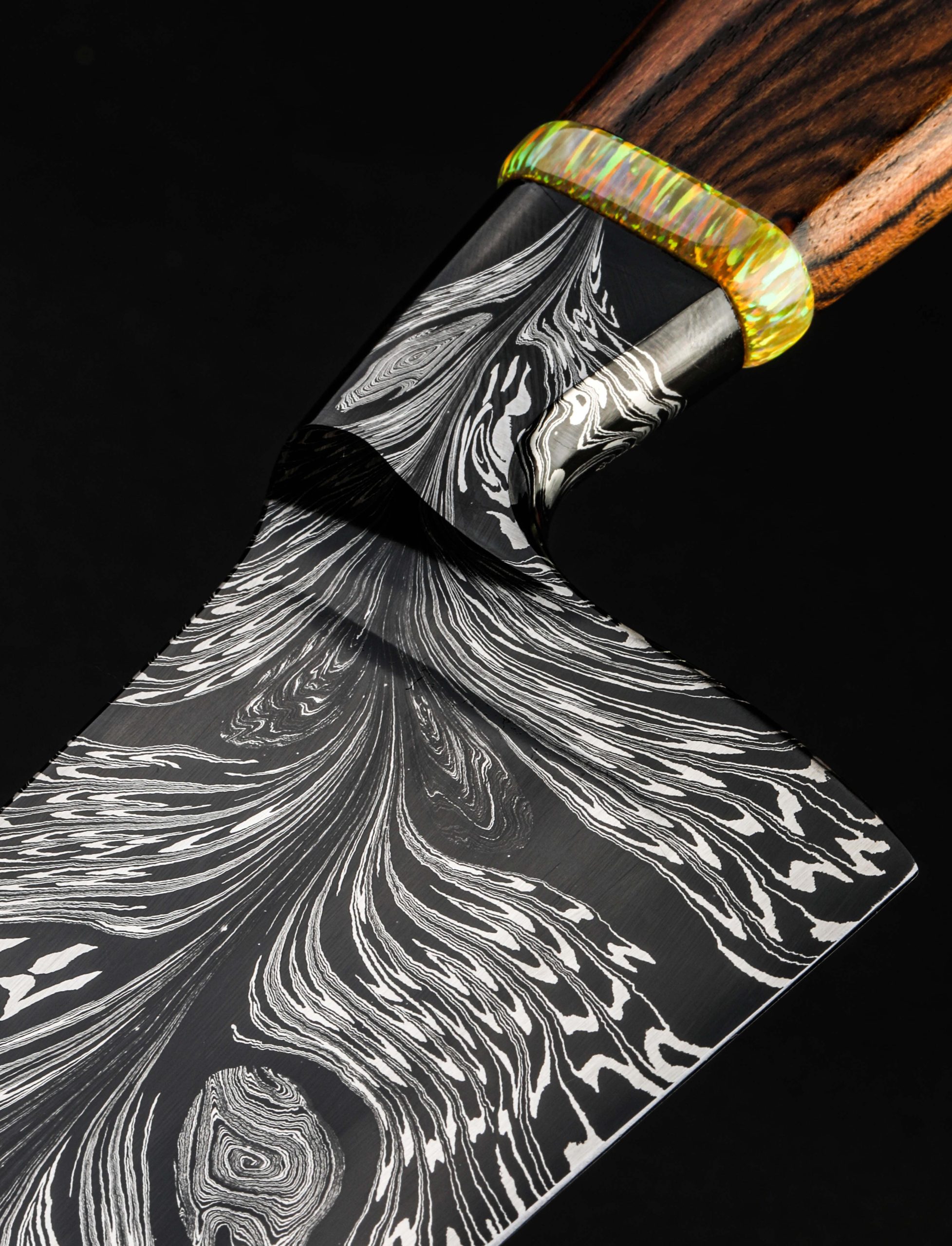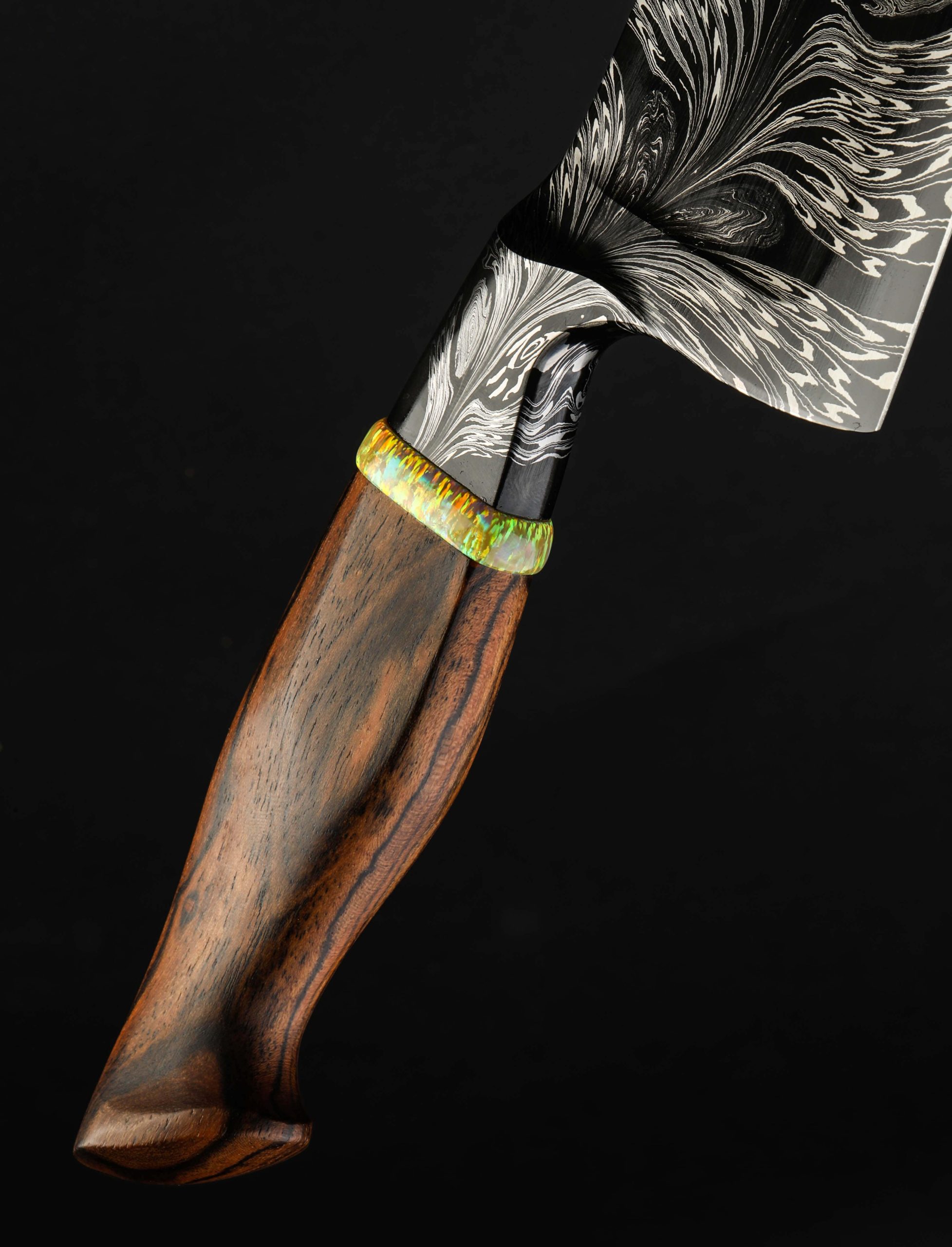 Rhode Island artist Joshua Prince’s contribution to The Art of Cutlery, a chef knife named “Peacock,” on show during summer 2024 in Tribeca, NYC, represents the maker’s eclectic eye, creative talents, and technical skills in an object that sacrifices neither form nor function. Forged from a feathered mosaic of varying damascus steel patterns of Joshua’s making, the blade features compound ‘S-grind’ bevel geometry in a versatile profile that reaches nearly 11″ in length. Beyond the blade’s choil, the damascus’s pattern condenses into the shape of the sculpted, integral handle bolster, through which the feathering concentrates, before appearing to be devoured by a ring of synthetic opal. To complete the sculpted, comfortable grip is a piece of carved bocote wood. This knife is razor-sharp and crafted for culinary use.